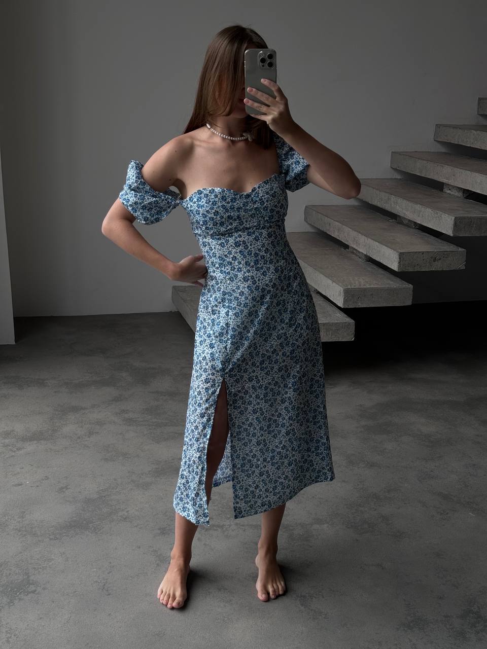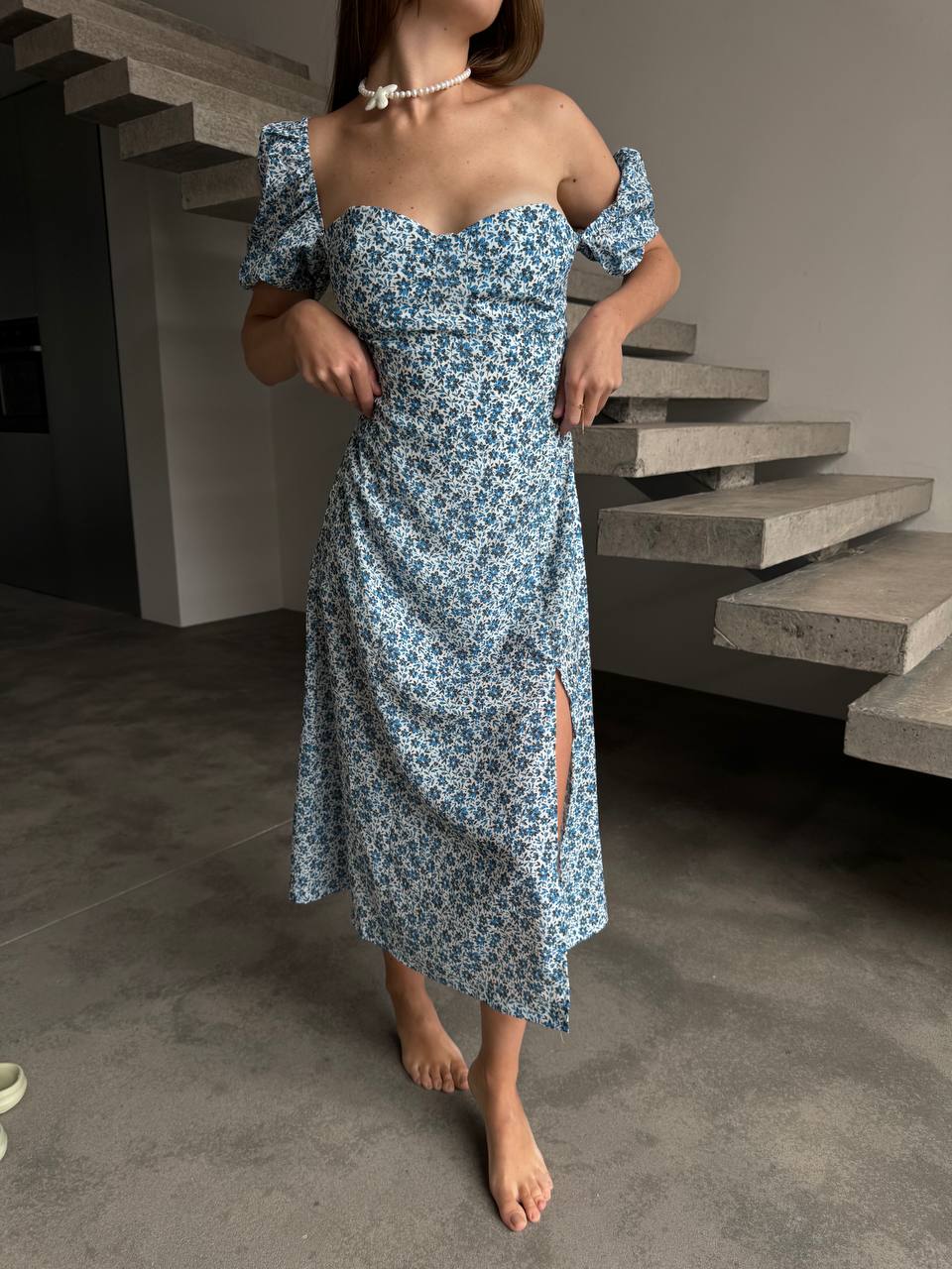Женское Голубое Платье Миди в Цветочный Принт с Короткими Рукавами и Фигурным Вырезом Декольте