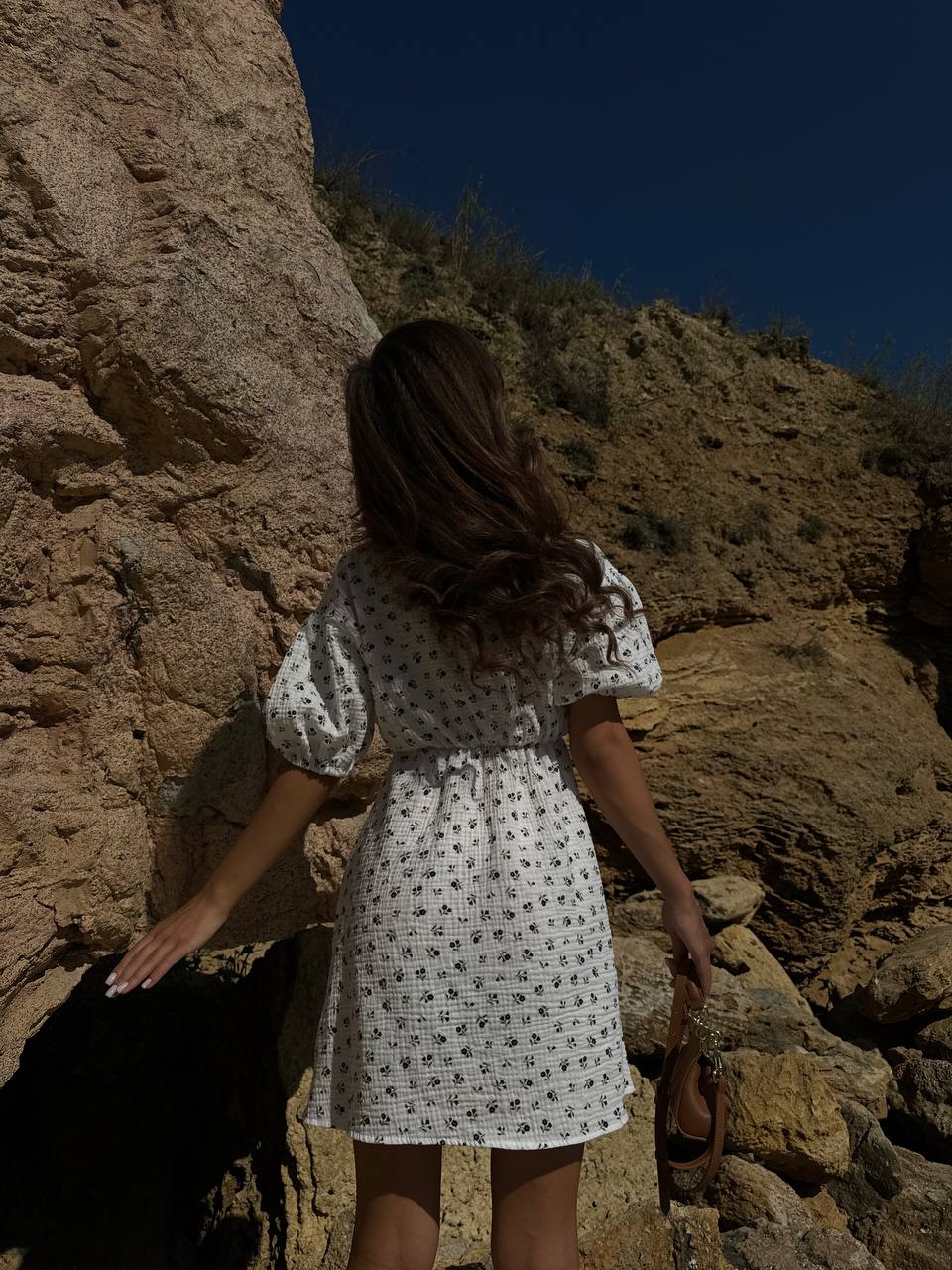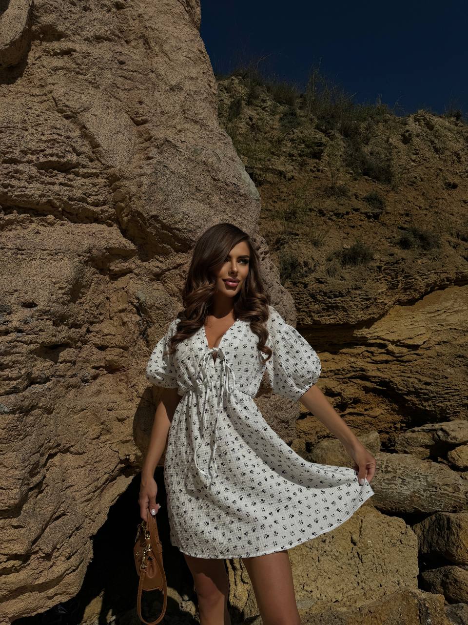 Женское Легкое Муслиновое Летнее Белое Платье Мини в Принт Мелкий Черный Цветочек