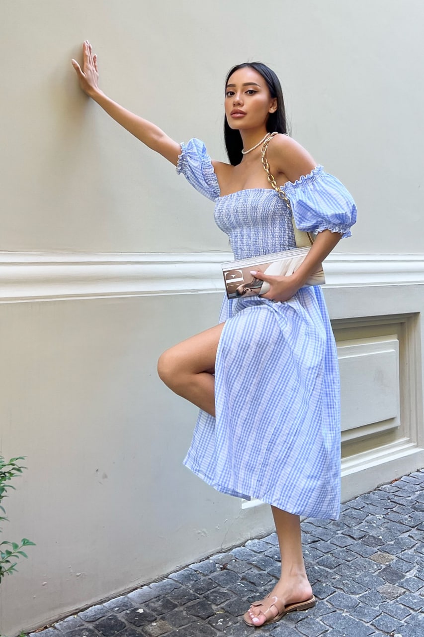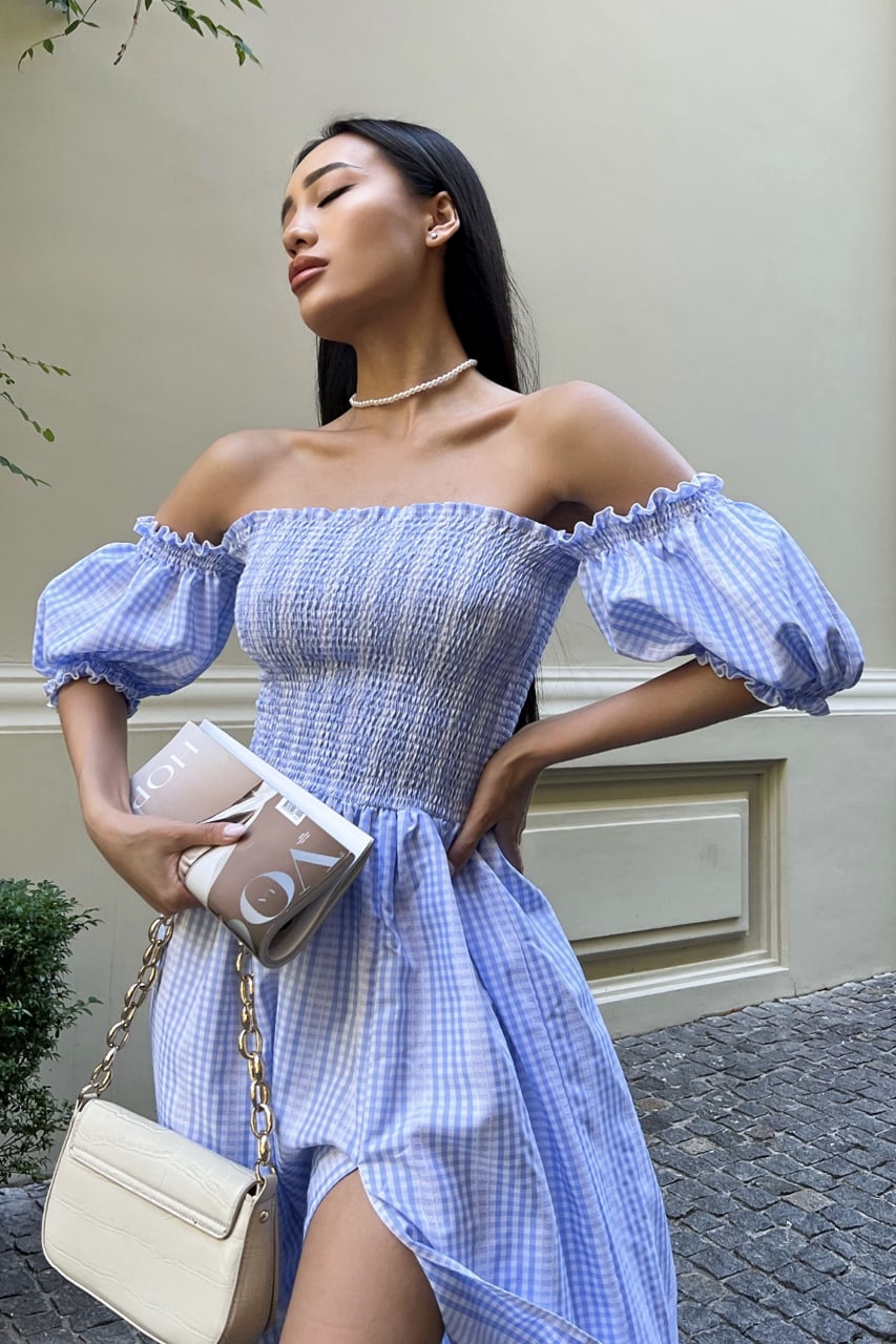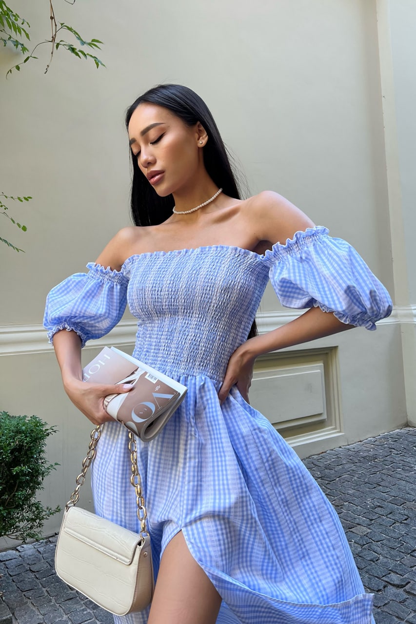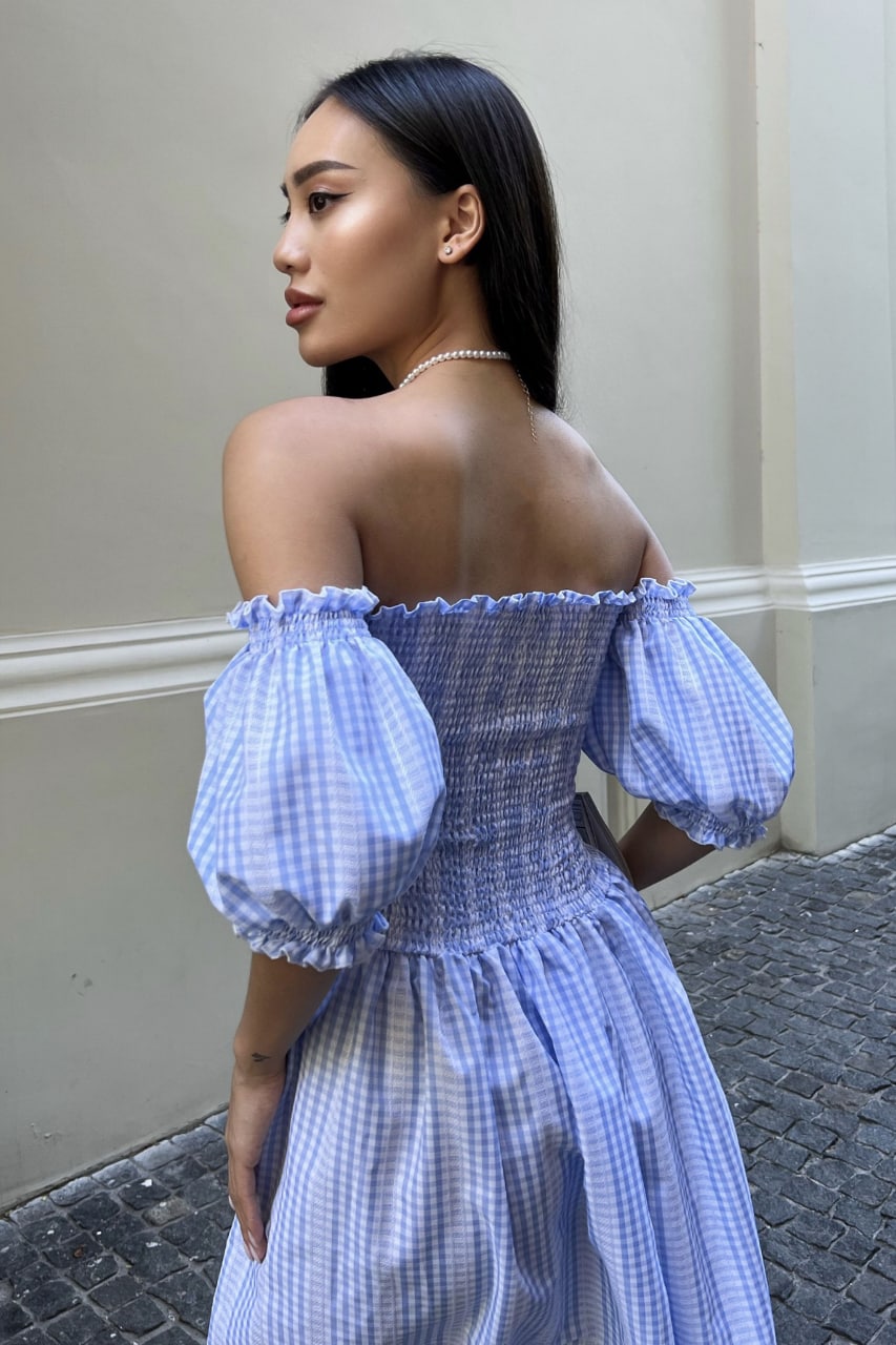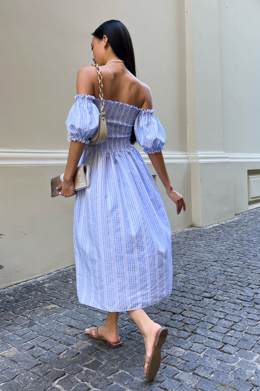 Женское Летнее Голубое Платье Джорджина Миди – на Резинке Сверху с Открытыми Плечами в Принт Узор