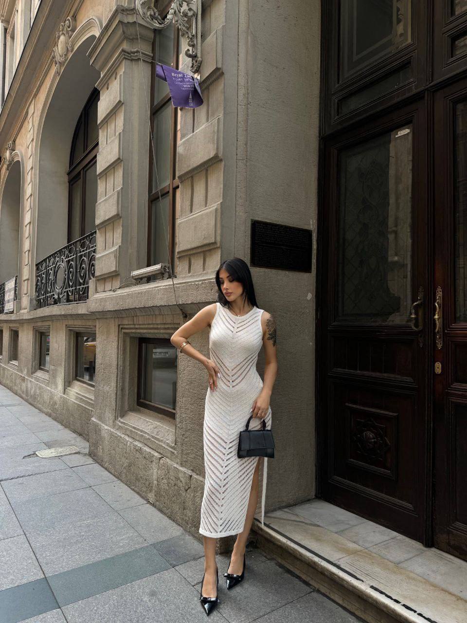 Женское Летнее Молочное Платье Миди – Ажурное без Рукавов с Разрезом на Ноге
