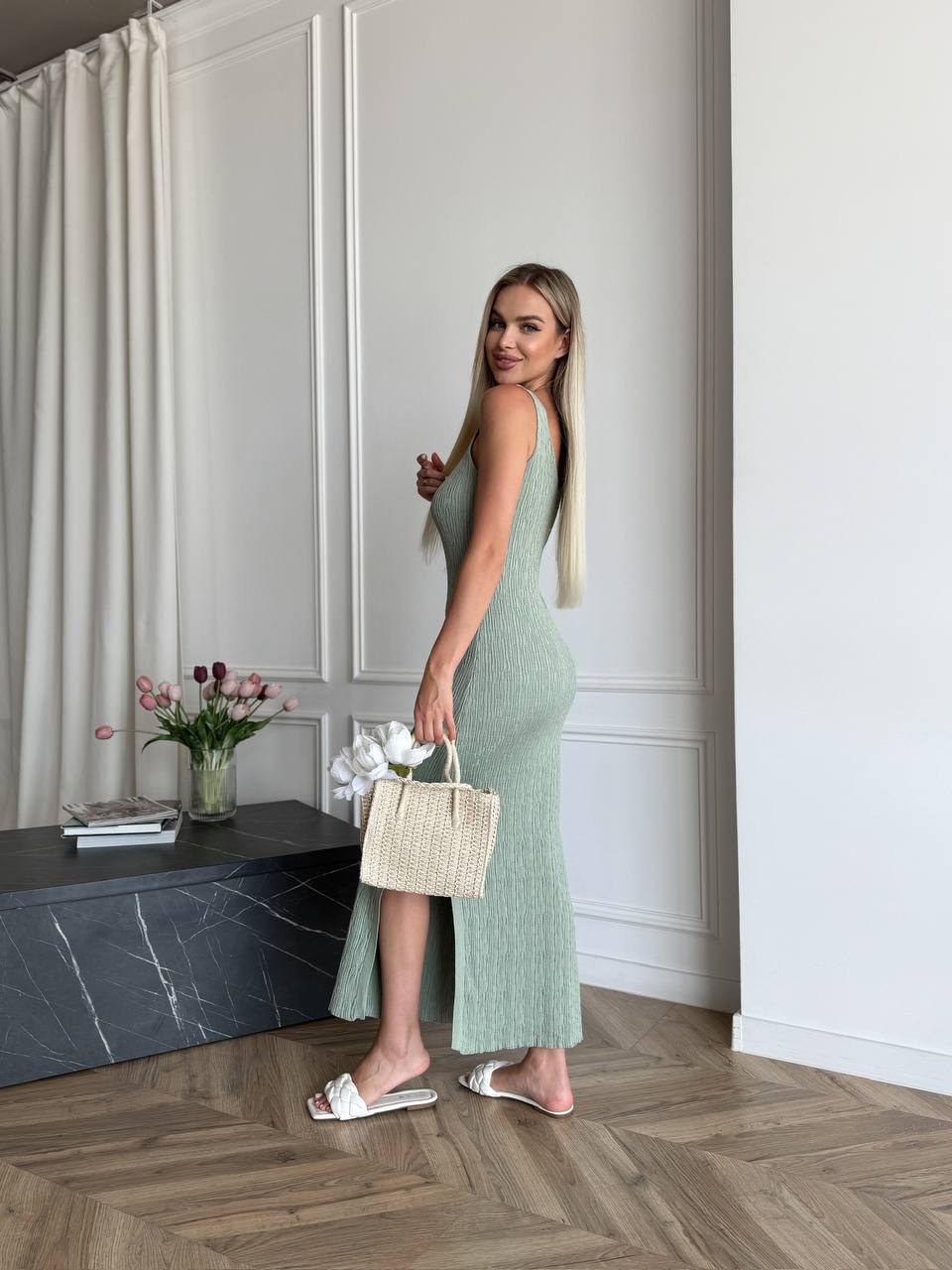 Женское Летнее Мятное Платье – Длинное из Фактурной Ткани с Разрезом Сбоку