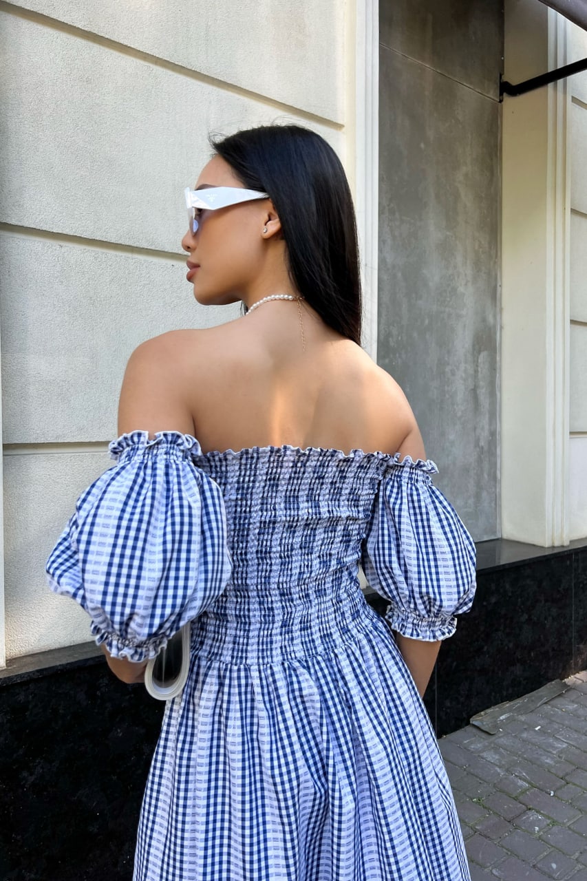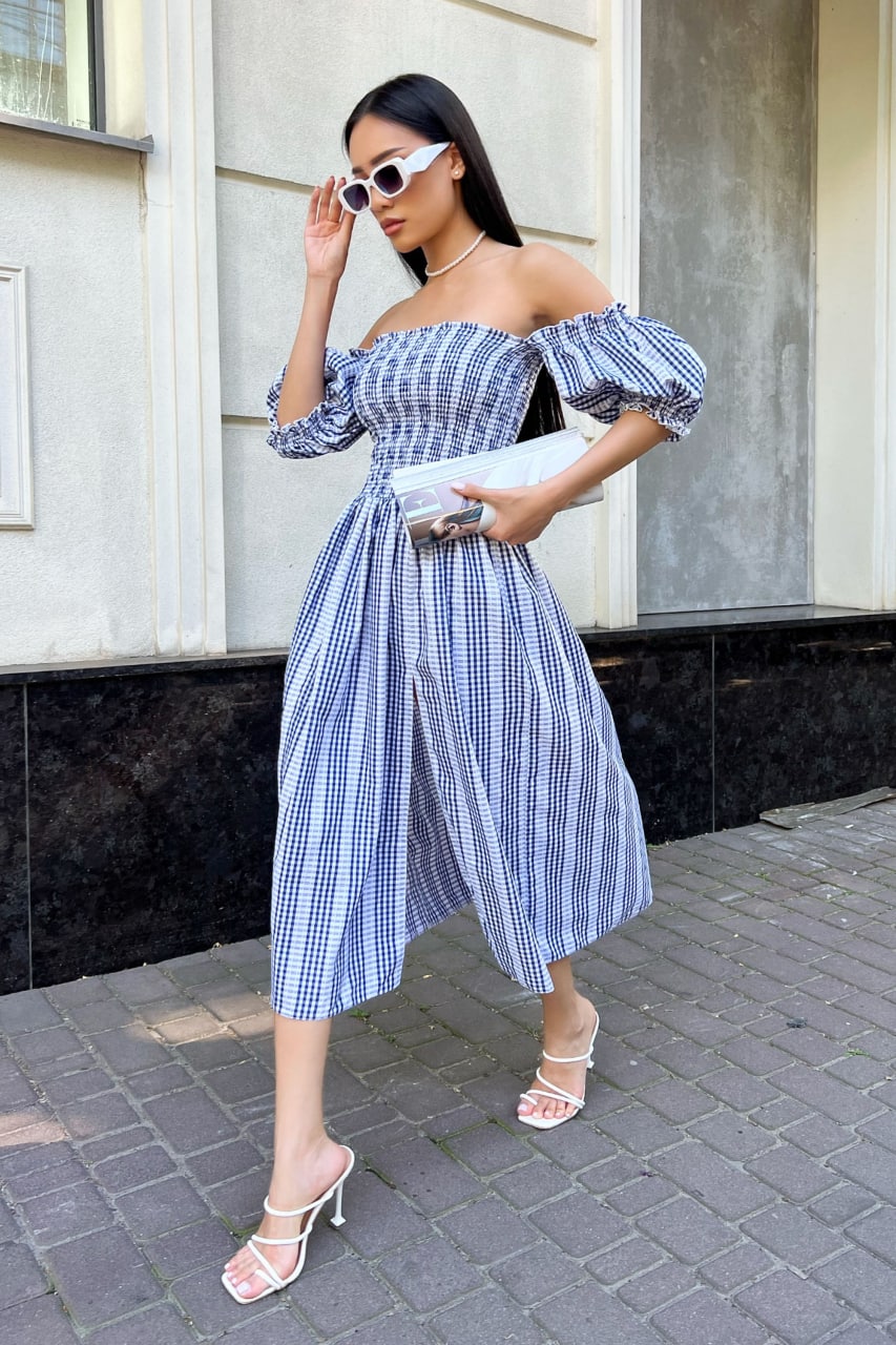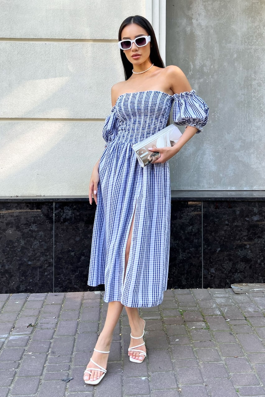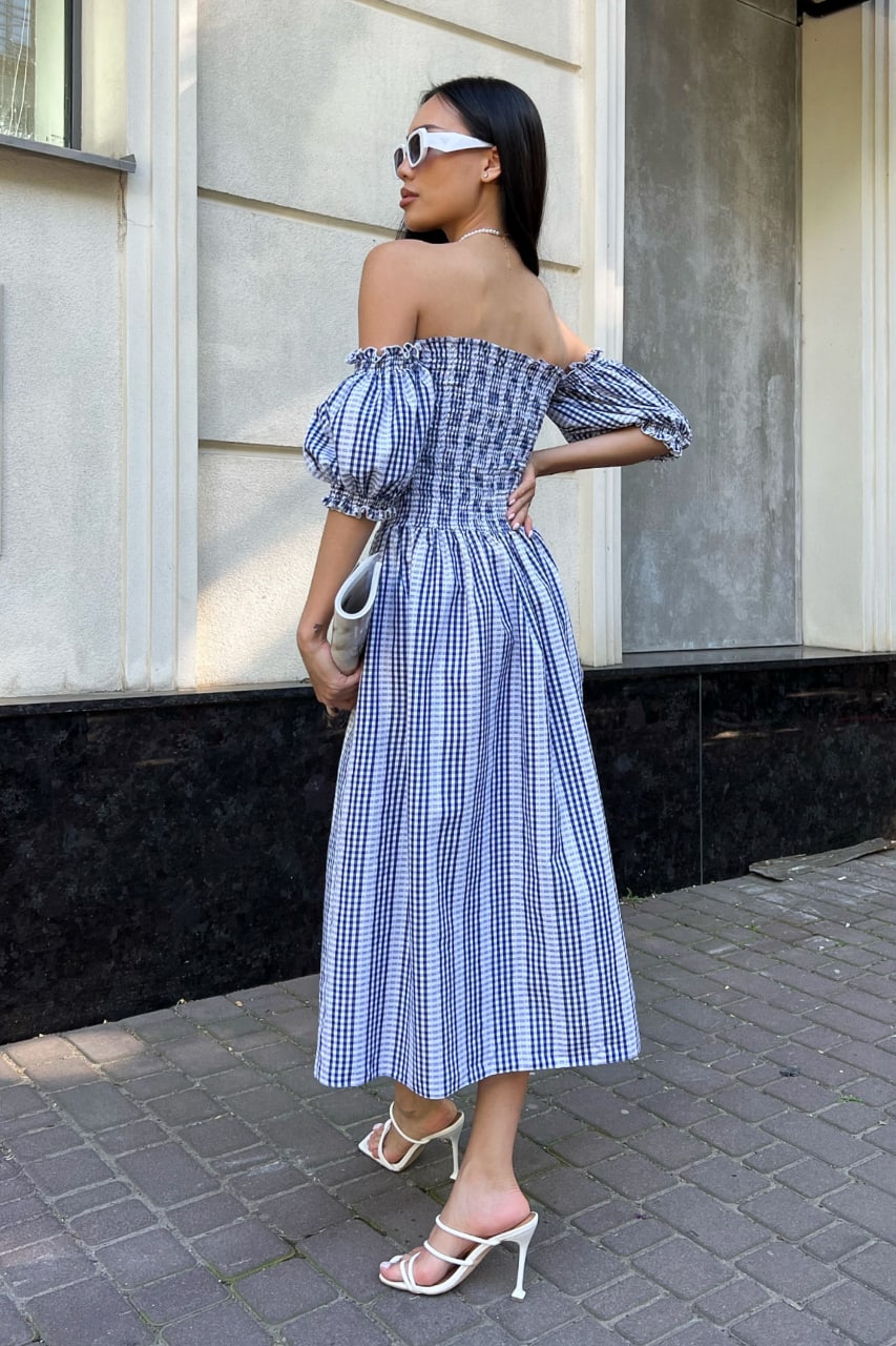 Женское Летнее Синее Платье Джорджина Миди – на Резинке Сверху с Открытыми Плечами в Принт Узор