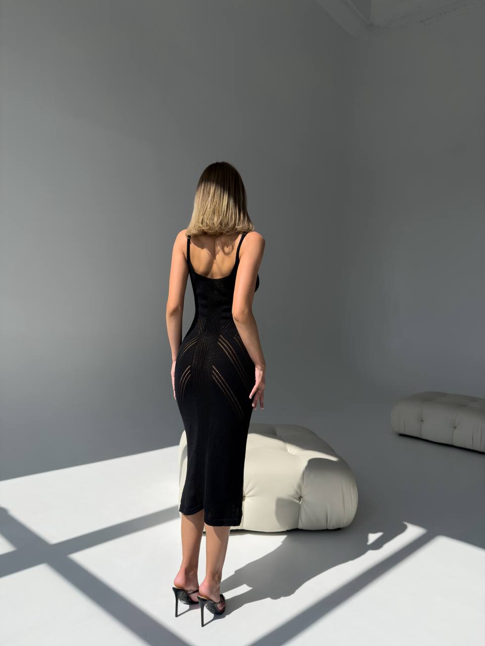 Женское Летнее Вязаное Черное Платье Миди с Ажурным Узором и Вырезом на Спине