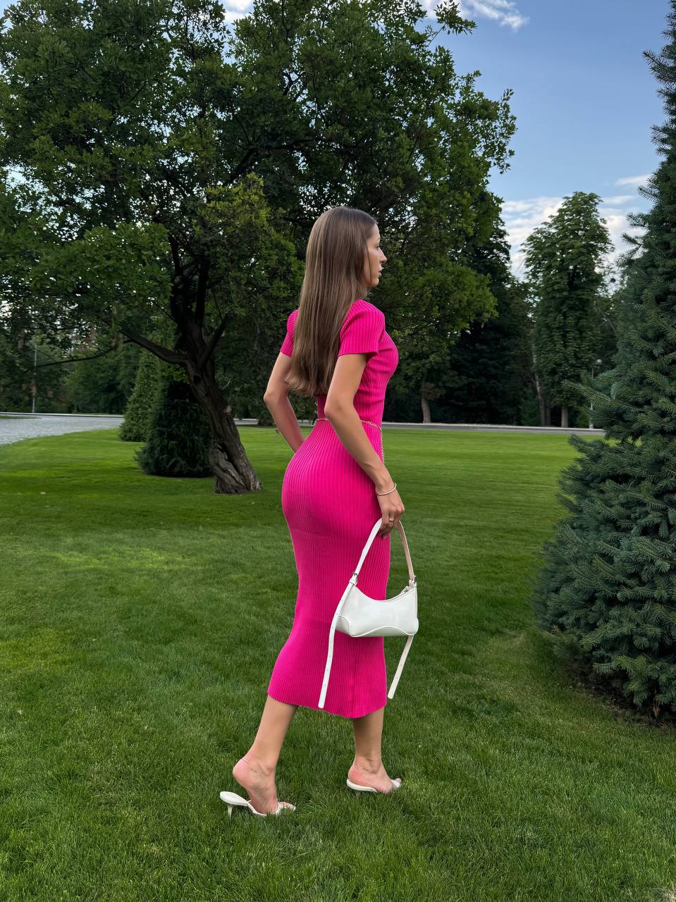 Женское Малиновое Платье Миди в Рубчик – Облегающее с Воротником и Короткими Рукавами