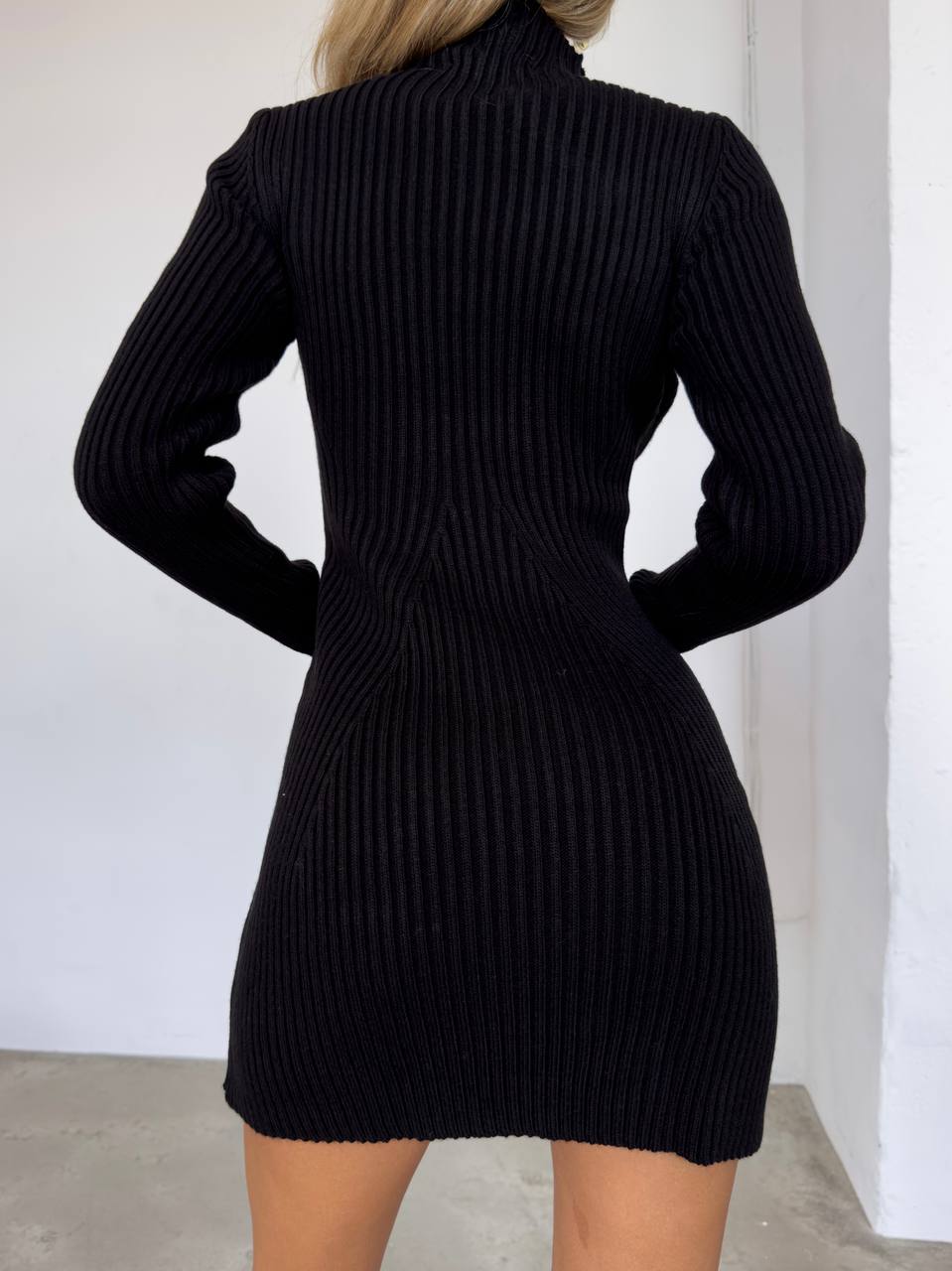 Женское Приталенное Черное Платье Мини – Теплое в Рубчик