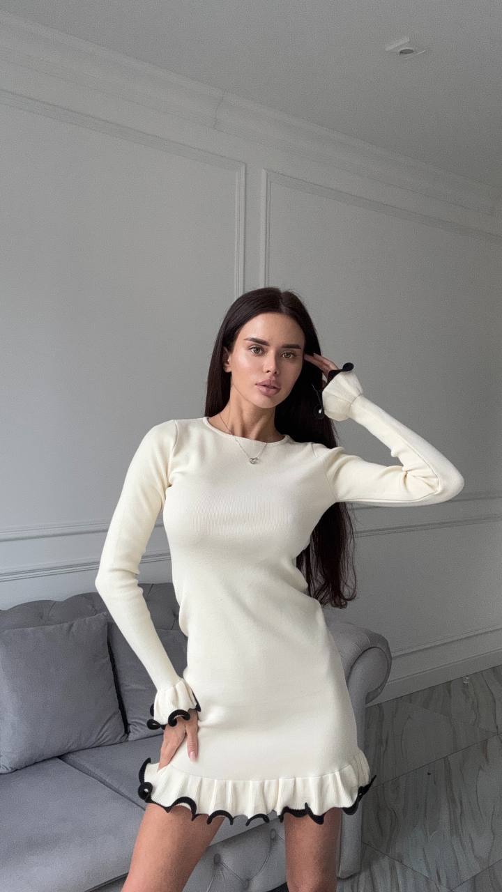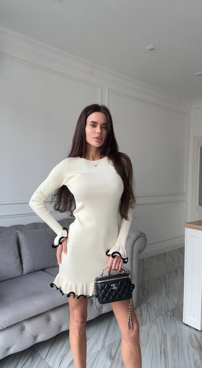 Женское Приталенное Молочное Платье Мини с Окантовкой и Воланами