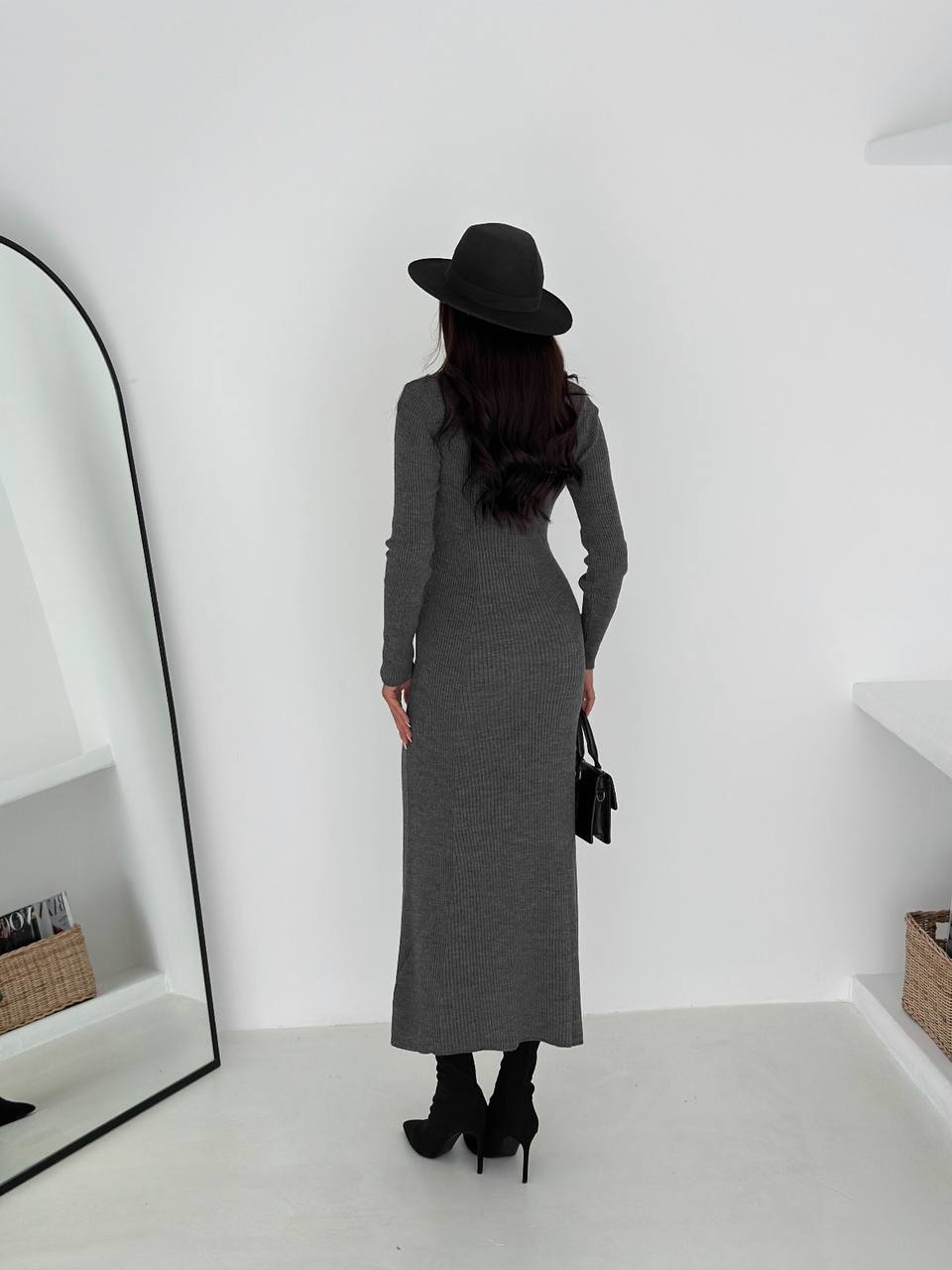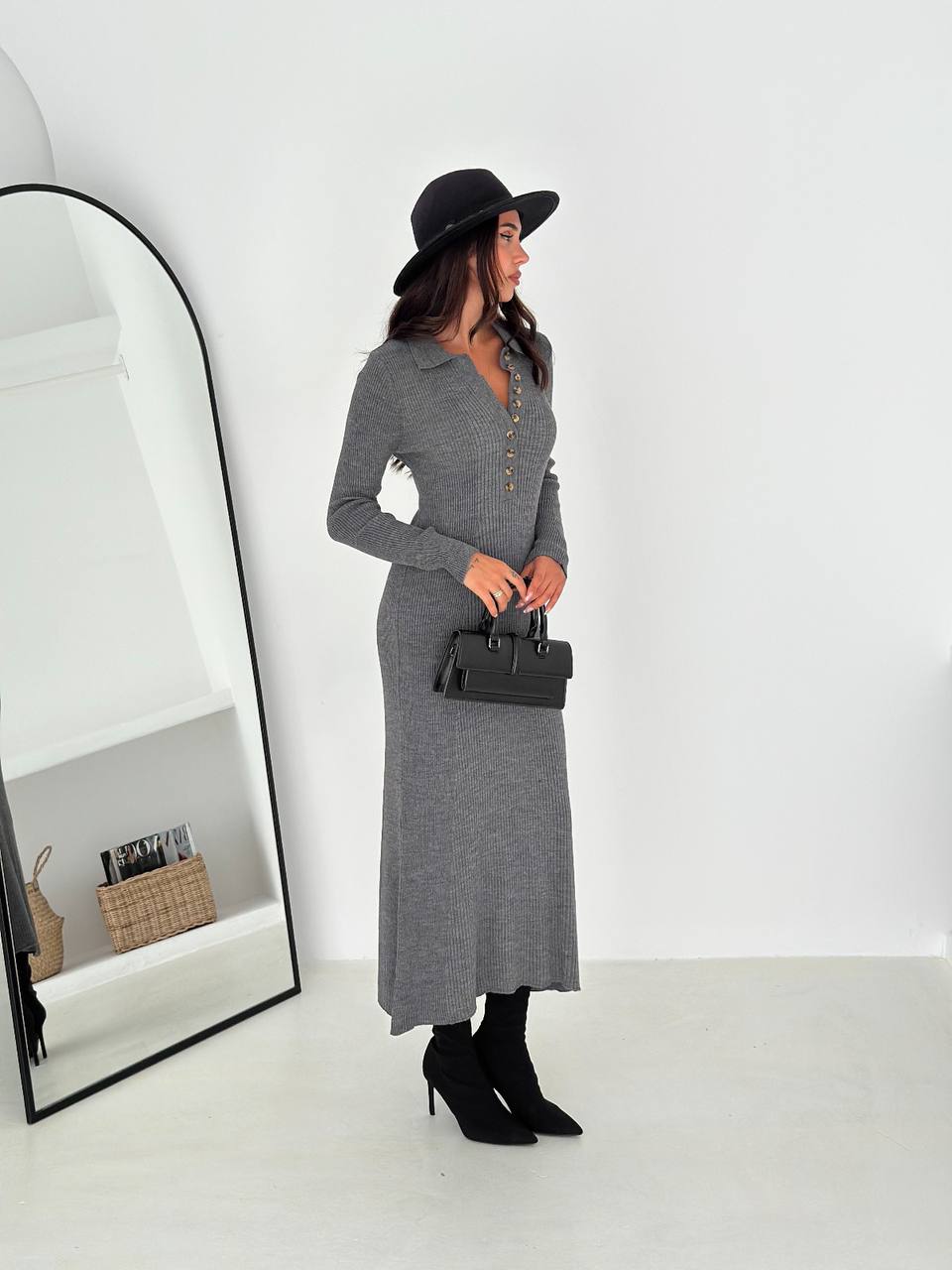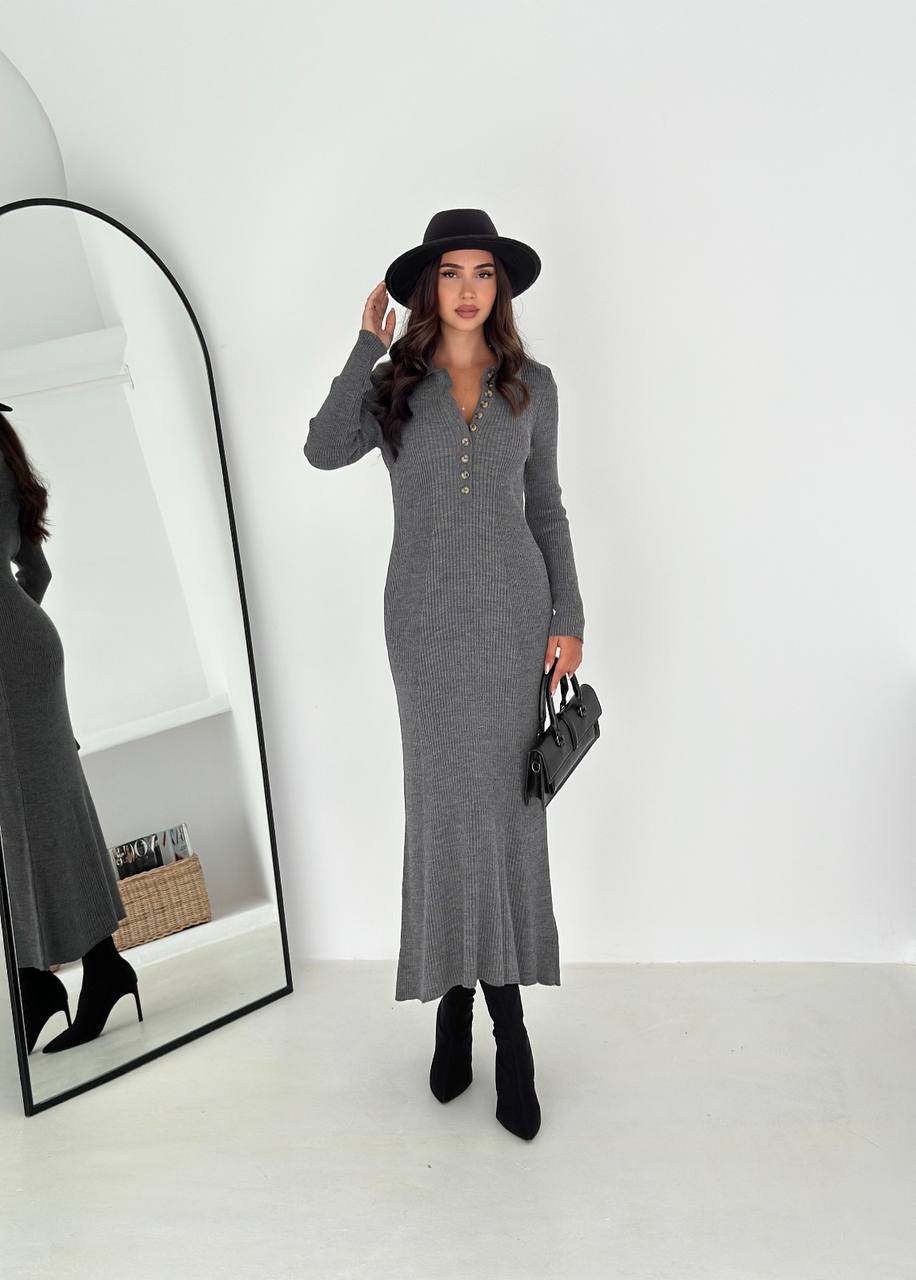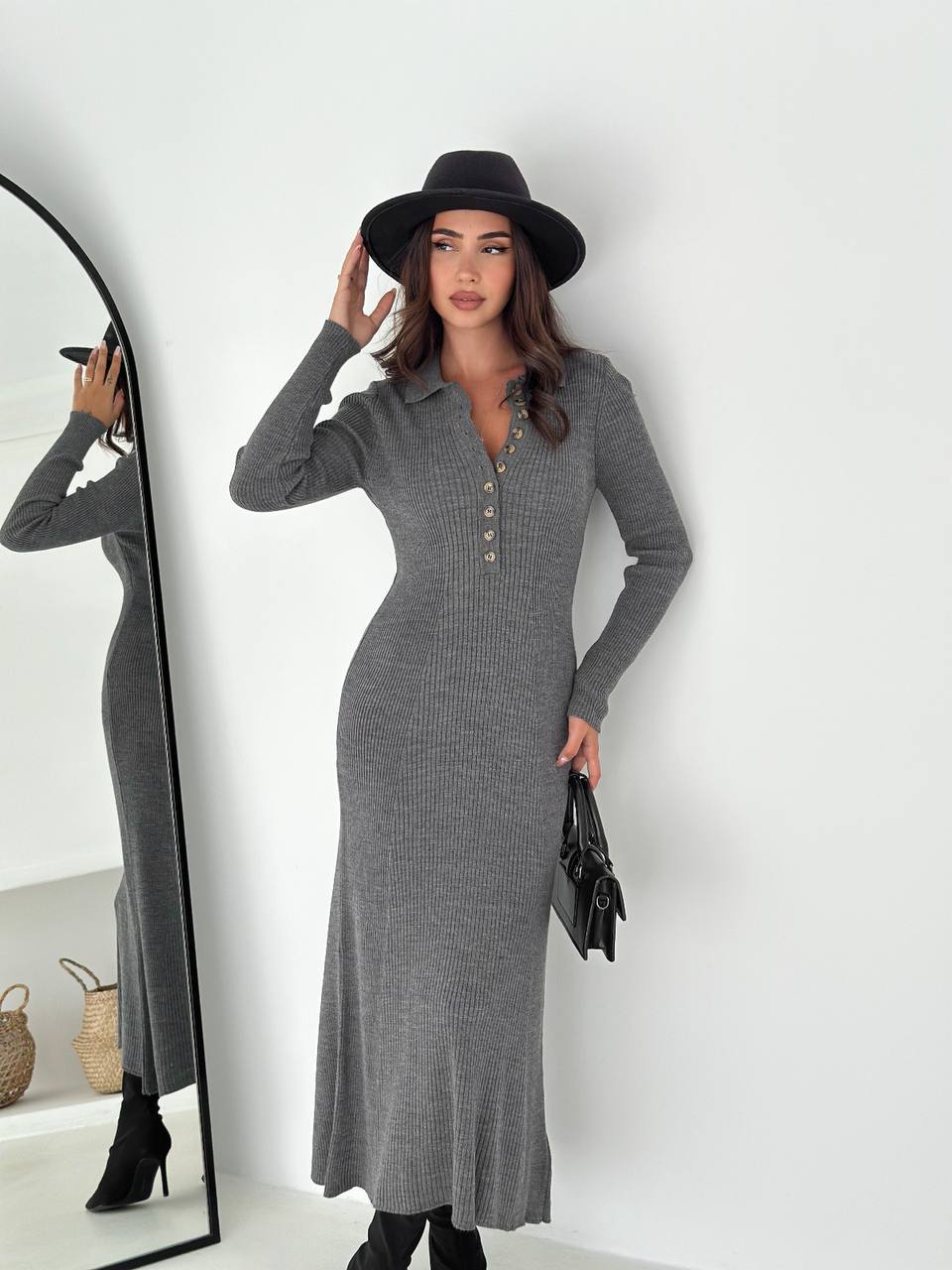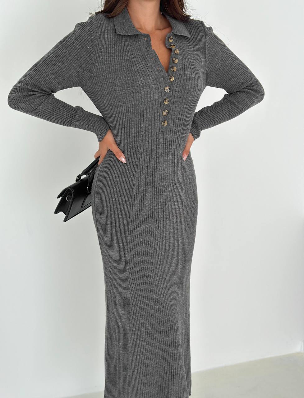 Женское Приталенное Серое Платье Поло в Рубчик с Воротником на Пуговицах