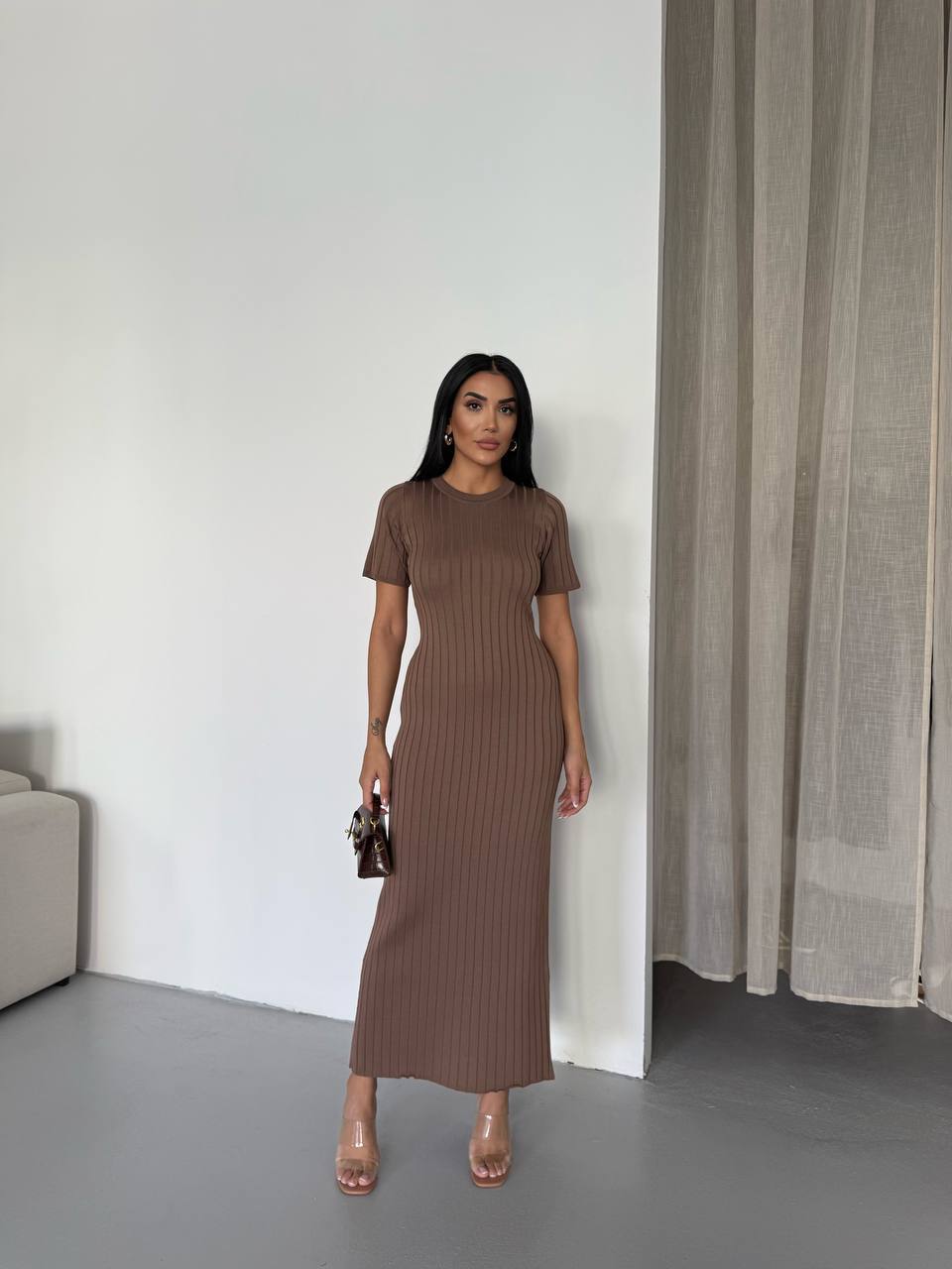 Женское Приталенное Трикотажное Коричневое Платье с Короткими Рукавами в Широкий Рубчик
