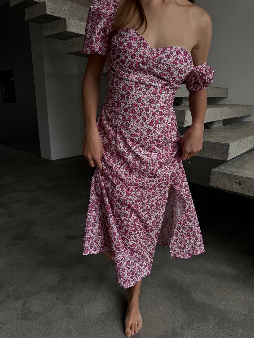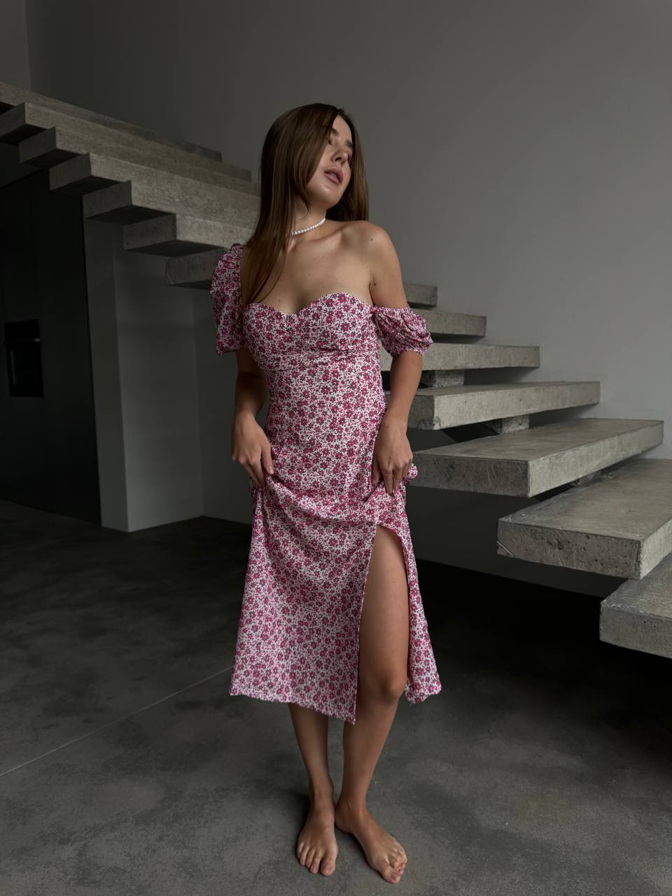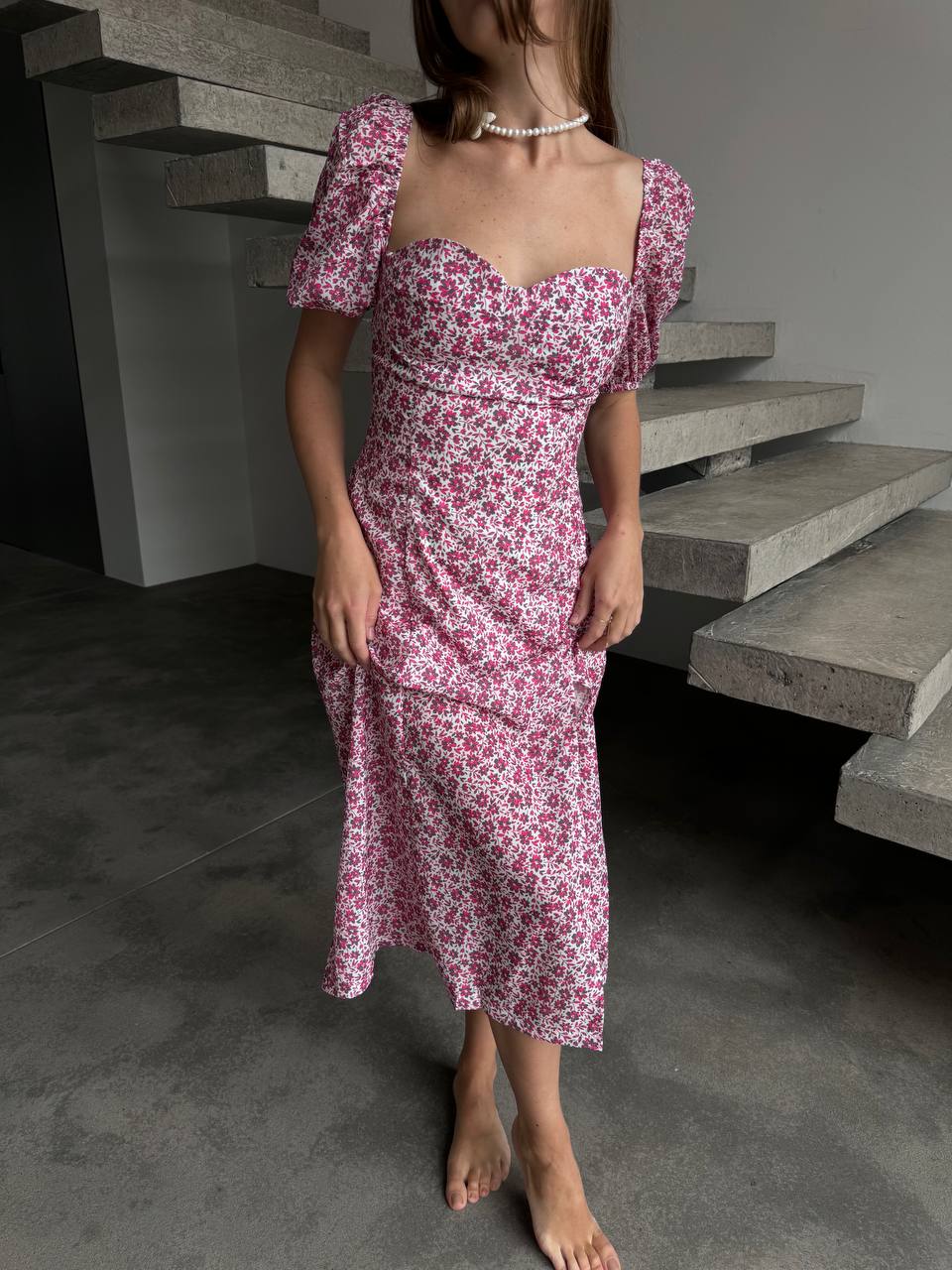 Женское Розовое Платье Миди в Цветочный Принт с Короткими Рукавами и Фигурным Вырезом Декольте