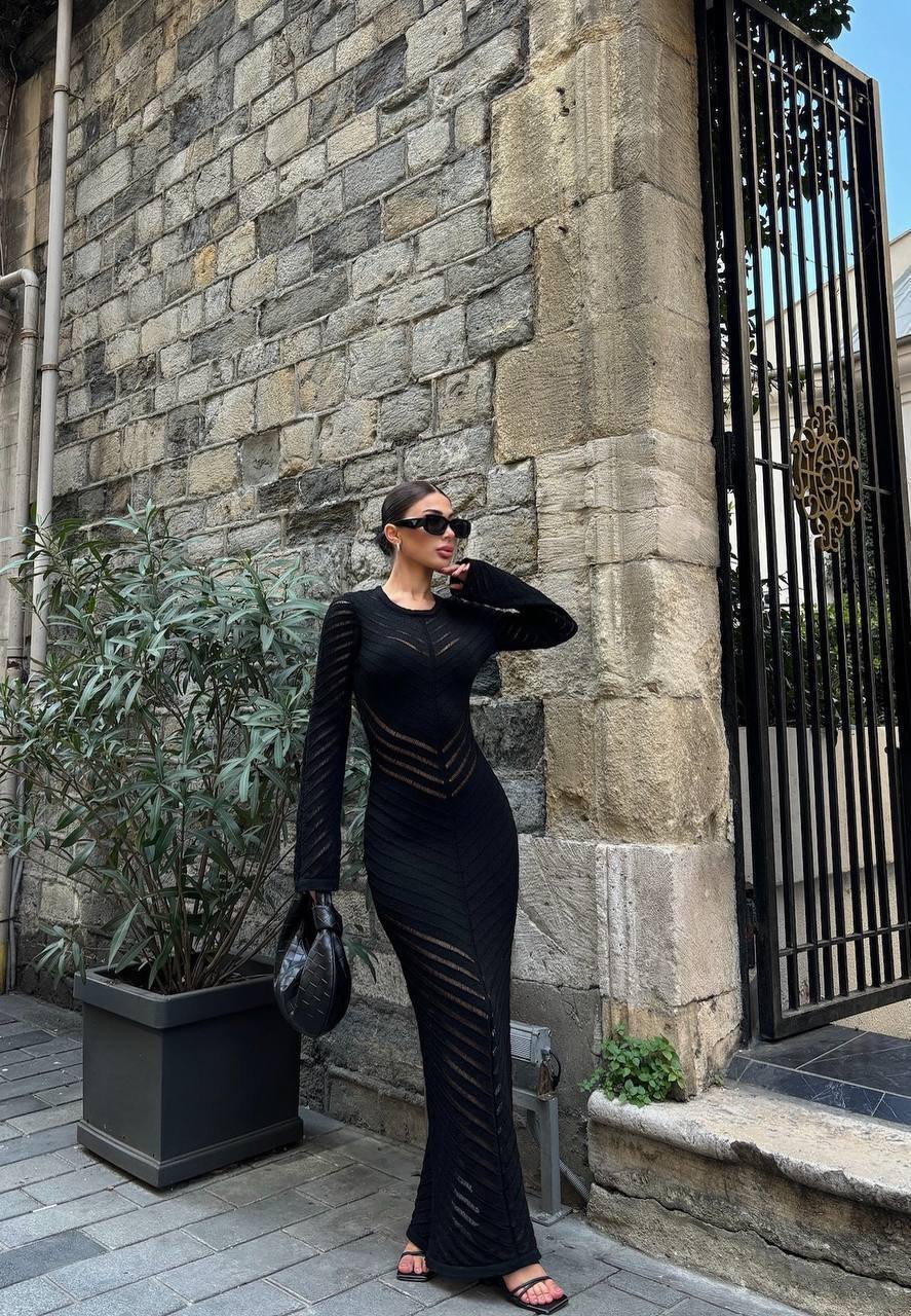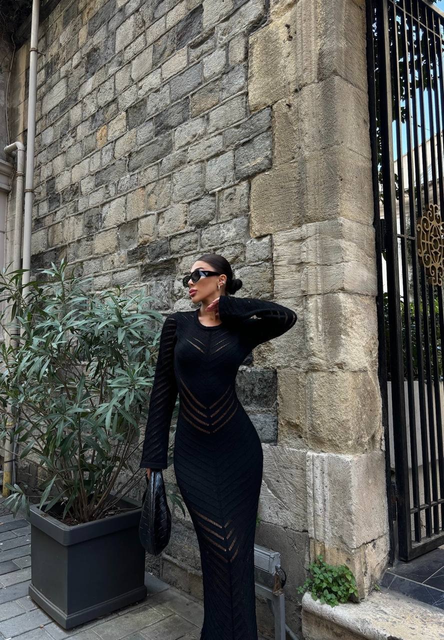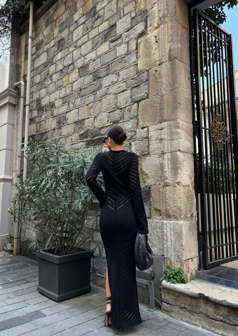 Женское Силуэтное Ажурное Черное Платье Миди с Длинными Рукавами и Разрезом на Ноге