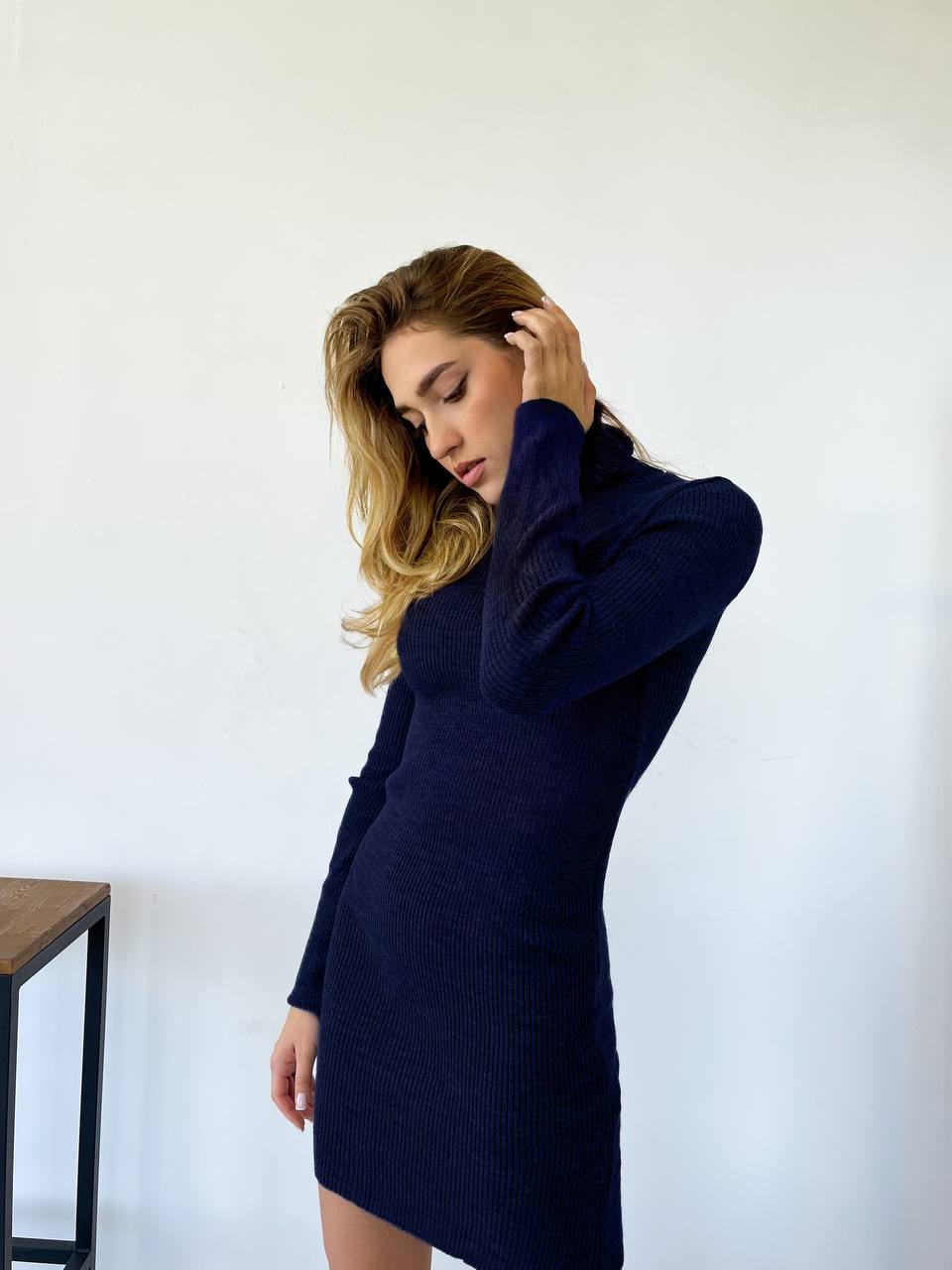 Женское Теплое Темно-Синее Платье-Гольф Мини – Силуэтное в Рубчик под Горло
