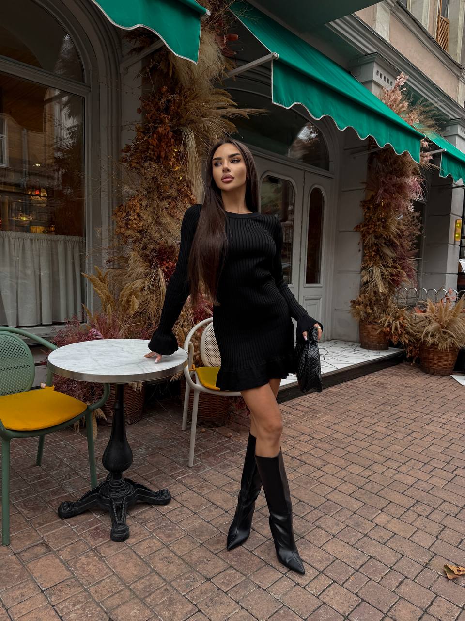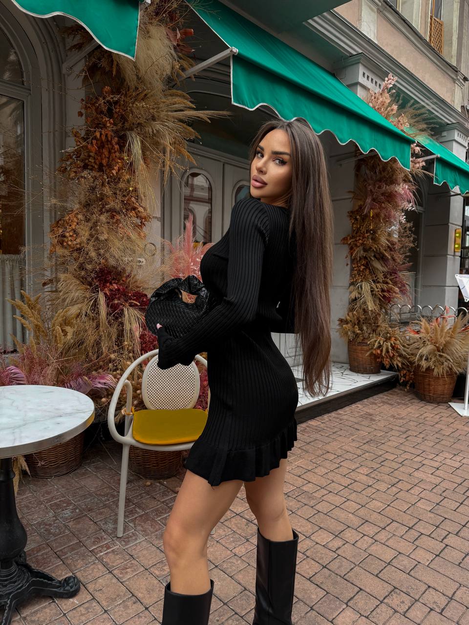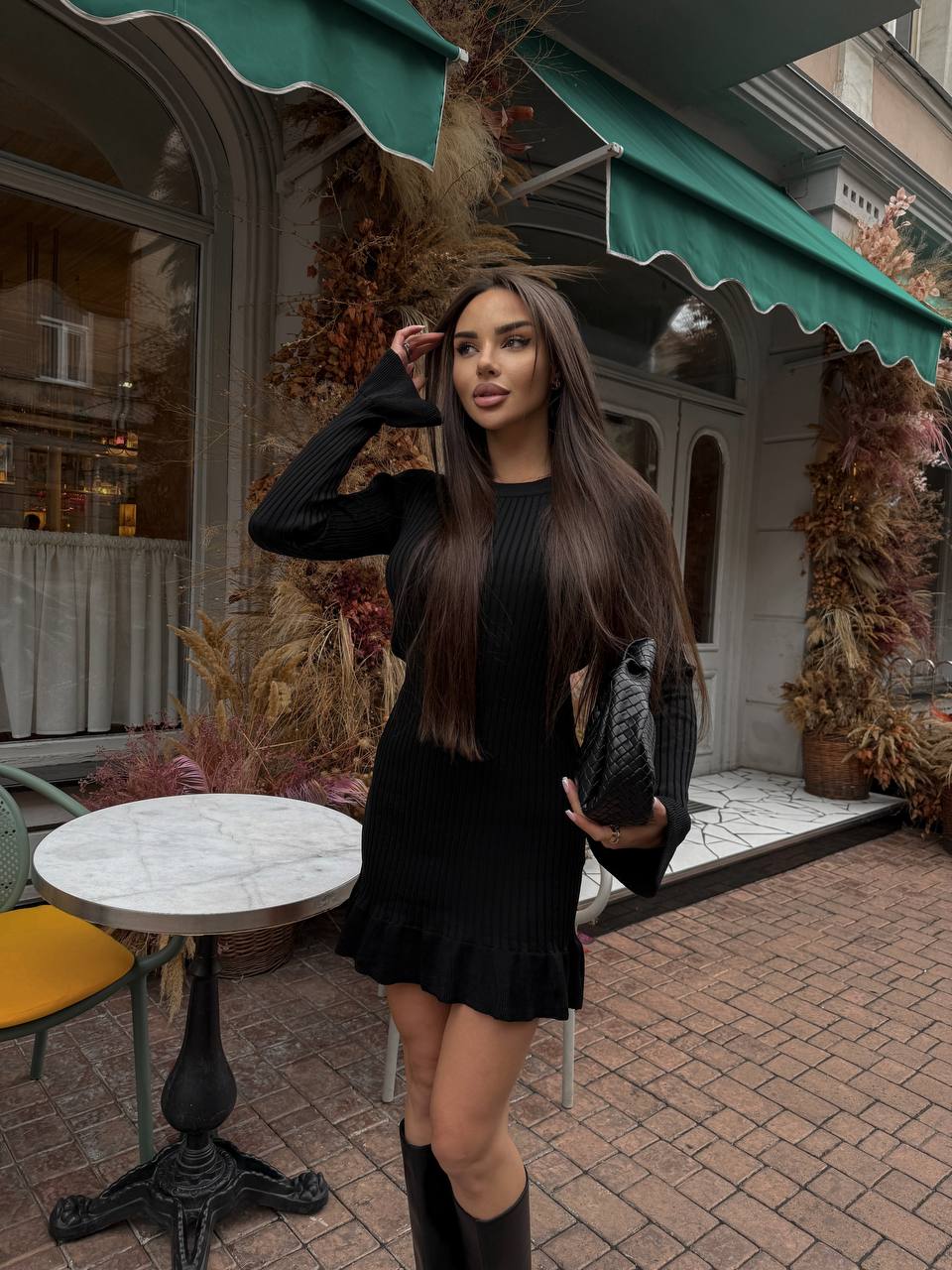 Женское Трикотажное Черное Платье Мини в Широкий Рубчик с Расклешенными Рукавами и Юбкой