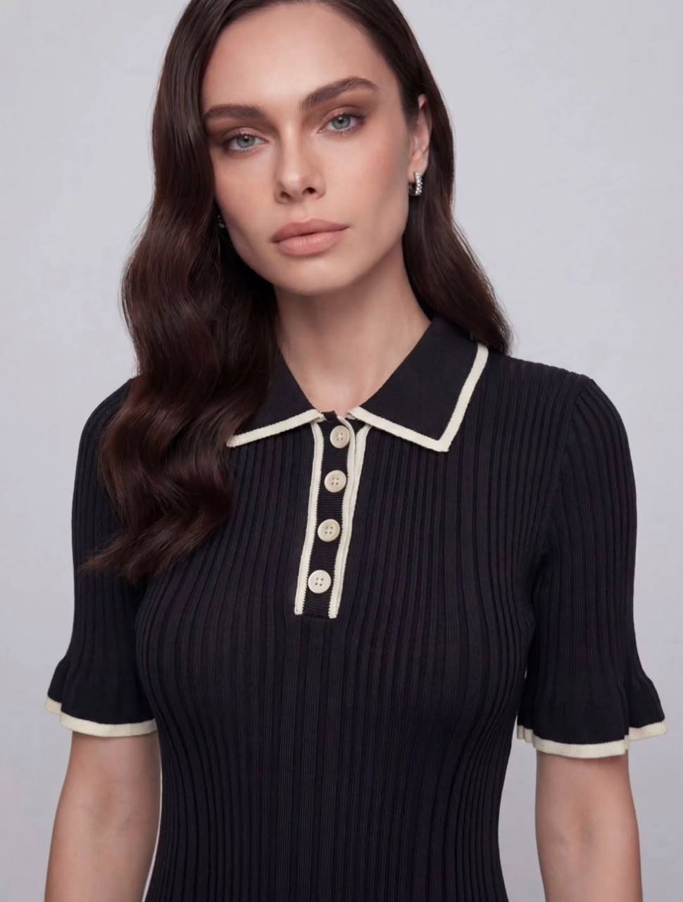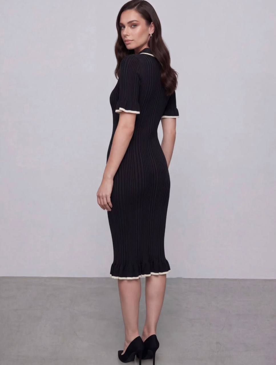 Женское Трикотажное Черное Платье Поло Миди с Окантовкой