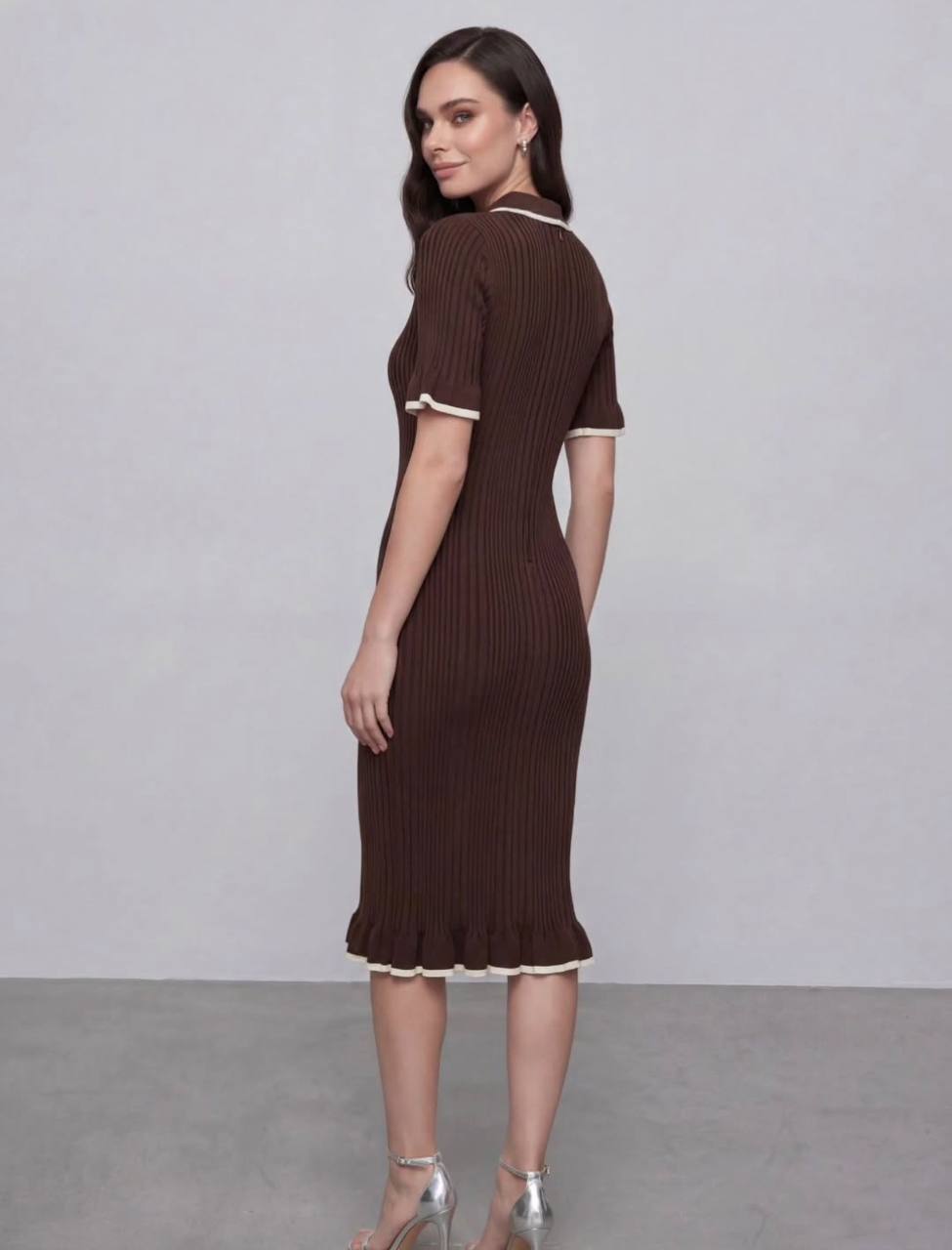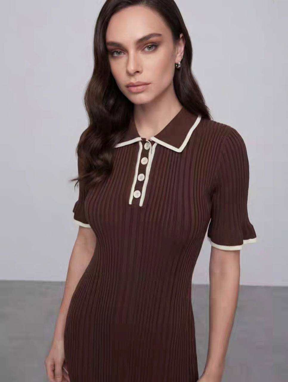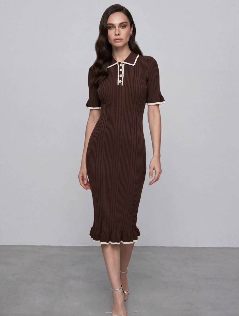 Женское Трикотажное Коричневое Платье Поло Миди с Окантовкой