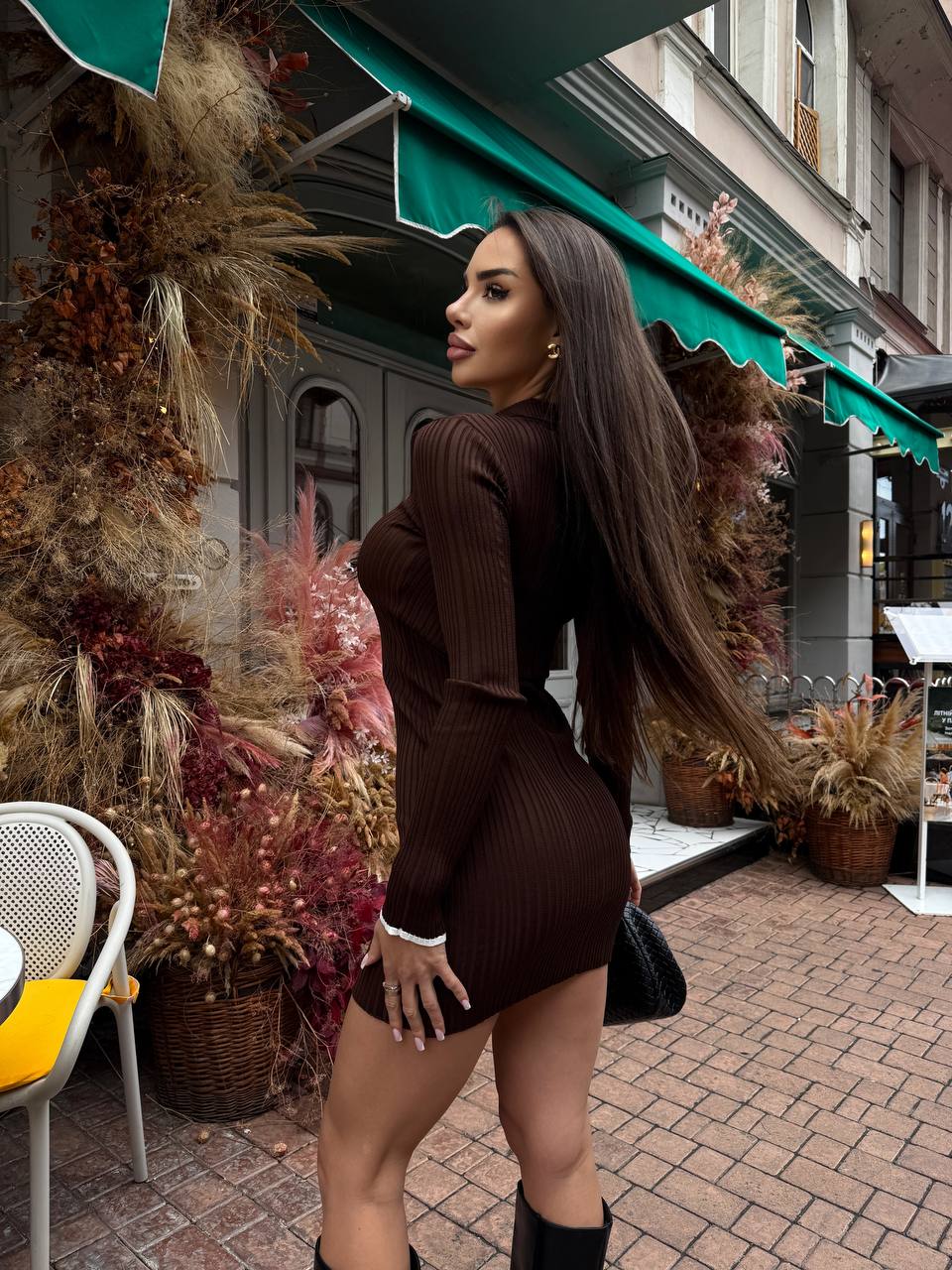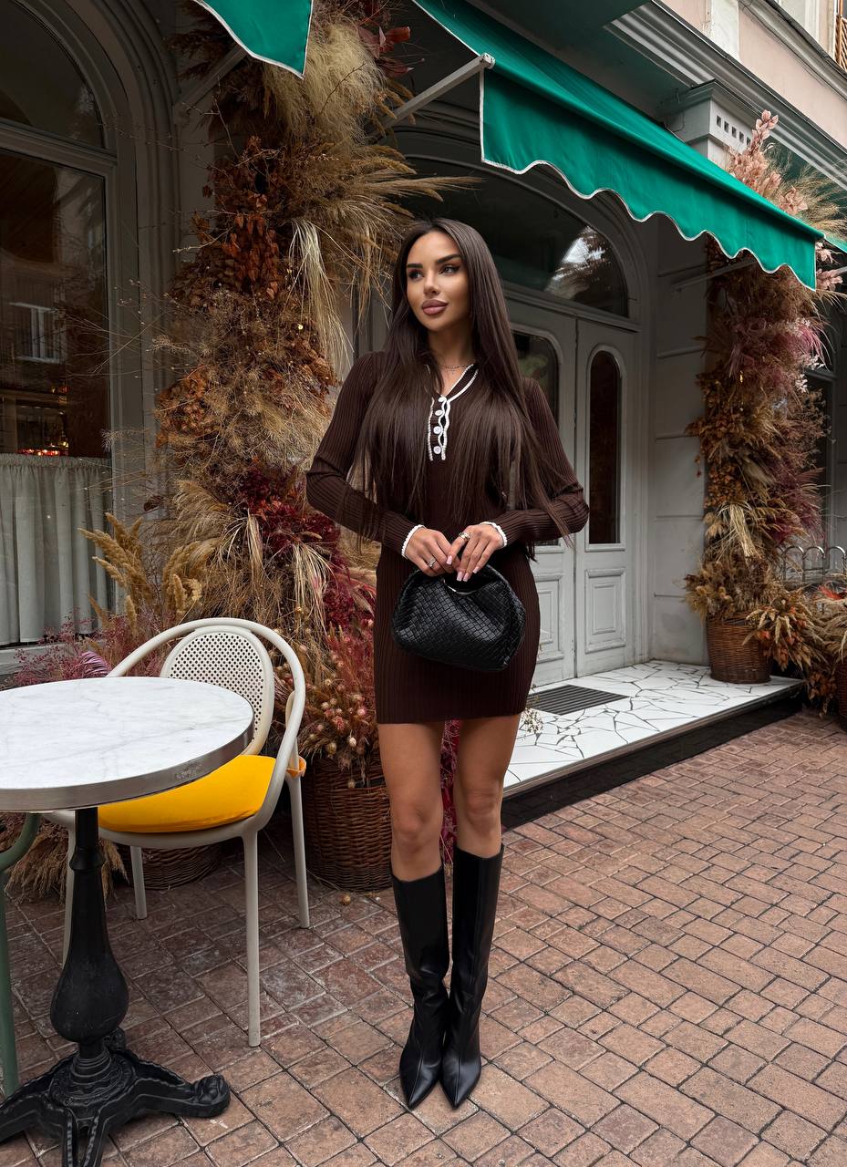 Женское Трикотажное Коричневое Платье Поло Мини с Воротником и Длинными Рукавами