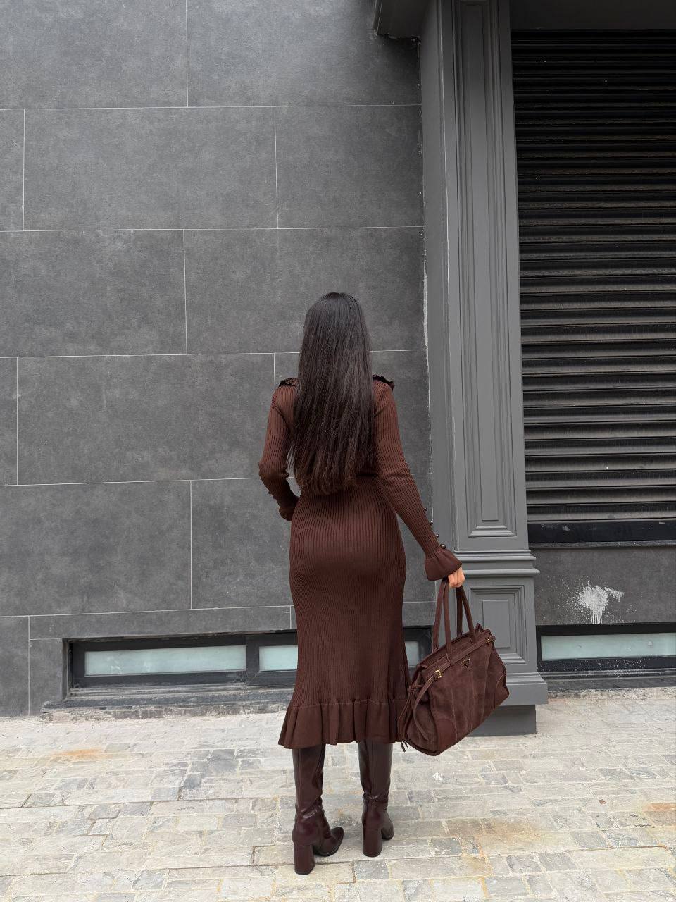 Женское Трикотажное Приталенное Коричневое Платье Миди в Рубчик с Воланами