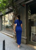 Женское Трикотажное Приталенное Синее Платье Миди с Короткими Рукавами и Завязкой на Талии Сзади
