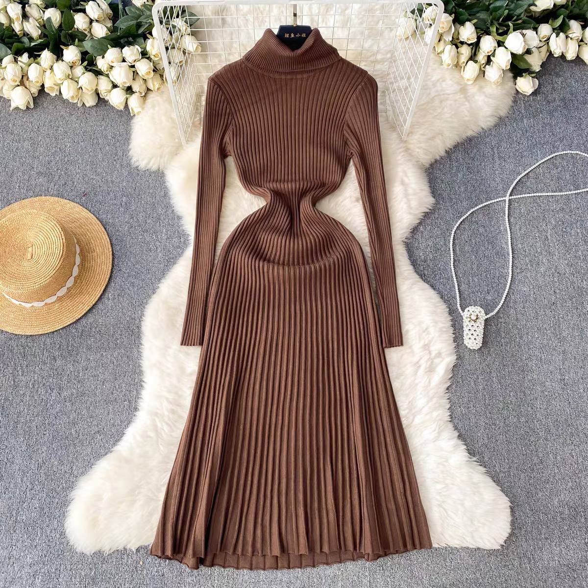 Женское Трикотажное Шоколадное Платье Миди в Широкий Рубчик с Горловиной