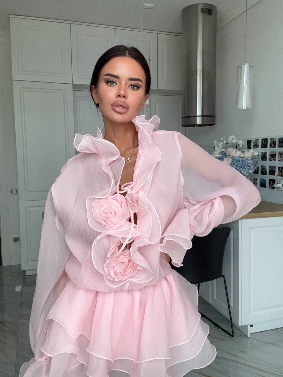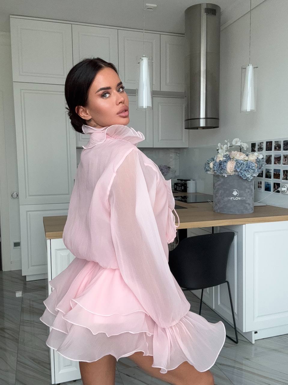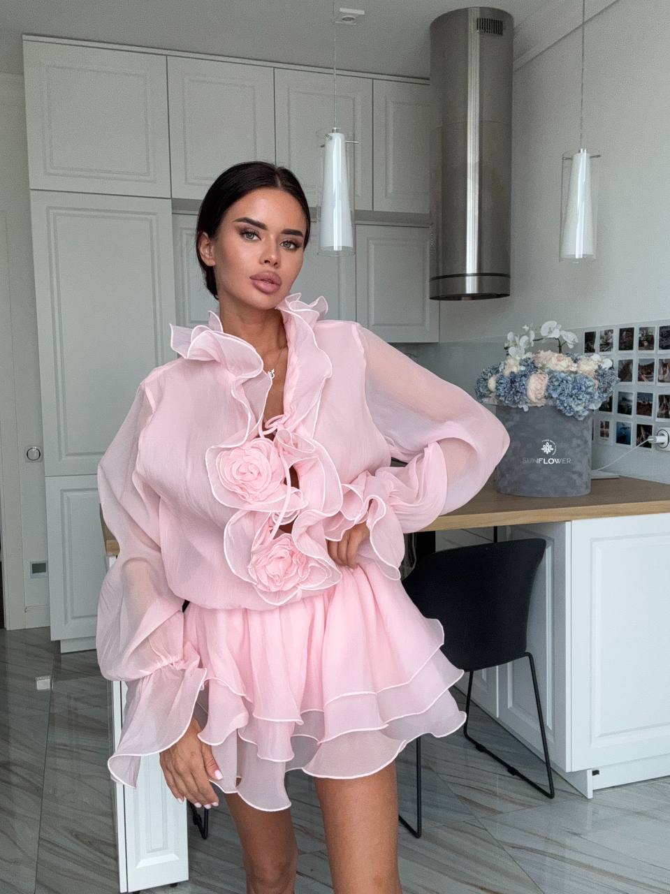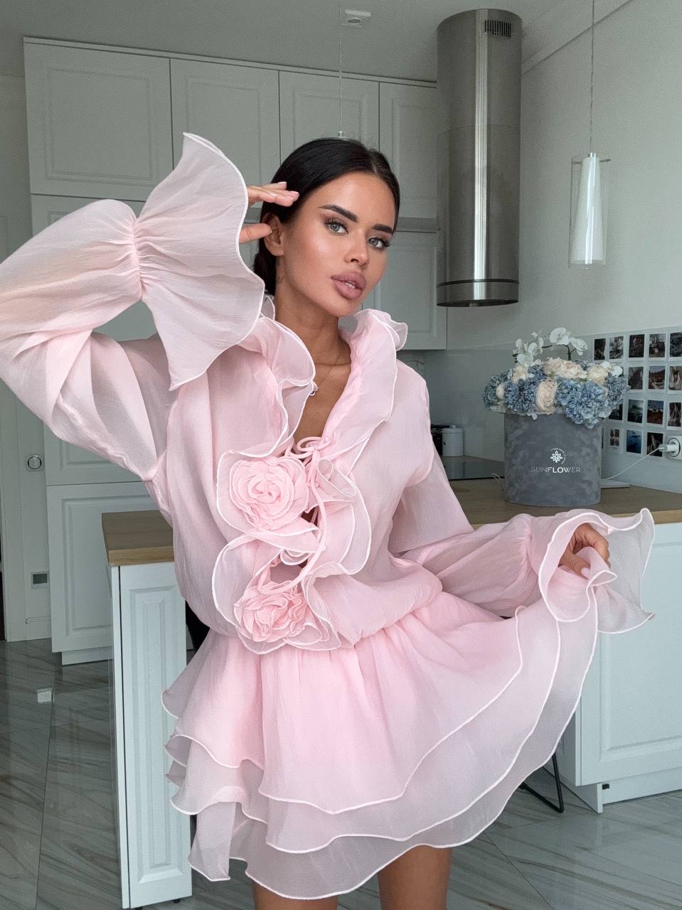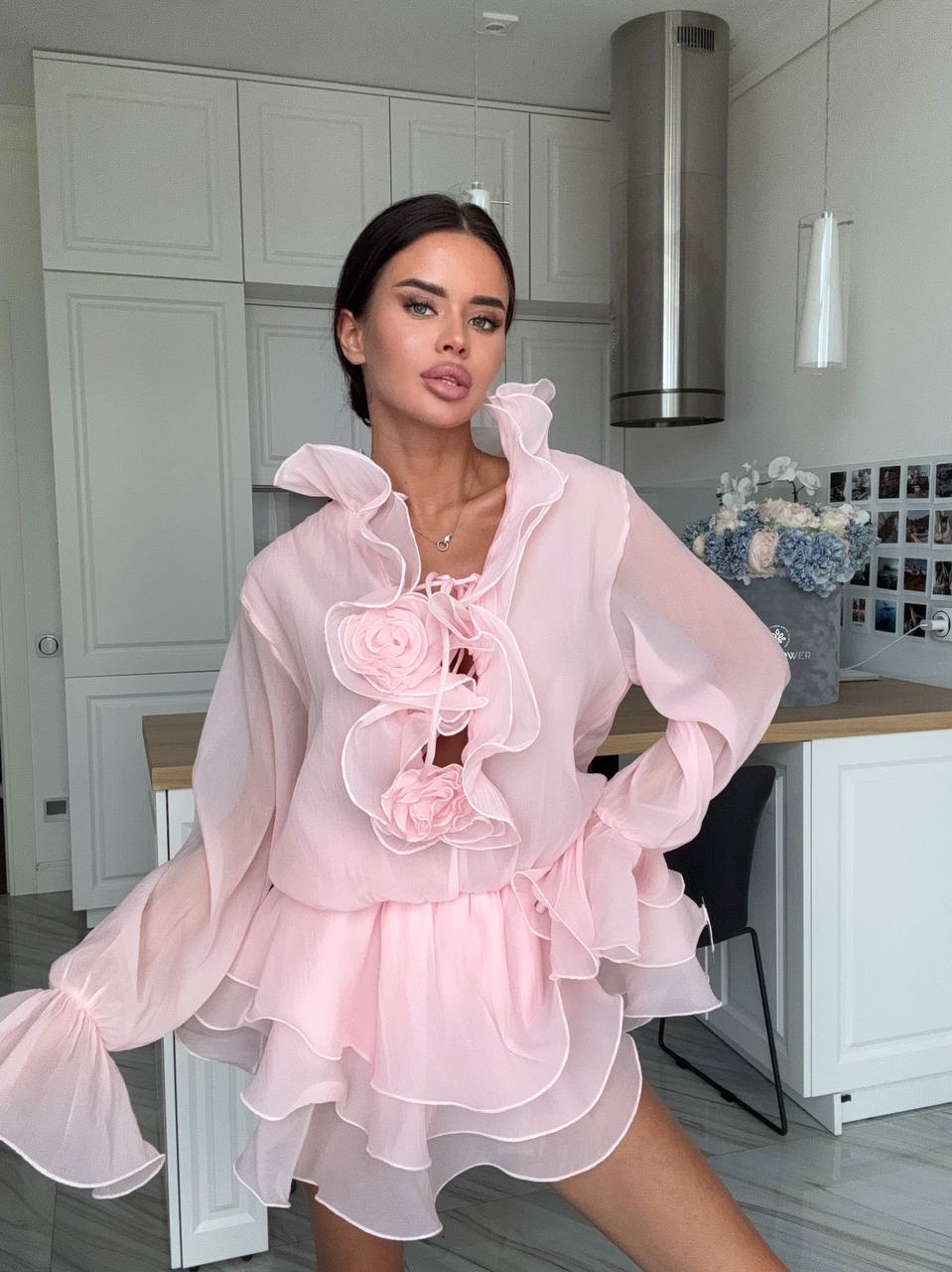 Женское Воздушное Объемное Розовое Платье Мини с Рюшами и Цветами