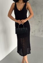Женское Вязаное Ажурное Черное Платье Миди – Полупрозрачное с Подкладом
