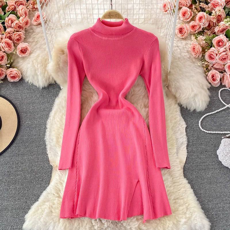 Женское Вязаное Розовое Платье Мини – с Высоким Горлом и Разрезом