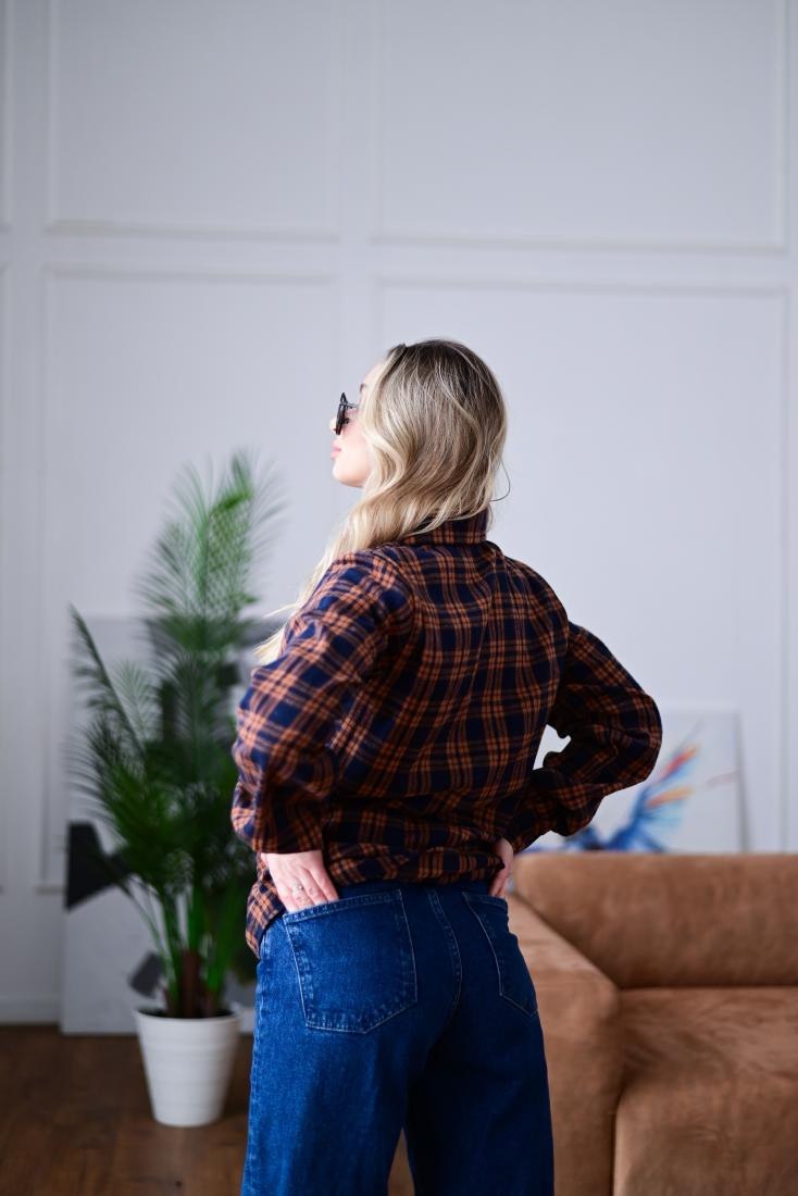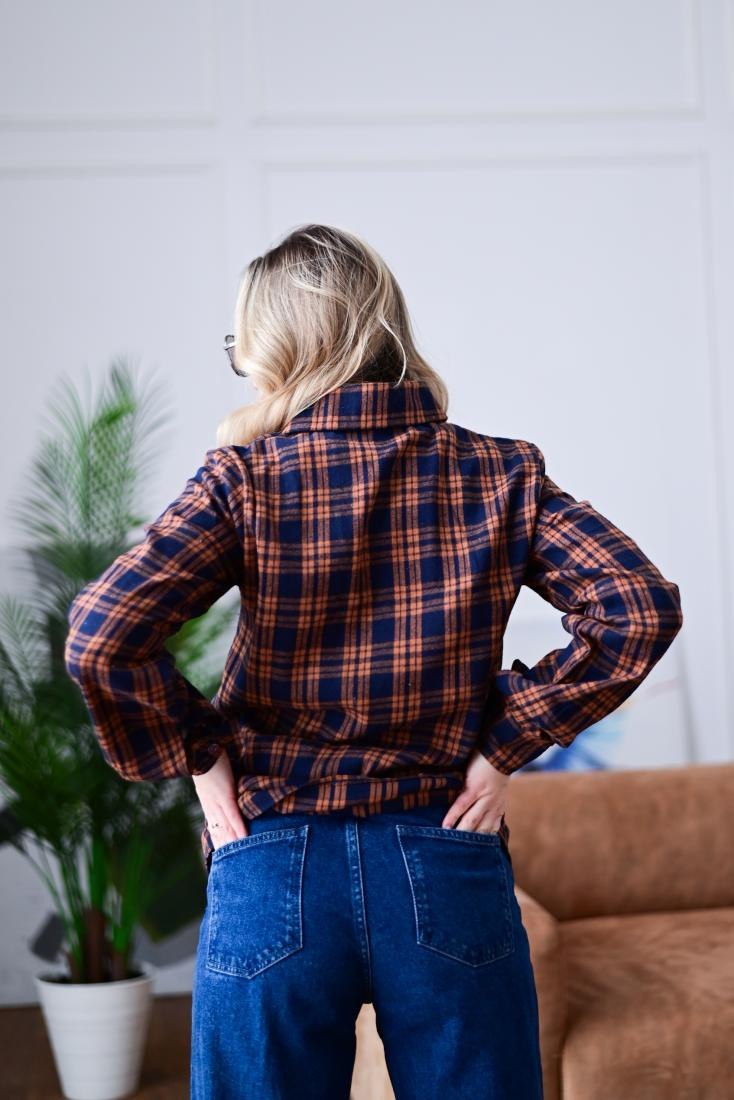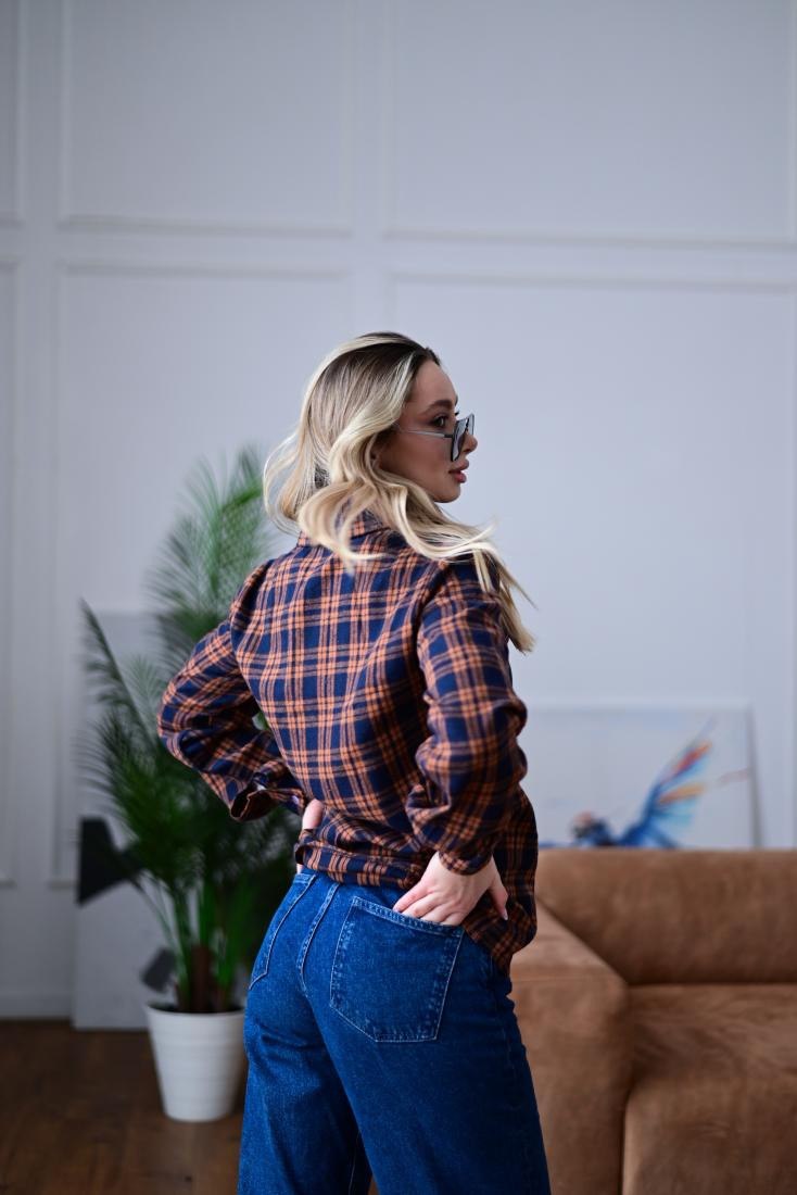 Женская Свободная Байковая Клетчатая Сине-Оранжевая Рубашка
