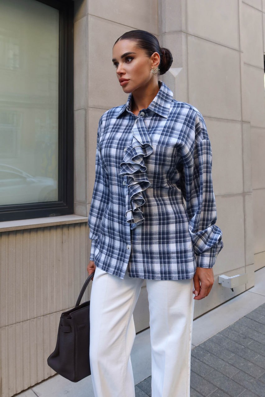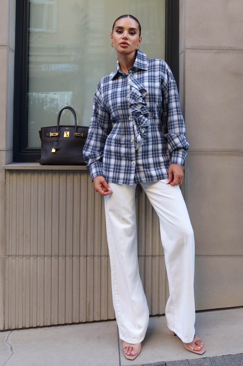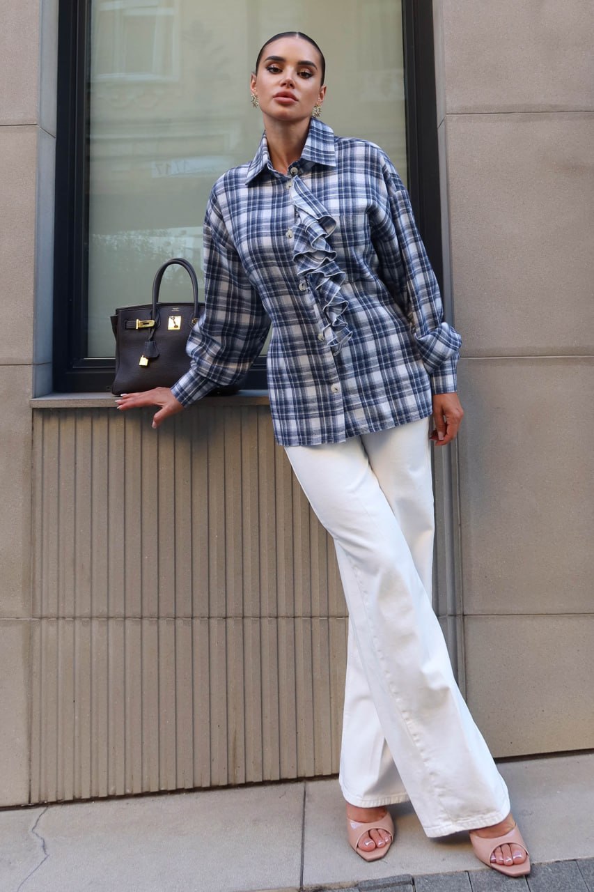 Женская Свободная Клетчатая Белая Рубашка Сьют с Рюшами и Шнуровкой на Спине
