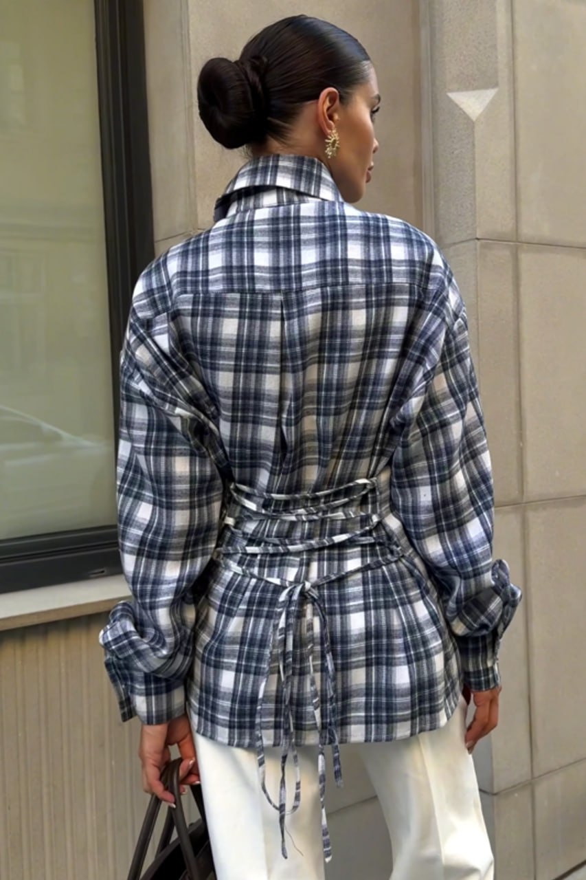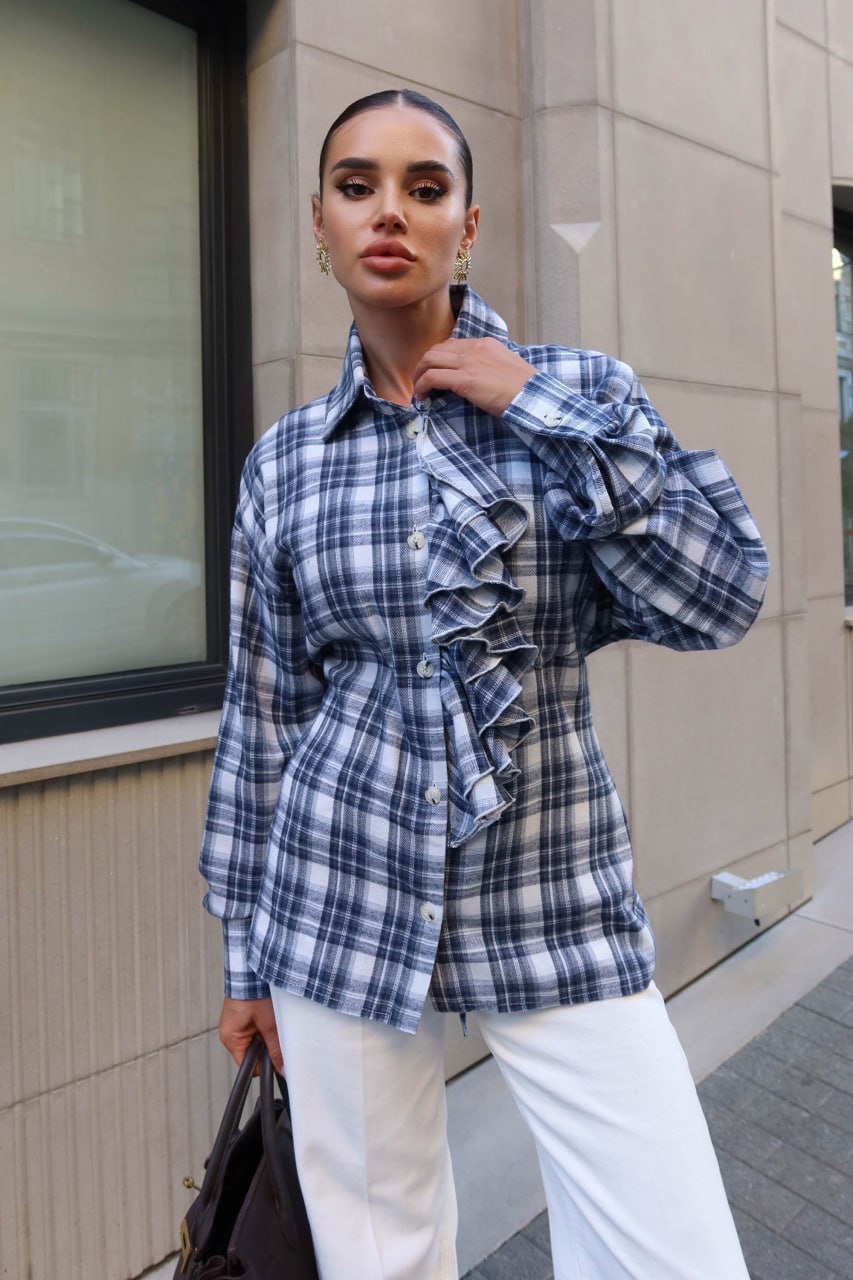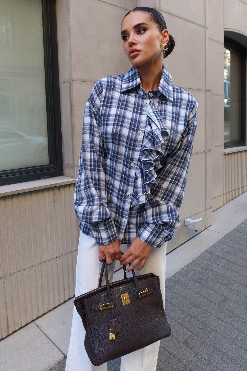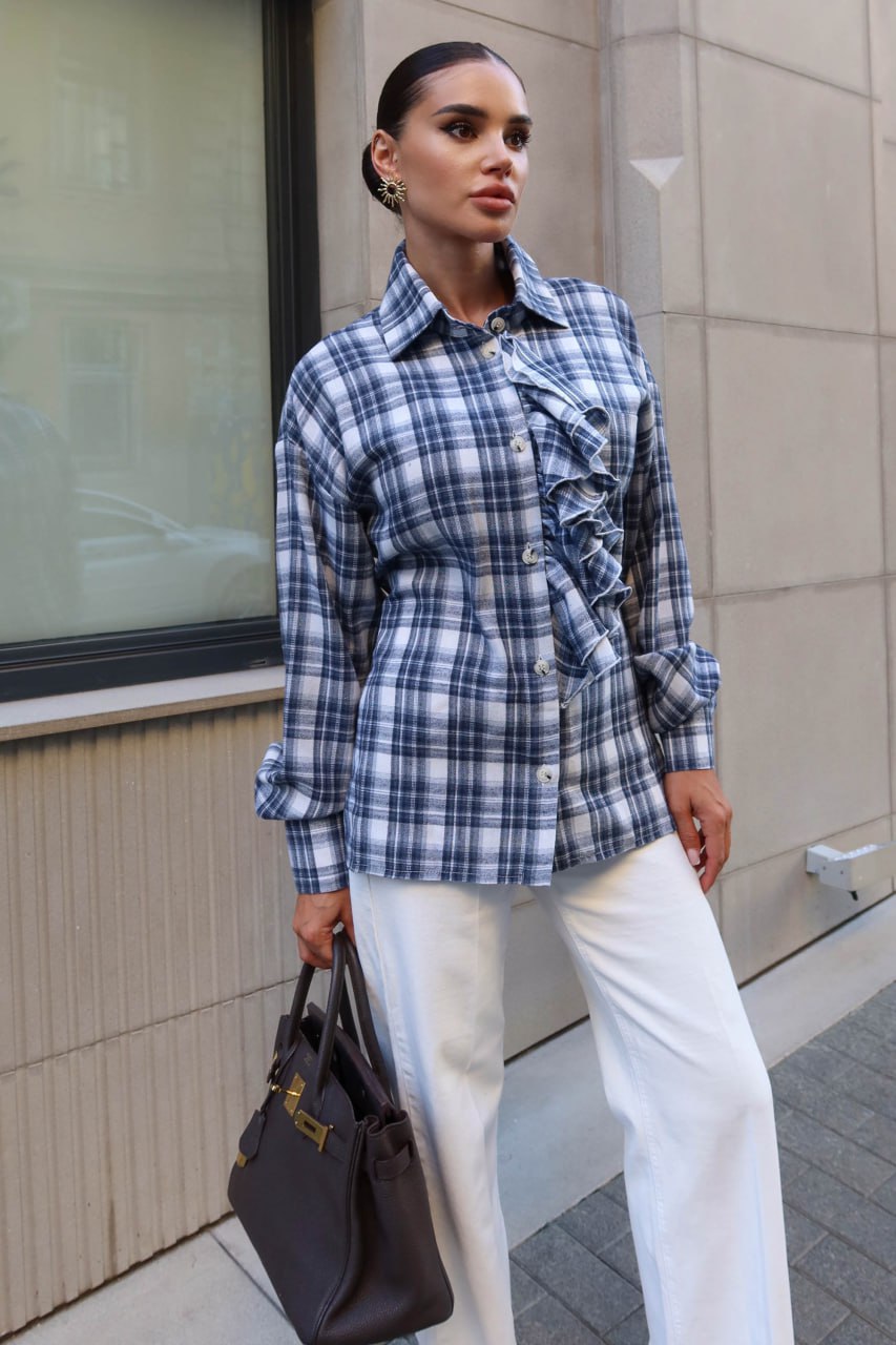 Женская Свободная Клетчатая Белая Рубашка Сьют с Рюшами и Шнуровкой на Спине