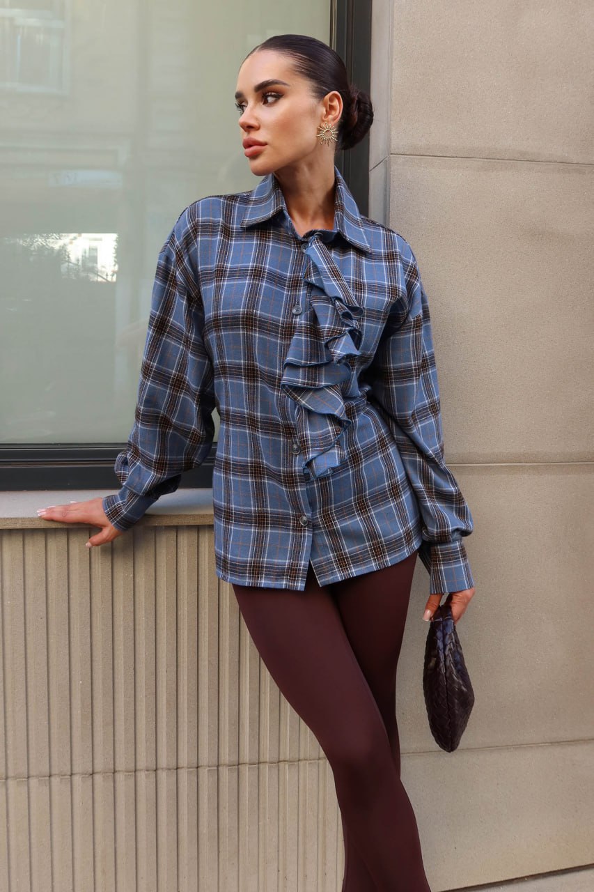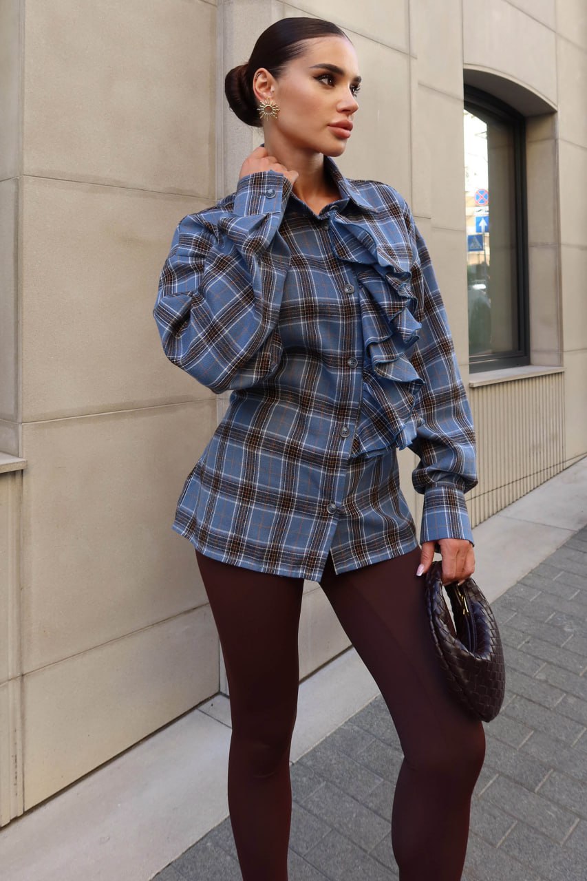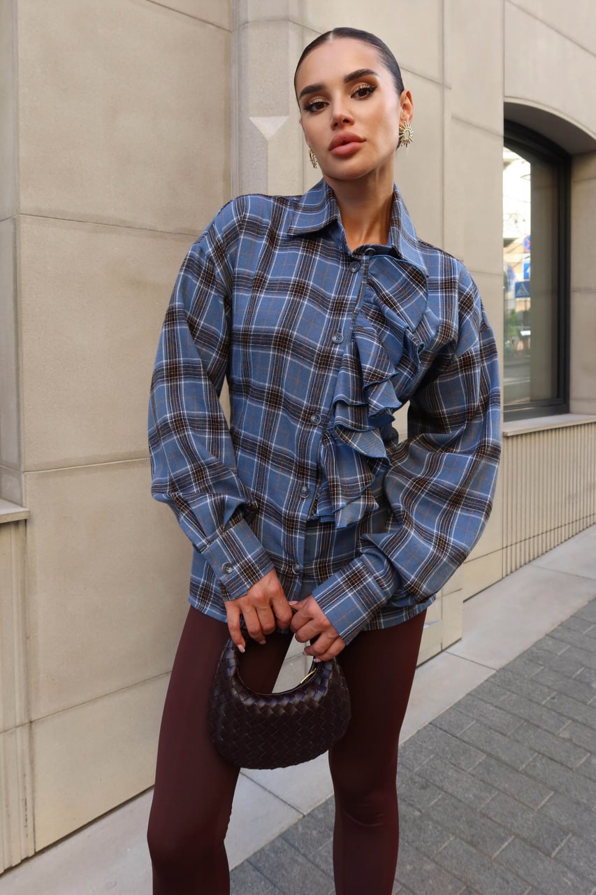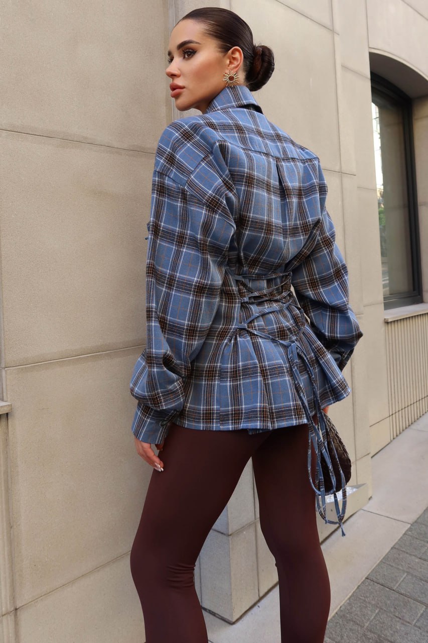 Женская Свободная Клетчатая Синяя Рубашка Сьют с Рюшами и Шнуровкой на Спине