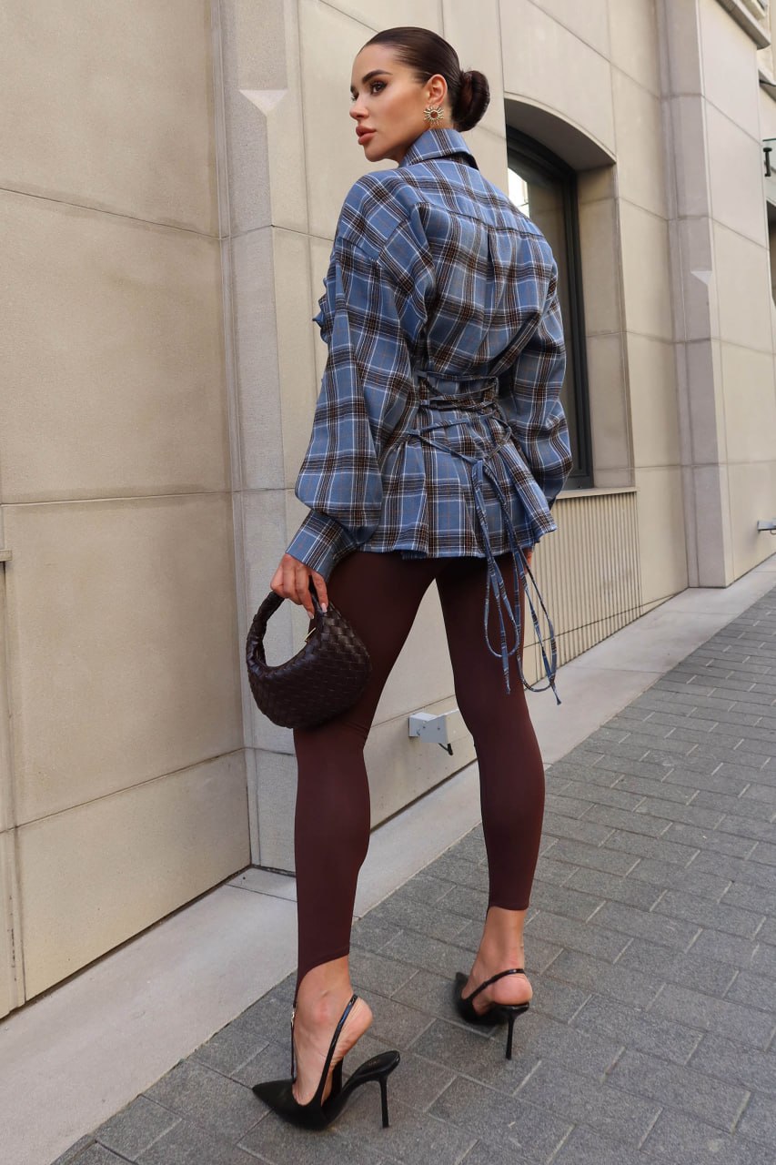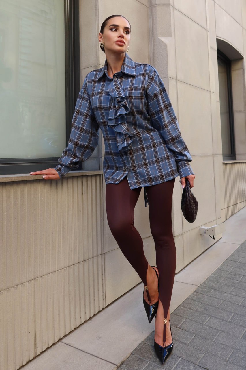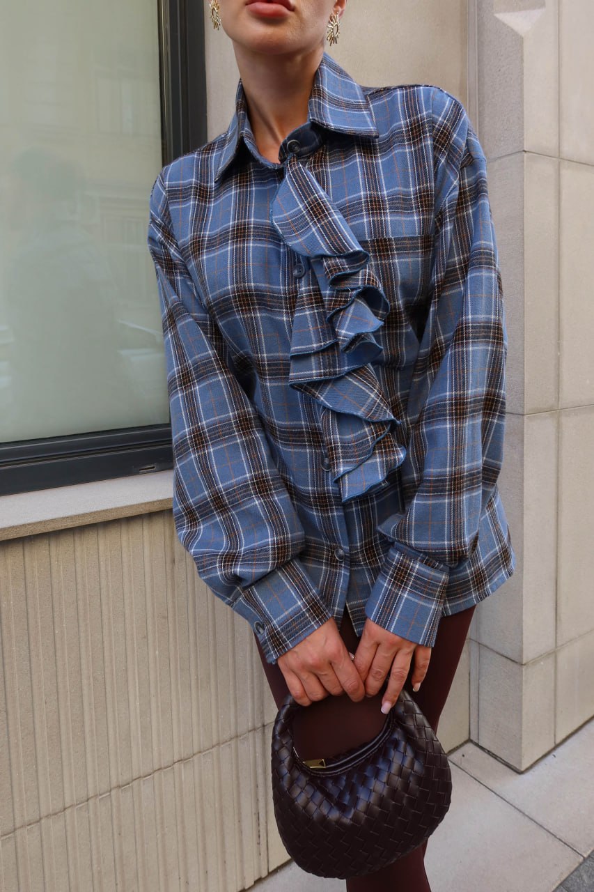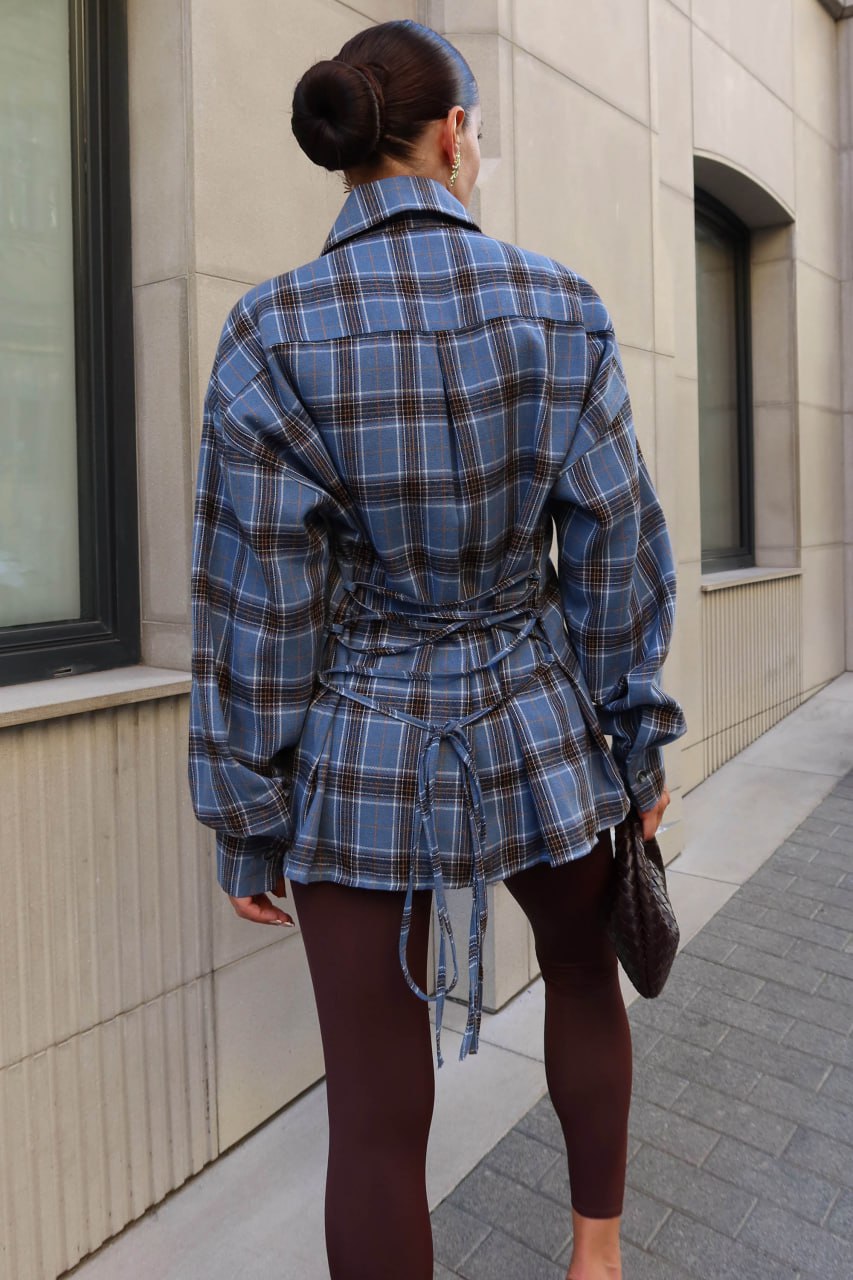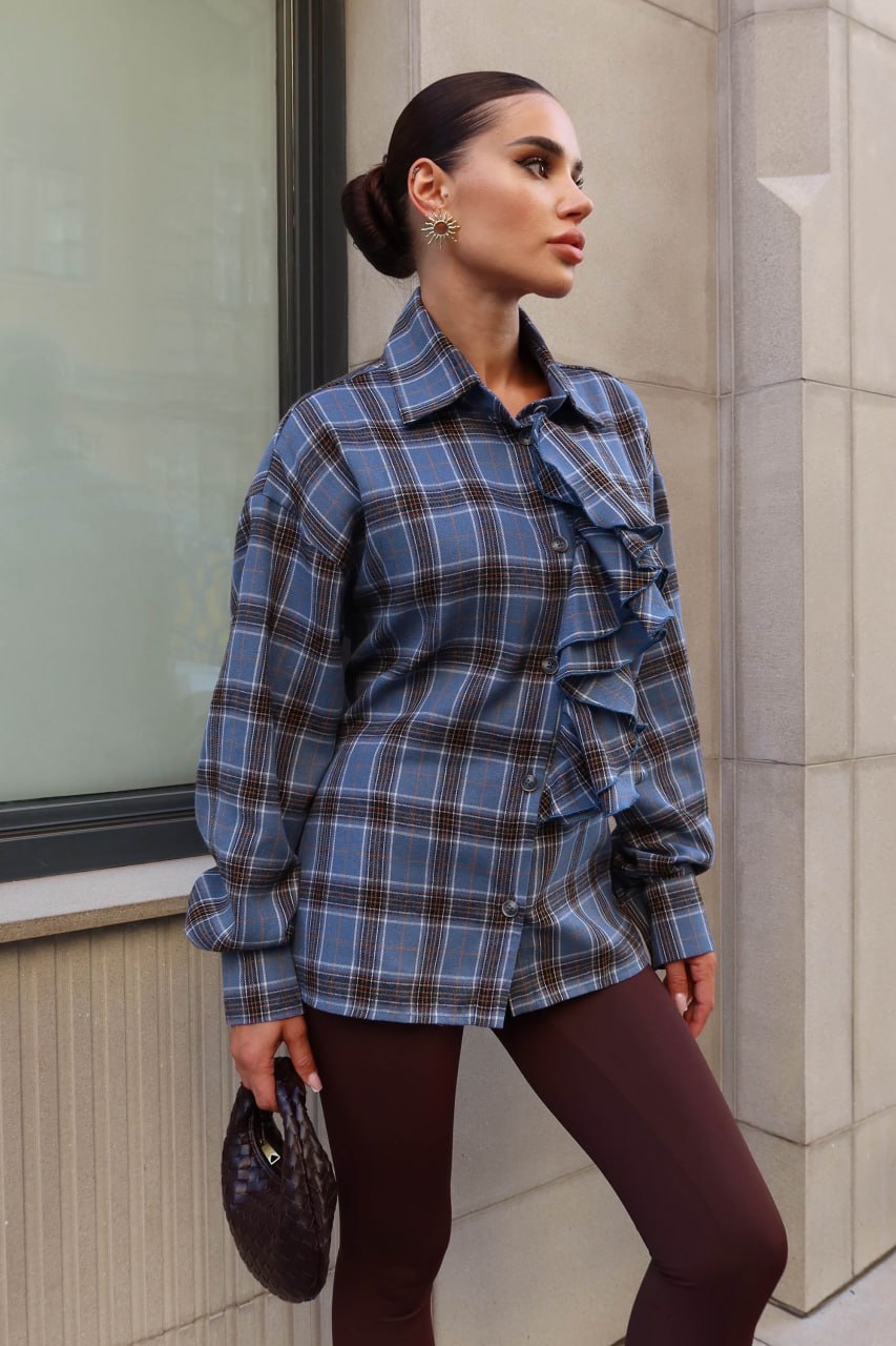 Женская Свободная Клетчатая Синяя Рубашка Сьют с Рюшами и Шнуровкой на Спине