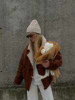 Женская Базовая Бежевая Шапка Объемной Вязки с Отворотом