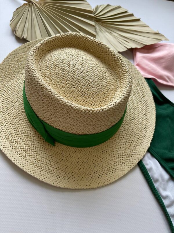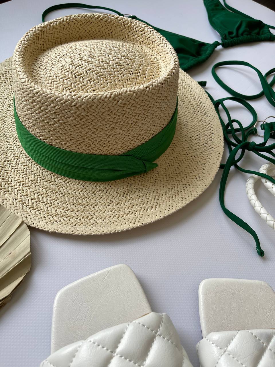 Женская Соломенная Шляпа Канотье с Зеленой Лентой