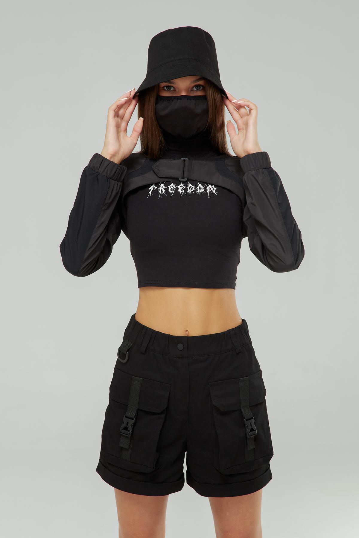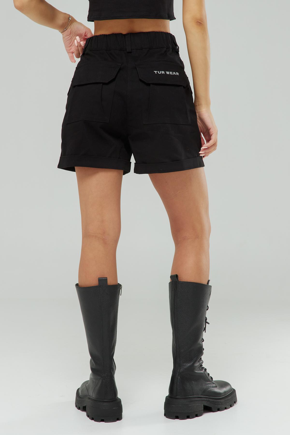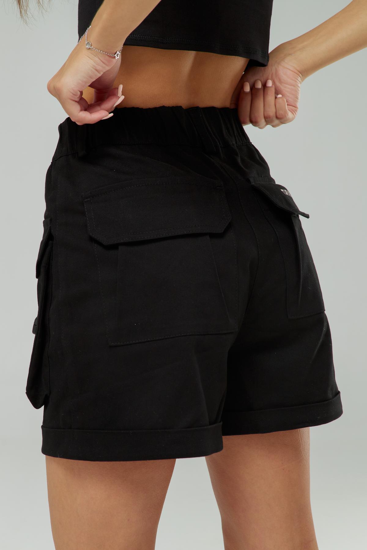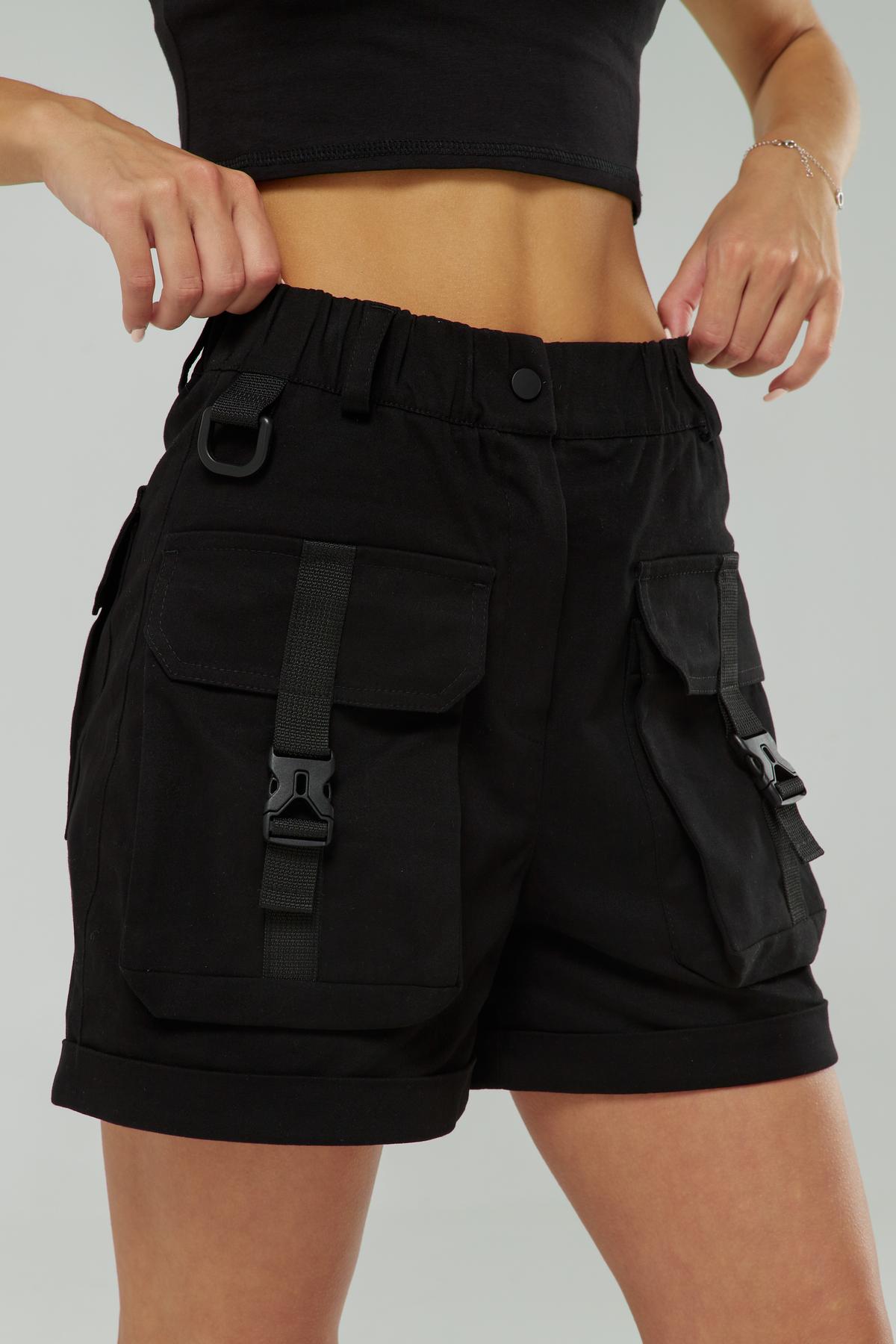 Женские Черные Шорты Карго на Резинке с Высокой Посадкой и Большими Накладными Карманами