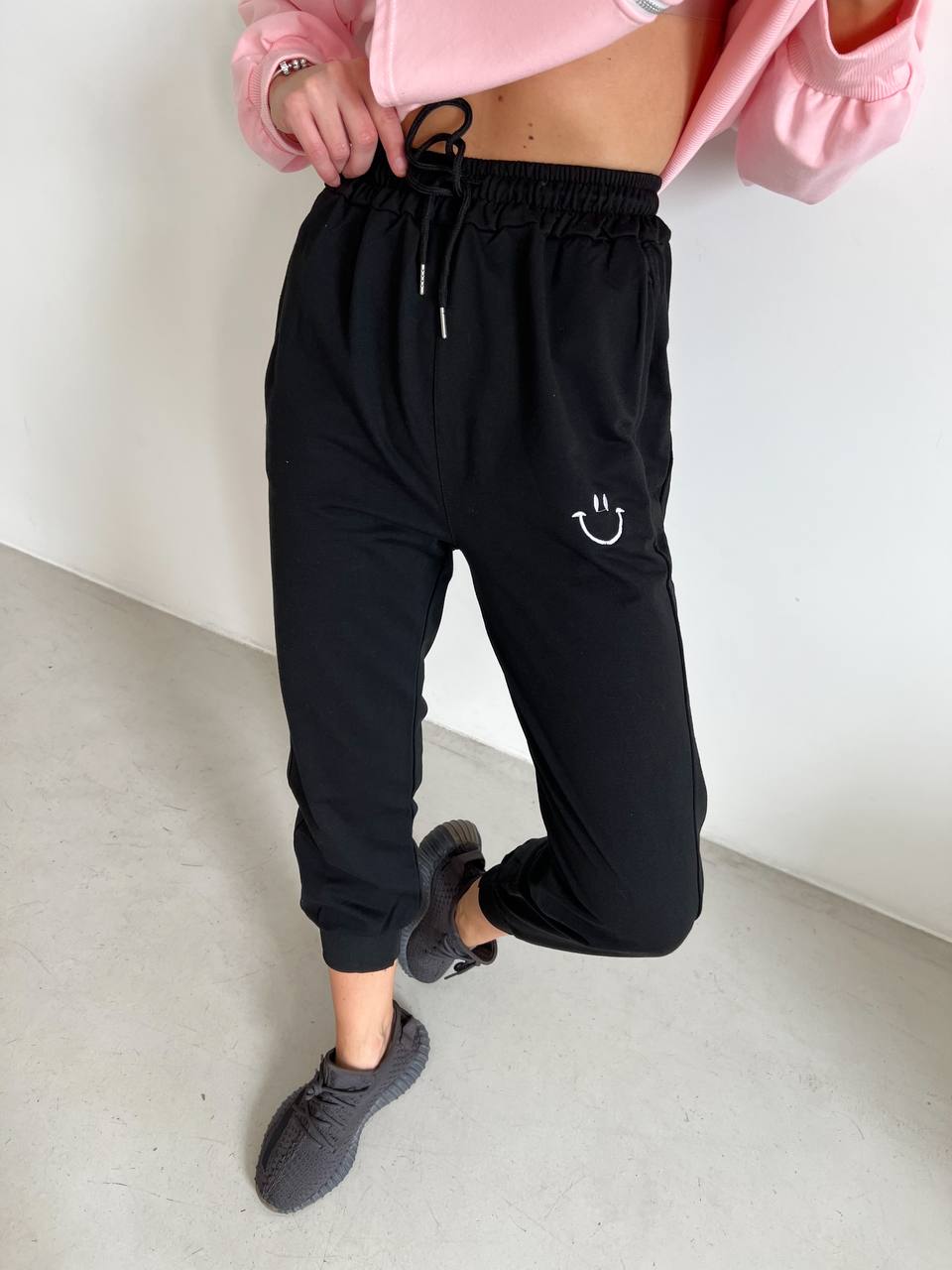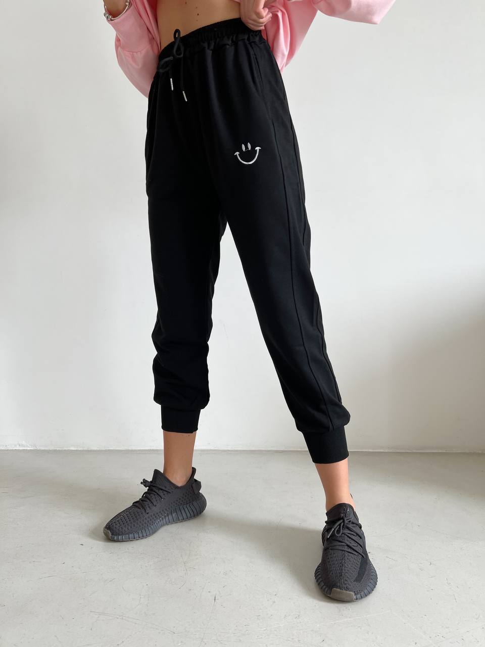 Женские Трикотажные Черные Штаны Джоггеры с Принтом Смайл