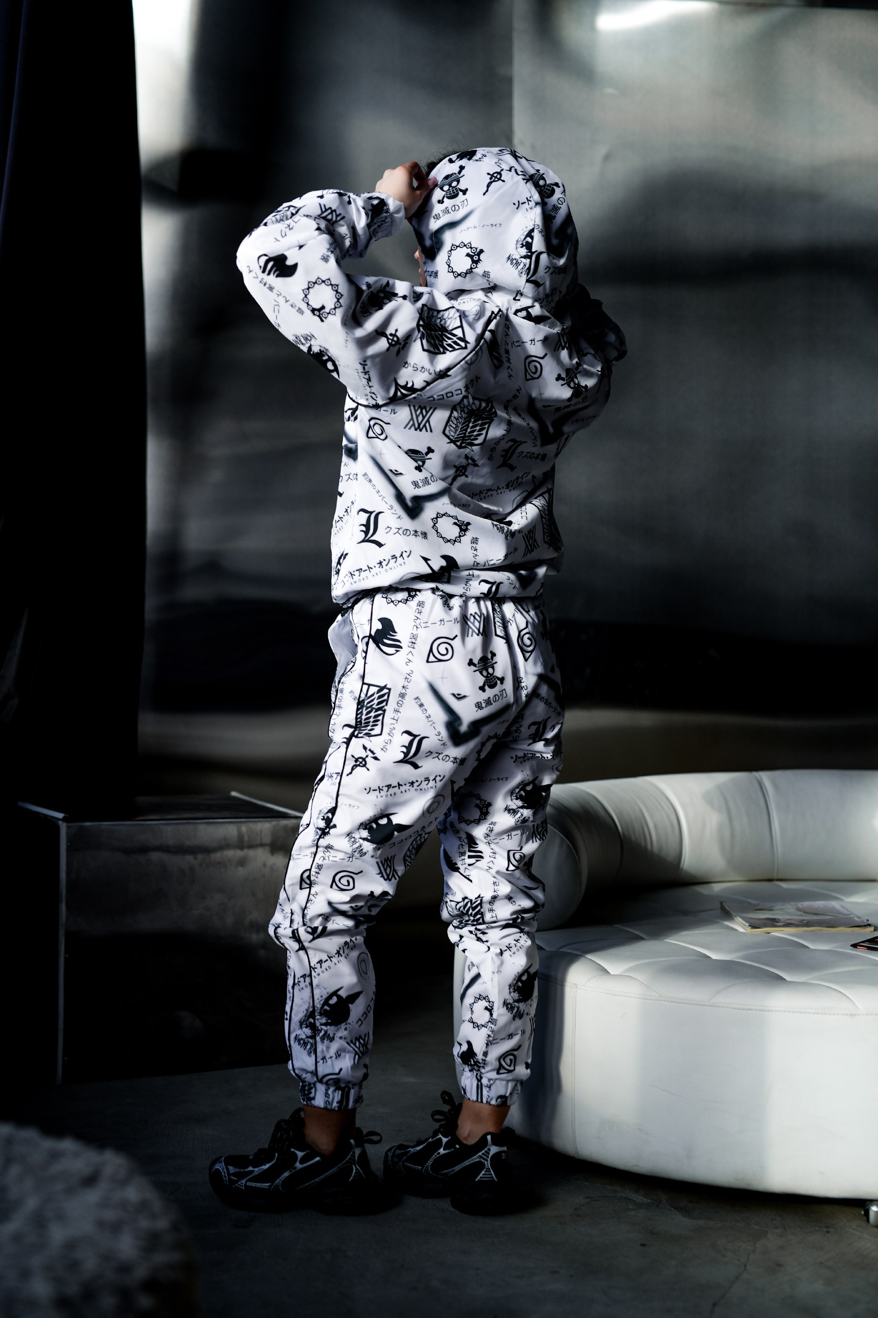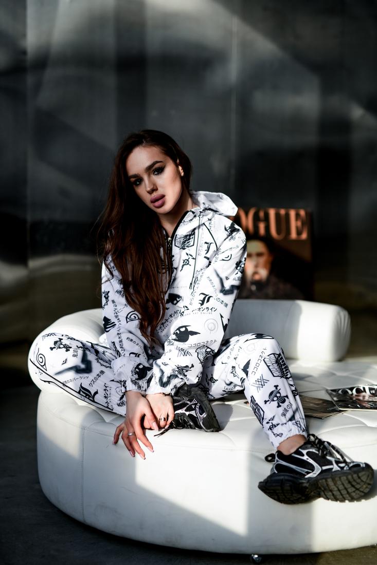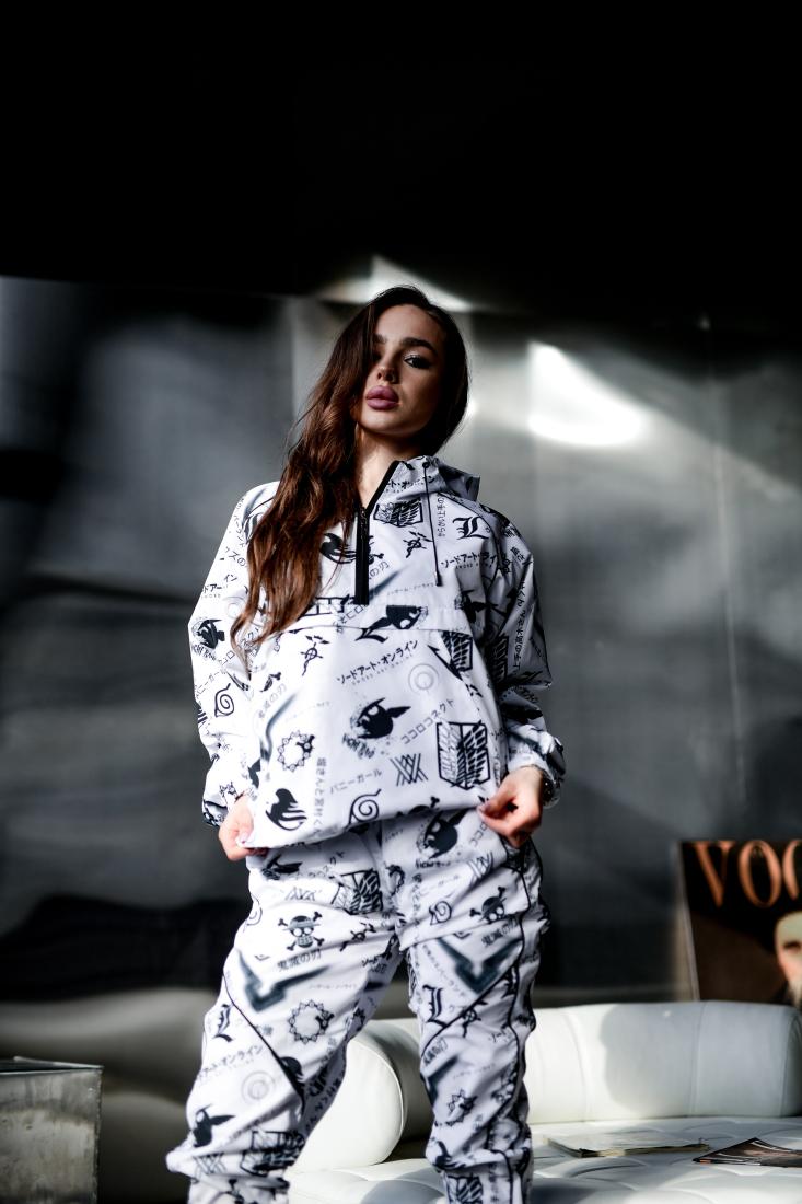 Женский Белый Спортивный Костюм Плащевка в Принт с Кантом (Анорак + Джоггеры)