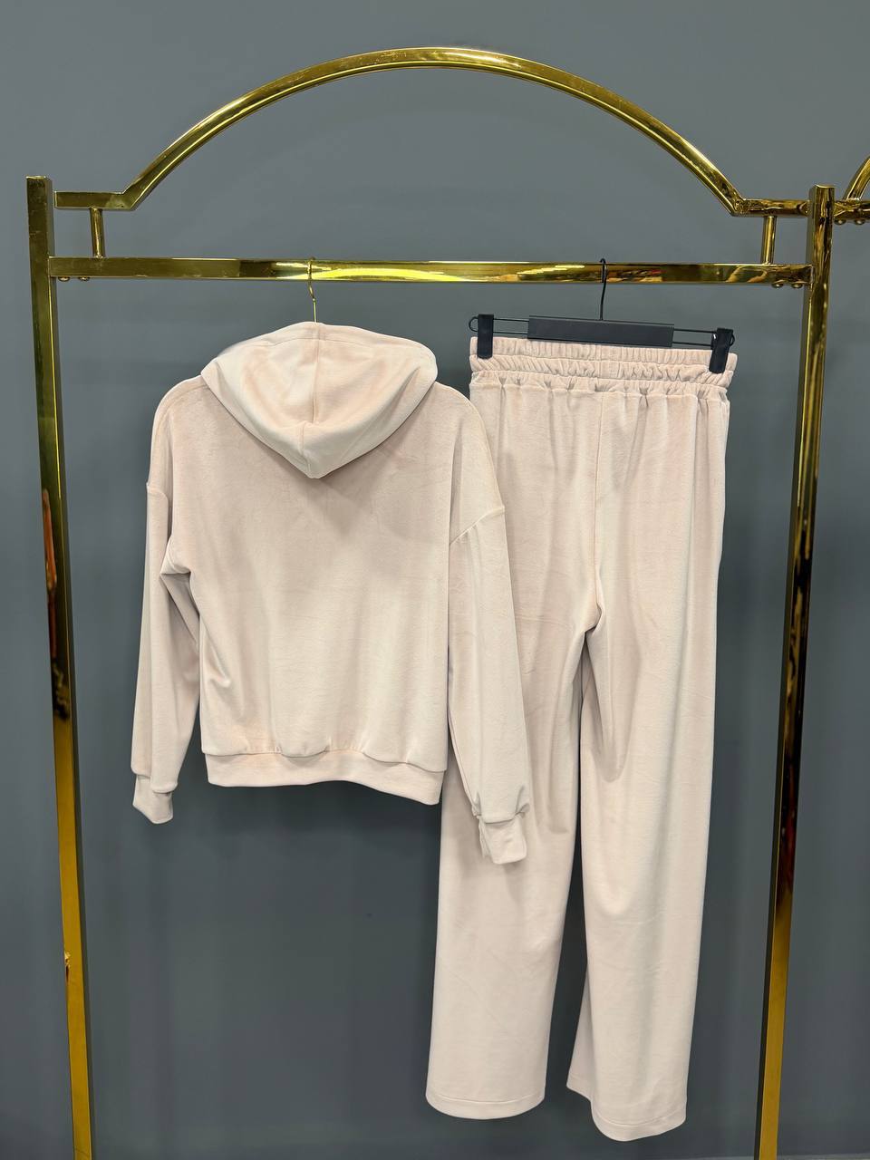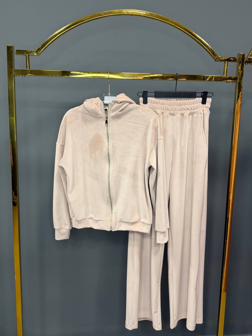 Женский Бежевый Велюровый Костюм – Кофта Зипка на Молнии + Штаны Свободного Кроя