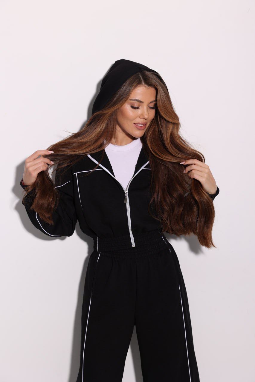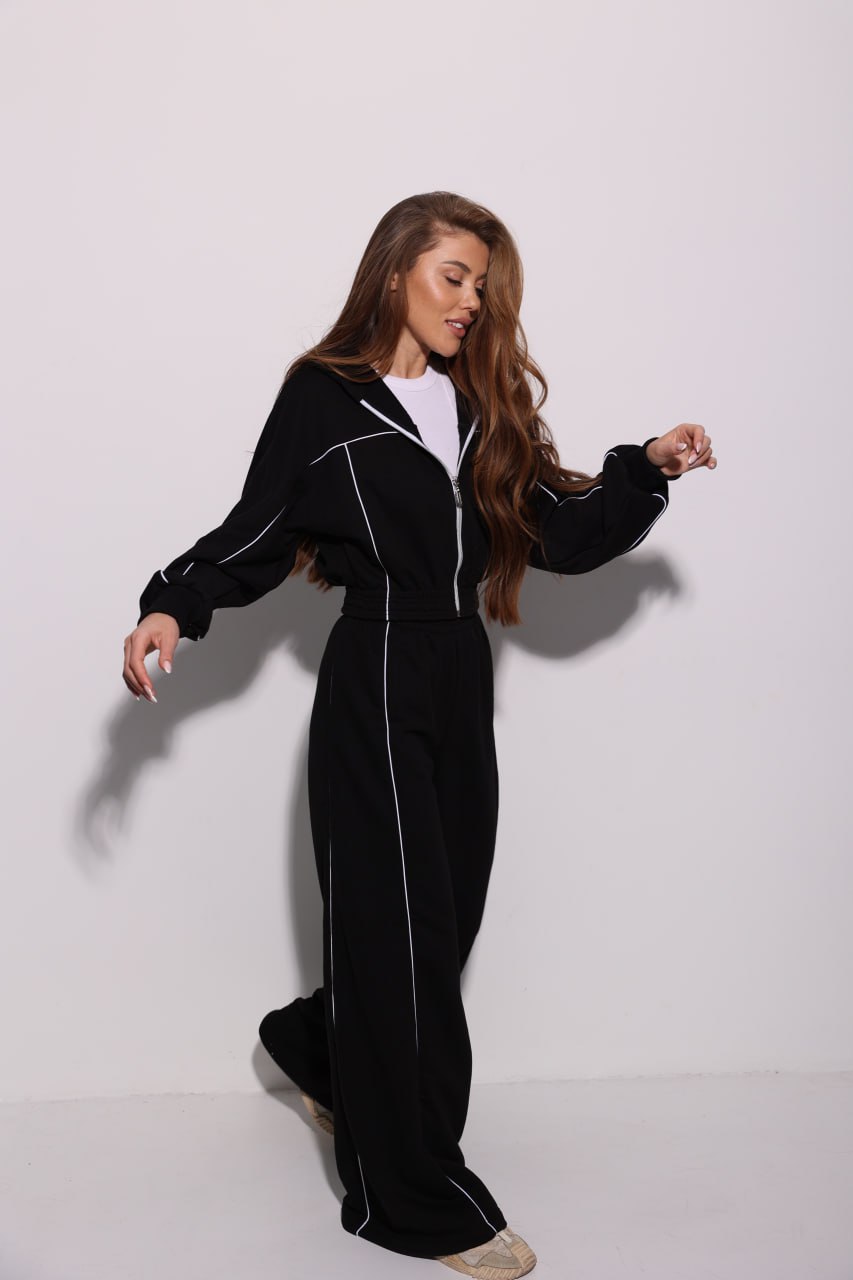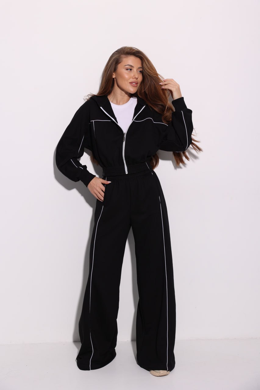 Женский Черный Спортивный Костюм Оверсайз с Кантом – Зип Кофта + Широкие Штаны