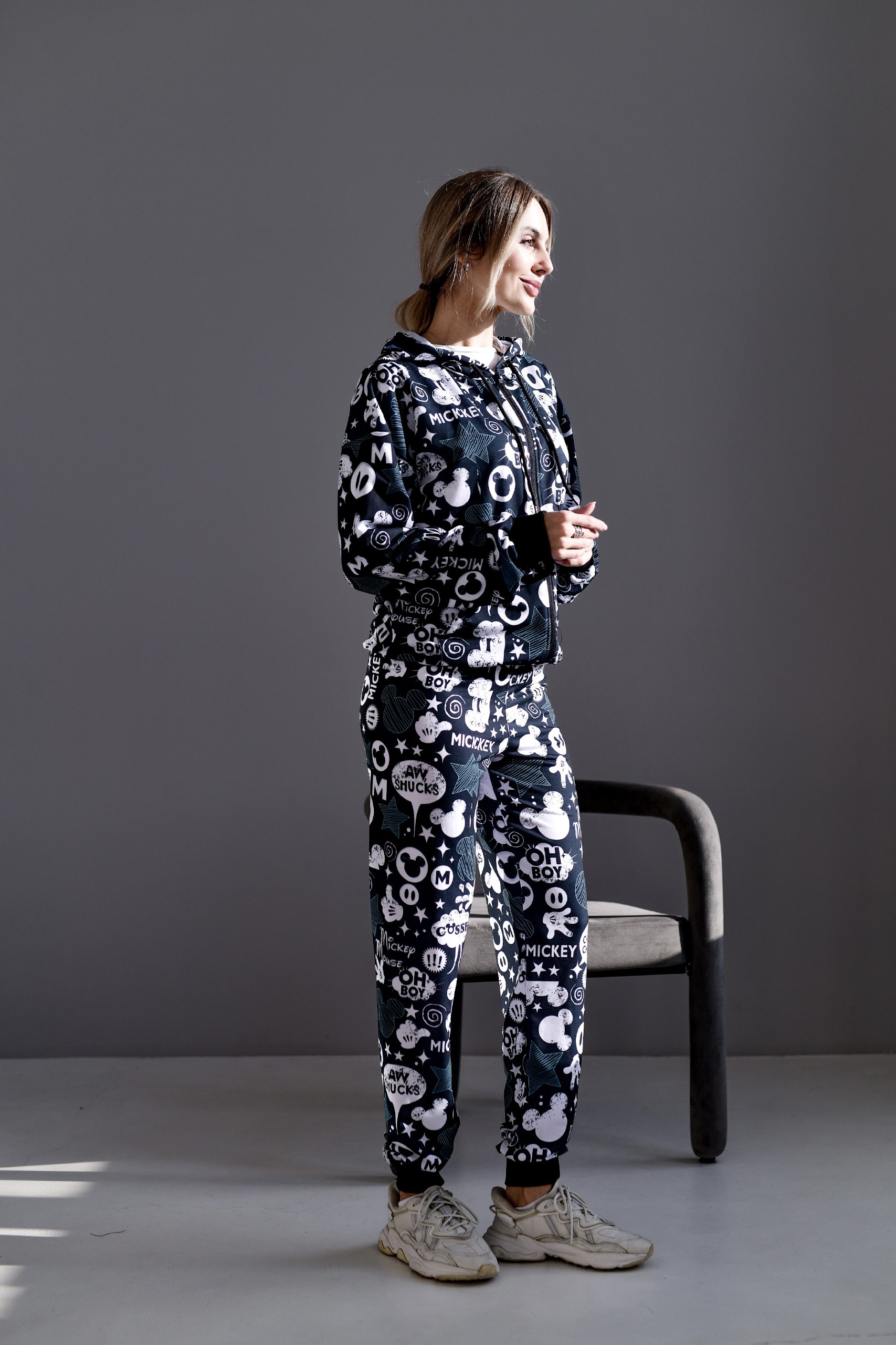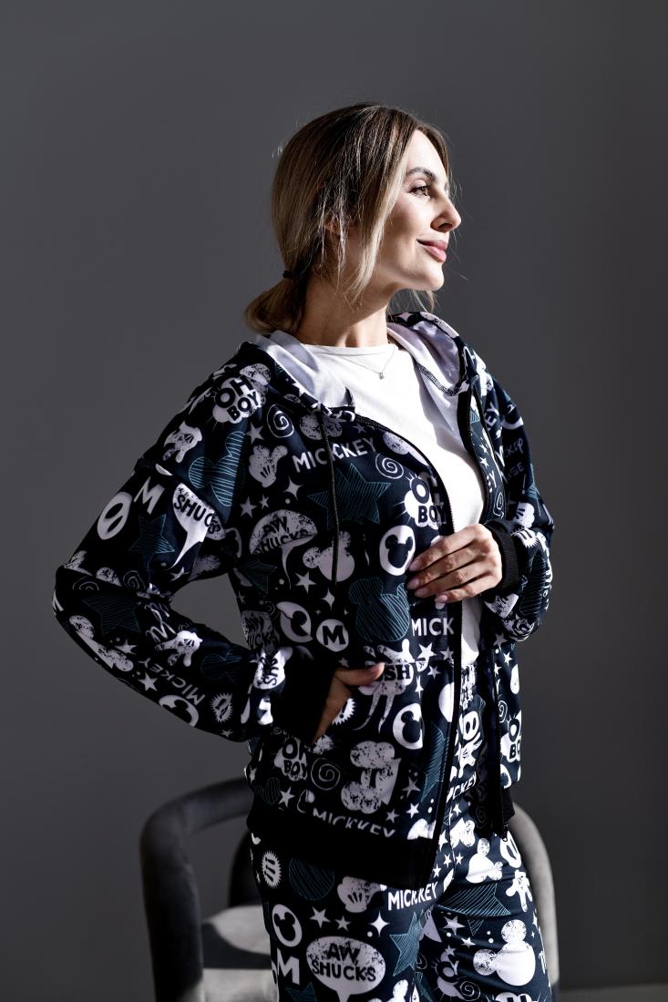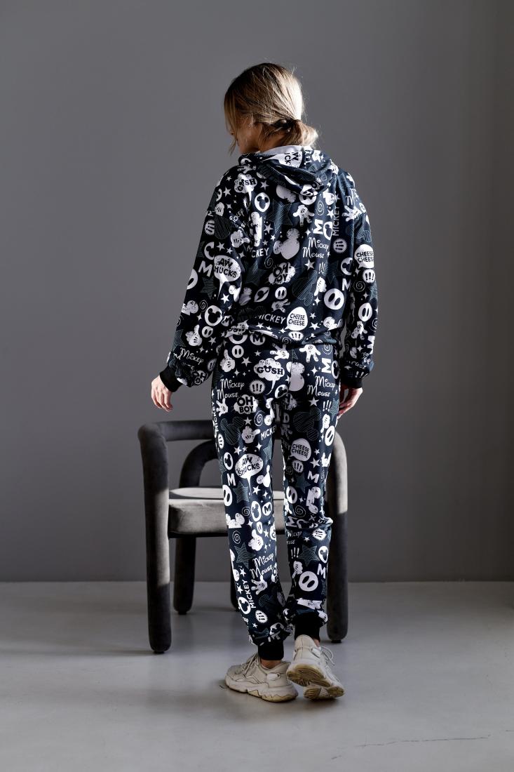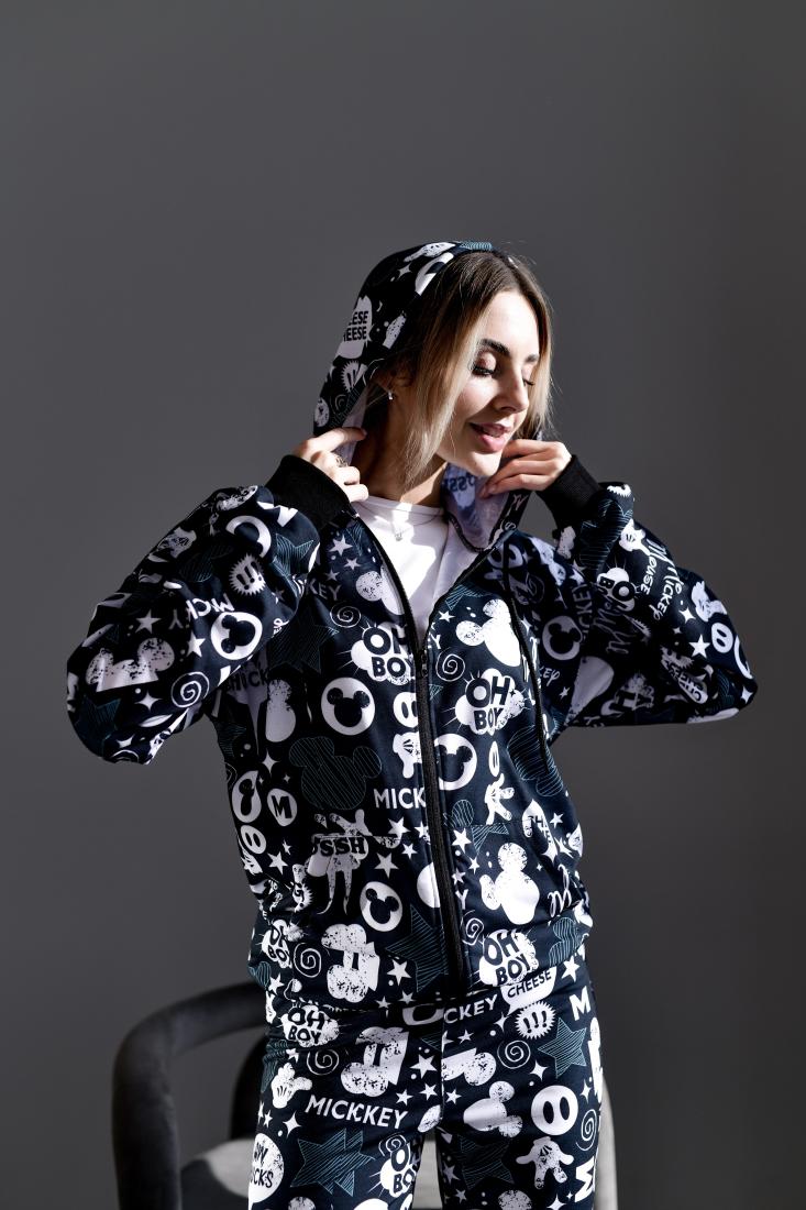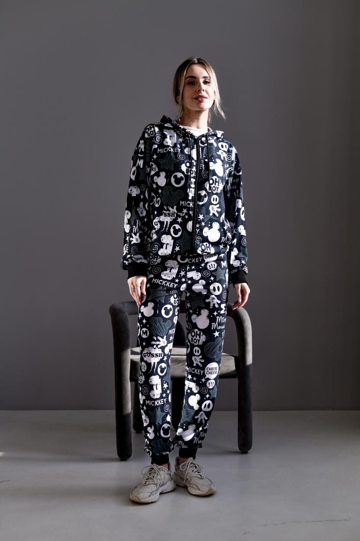 Женский Черный Спортивный Костюм в Принт – Зип Кофта на Молнии + Штаны Джоггеры