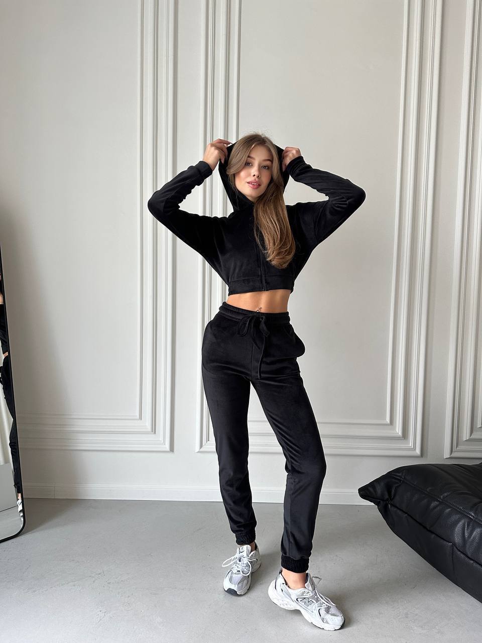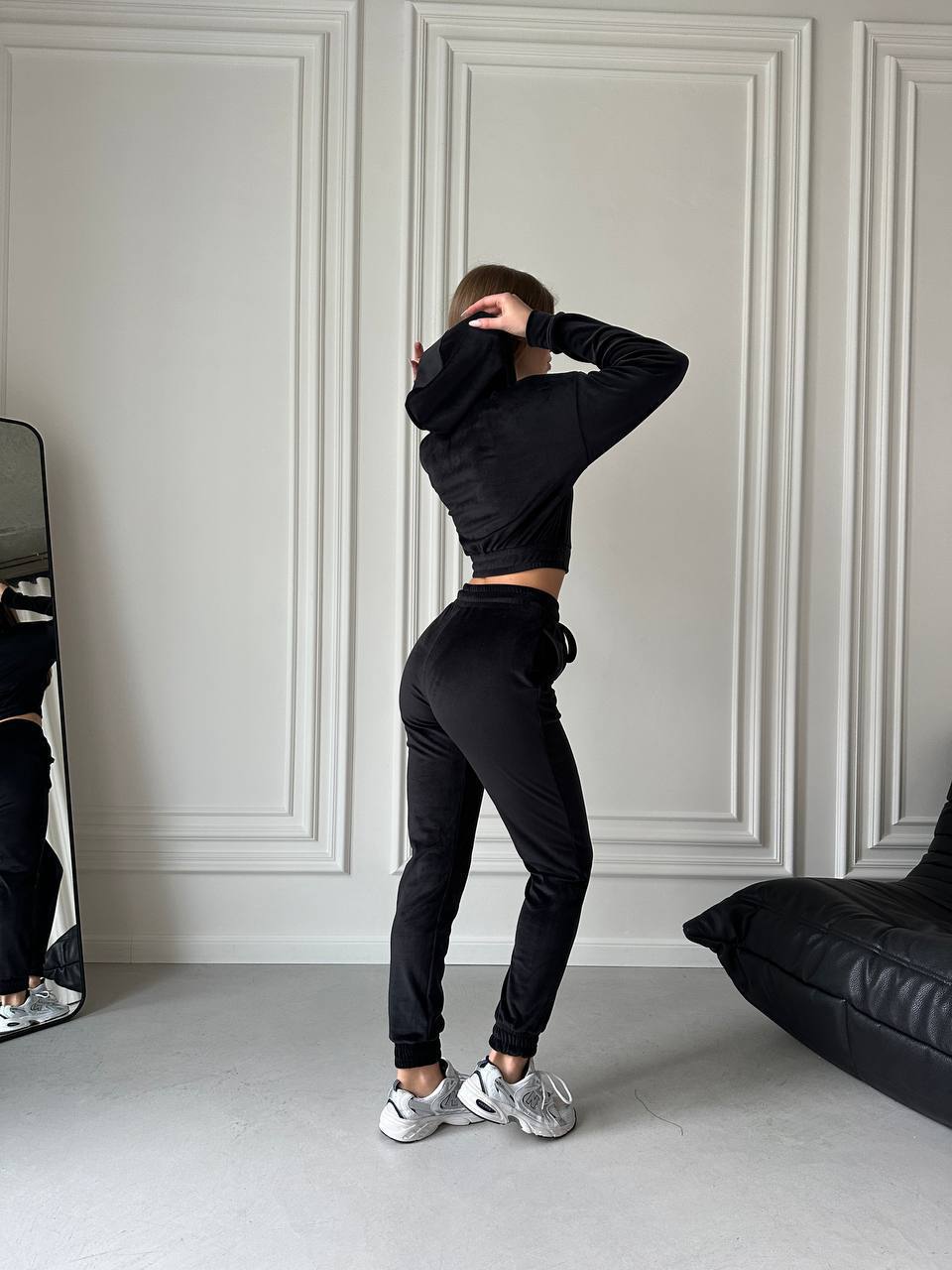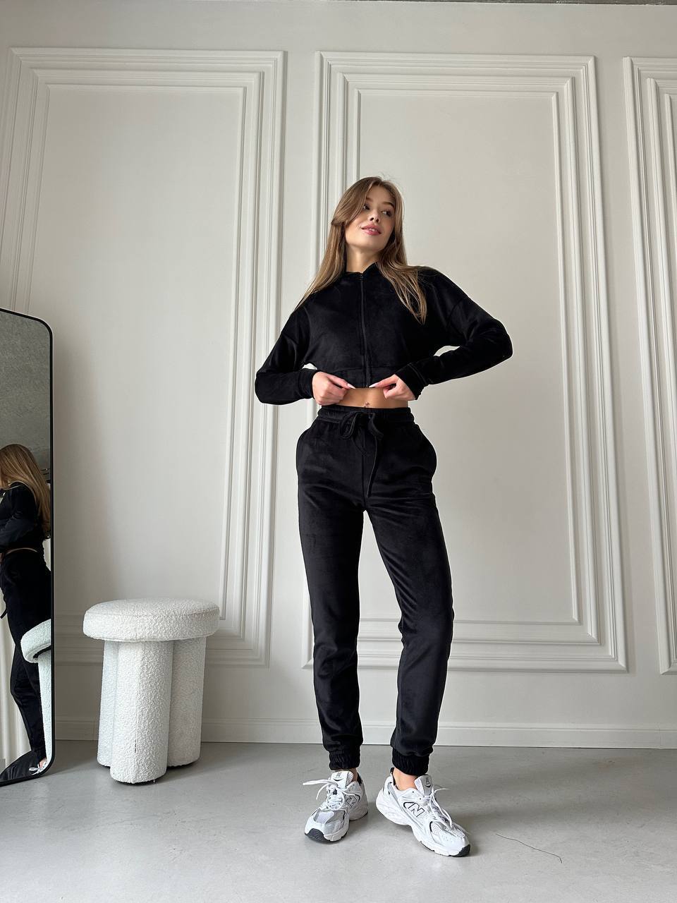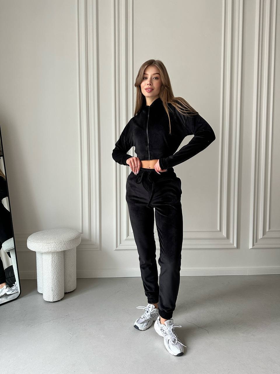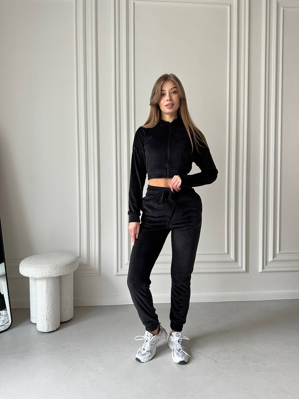 Женский Черный Велюровый Спортивный Костюм – Укороченная Кофта на Молнии + Штаны Джоггеры