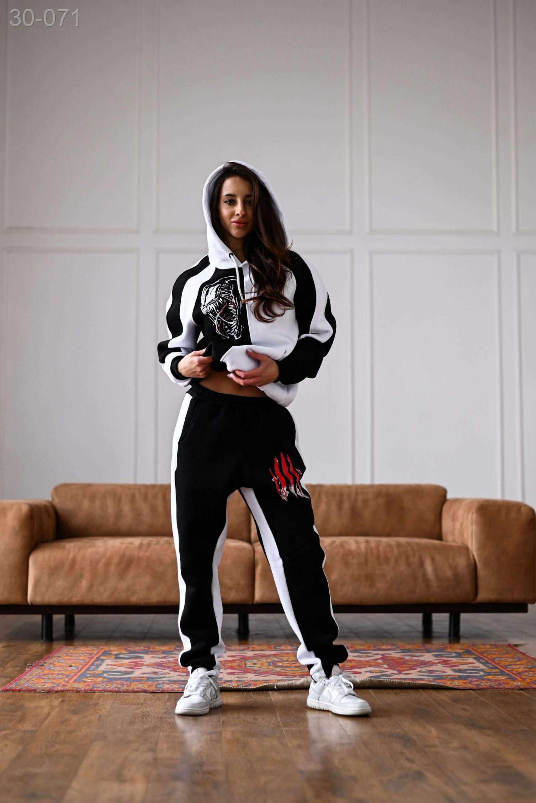 Женский Чорно-Белый Спортивный Костюм с Принтами – Утепленный на Флисе