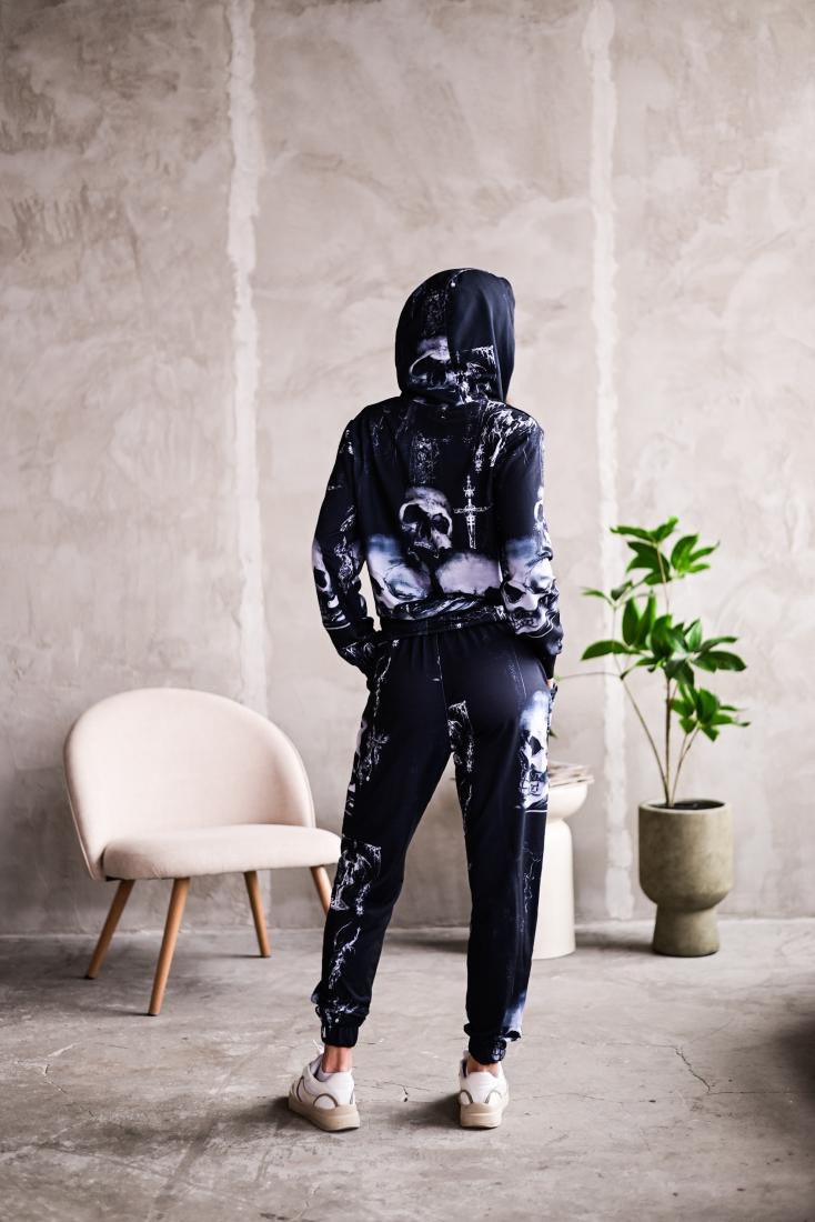 Женский Черный Спортивный Костюм Худи Джоггеры – Двунитка в Принт Черепах