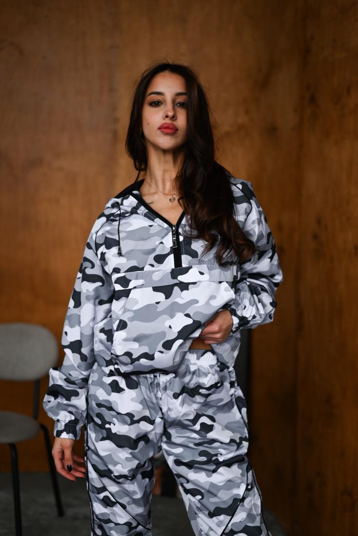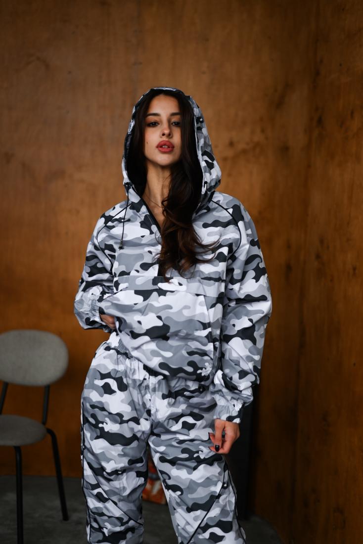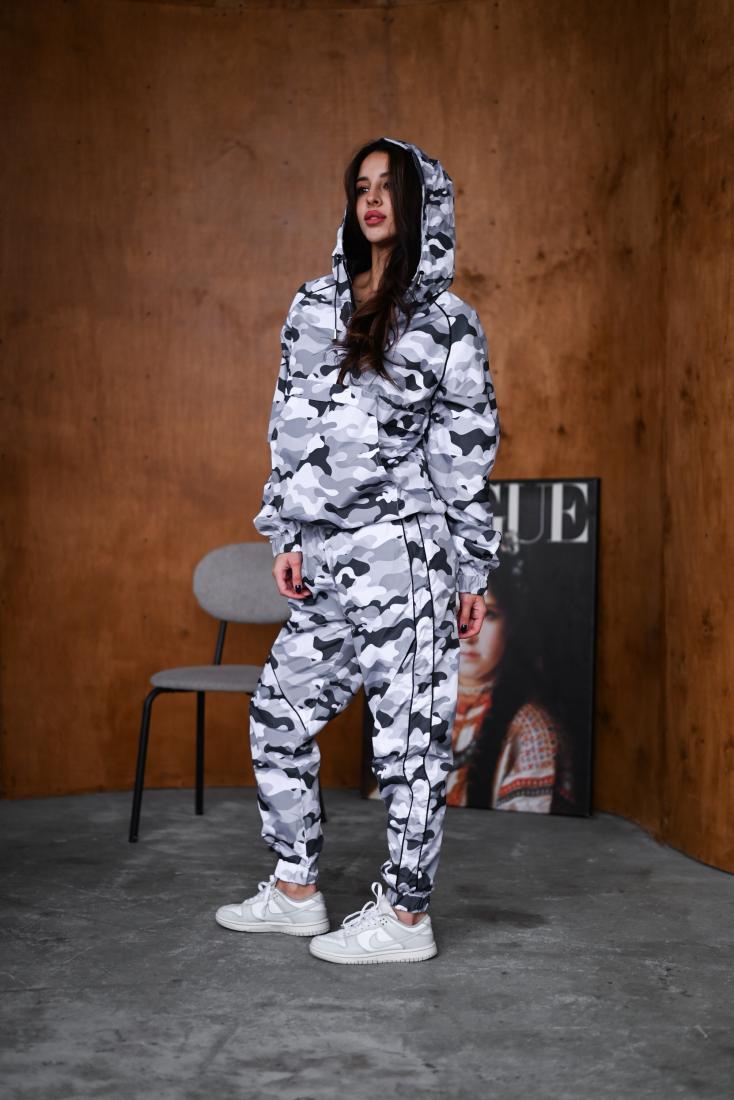 Женский Камуфляжный Серый Спортивный Костюм Плащевка с Кантом – Анорак с Капюшоном + Штаны Джоггеры