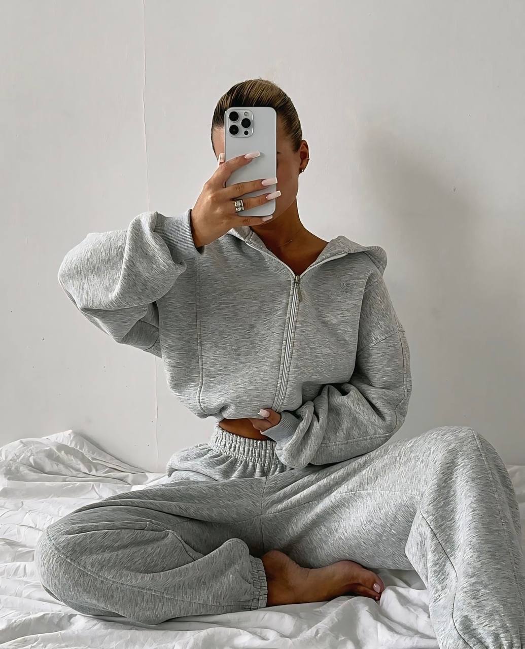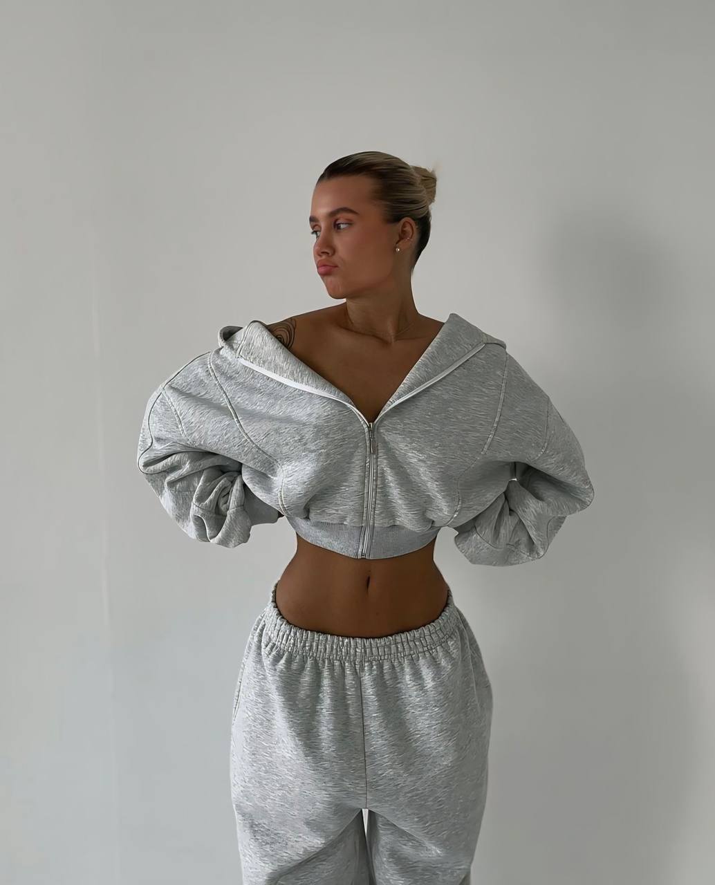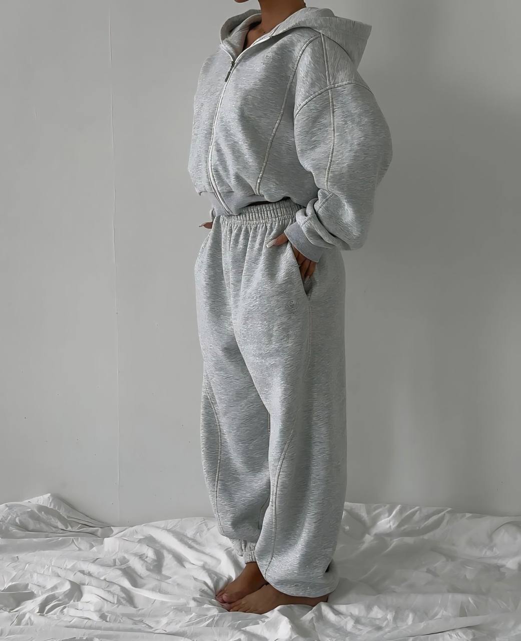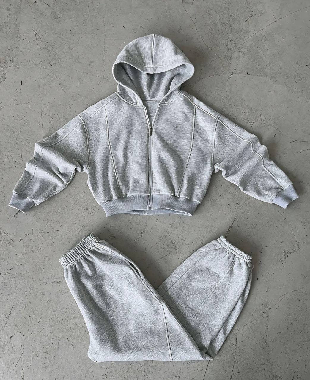 Женский Серый Спортивный Костюм Оверсайз – Укороченное Зип Худи + Широкие Штаны