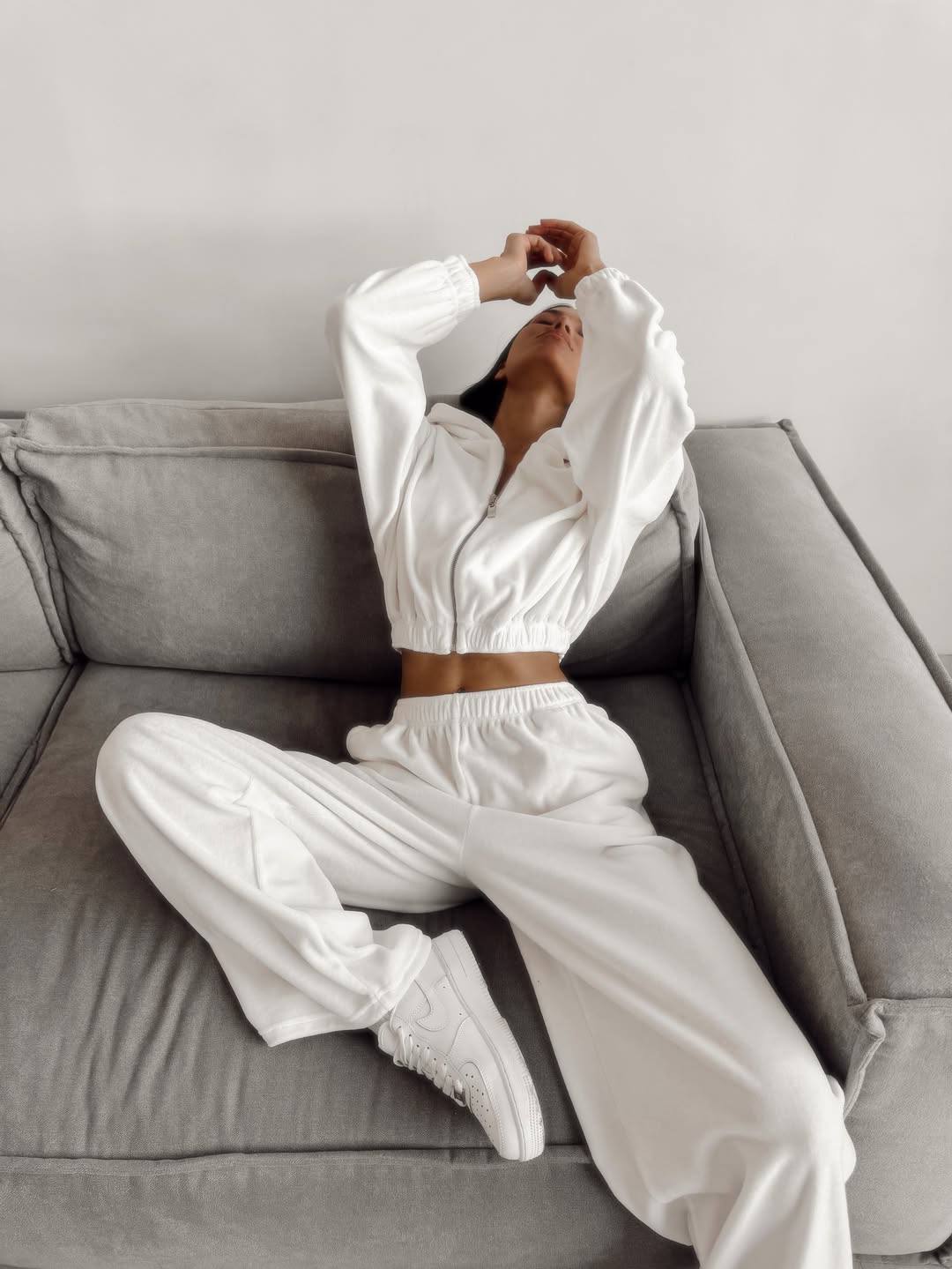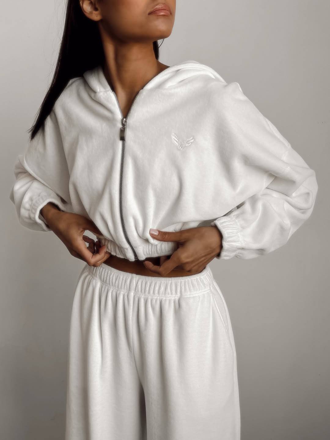 Женский Свободный Велюровый Белый Костюм – Укороченная Зип Кофта + Широкие Штаны на Затяжках