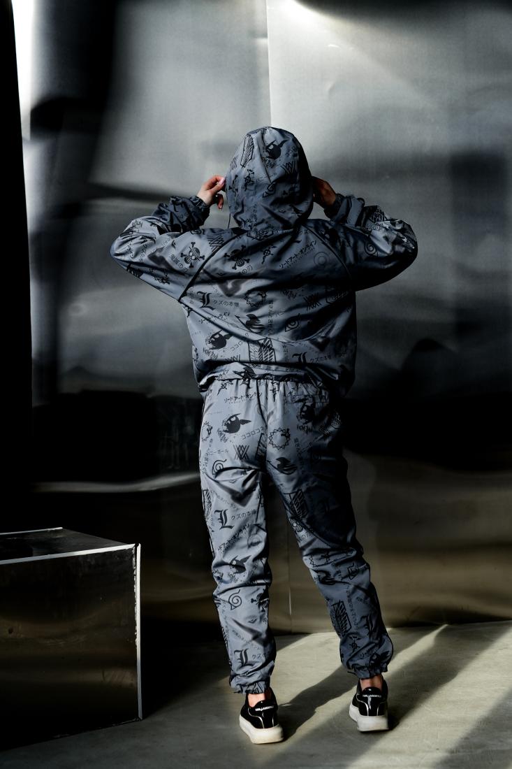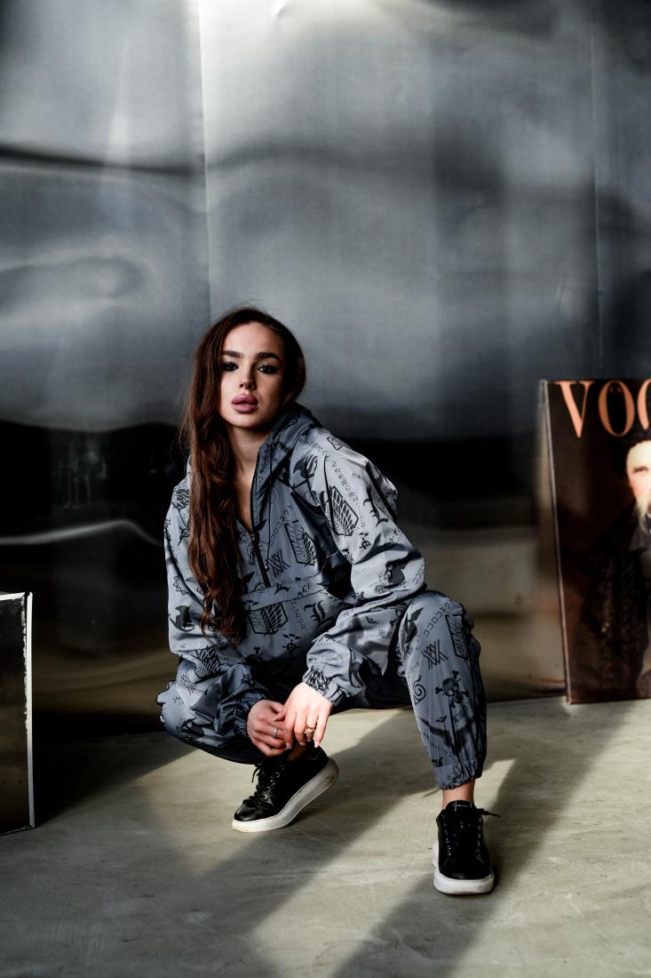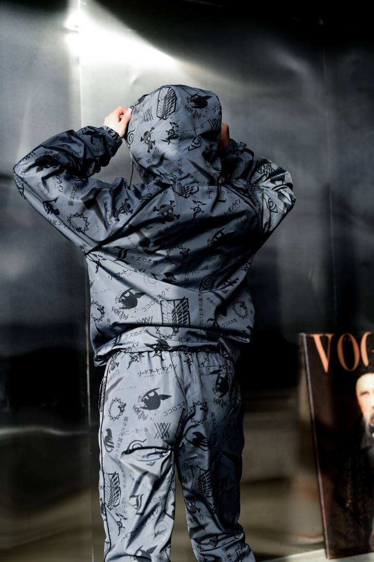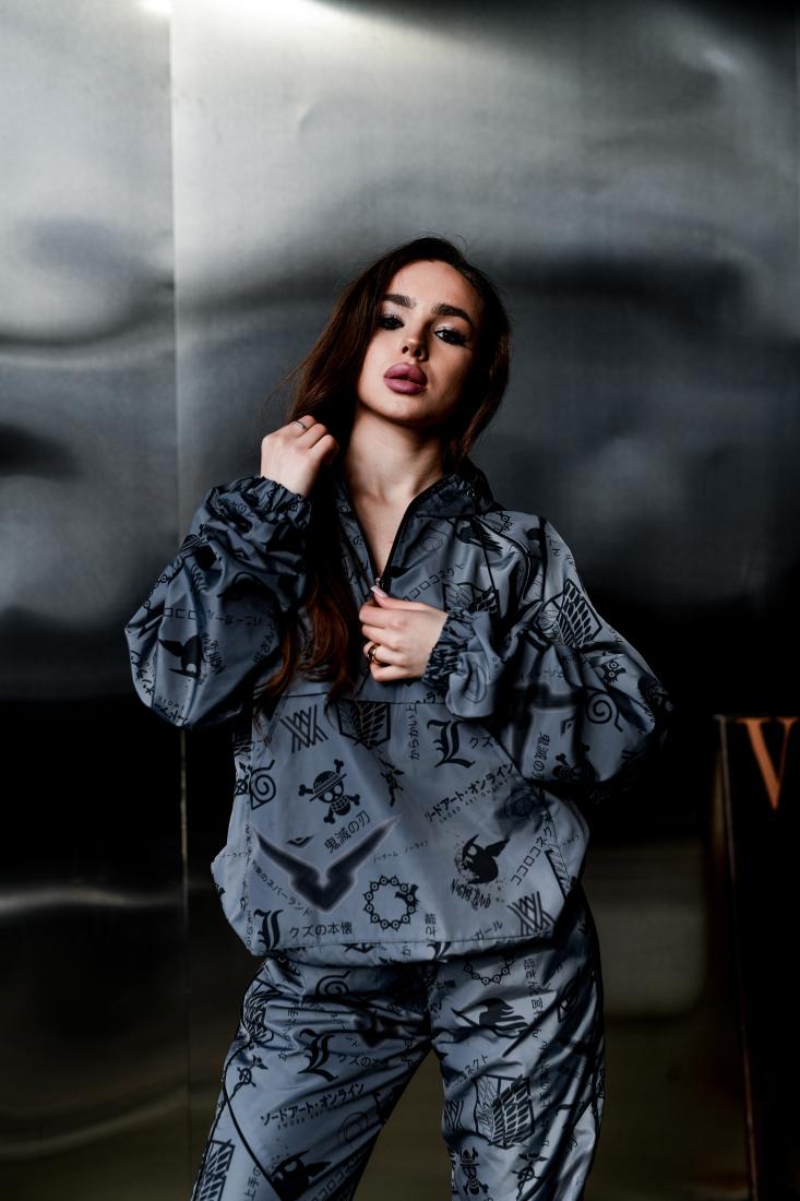Женский Темно-Серый Спортивный Костюм Плащевка в Принтах с Кантом (Анорак + Джоггеры)