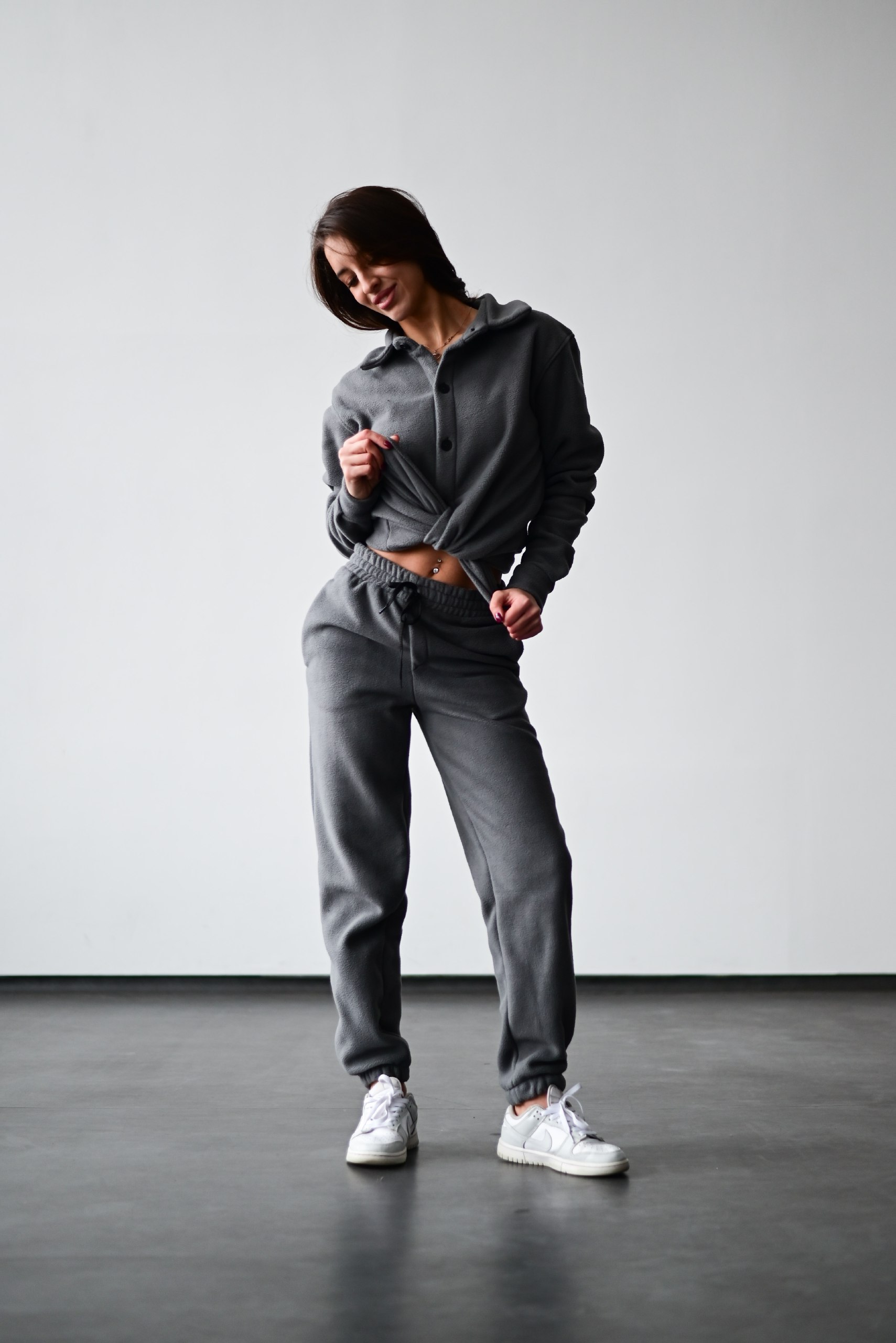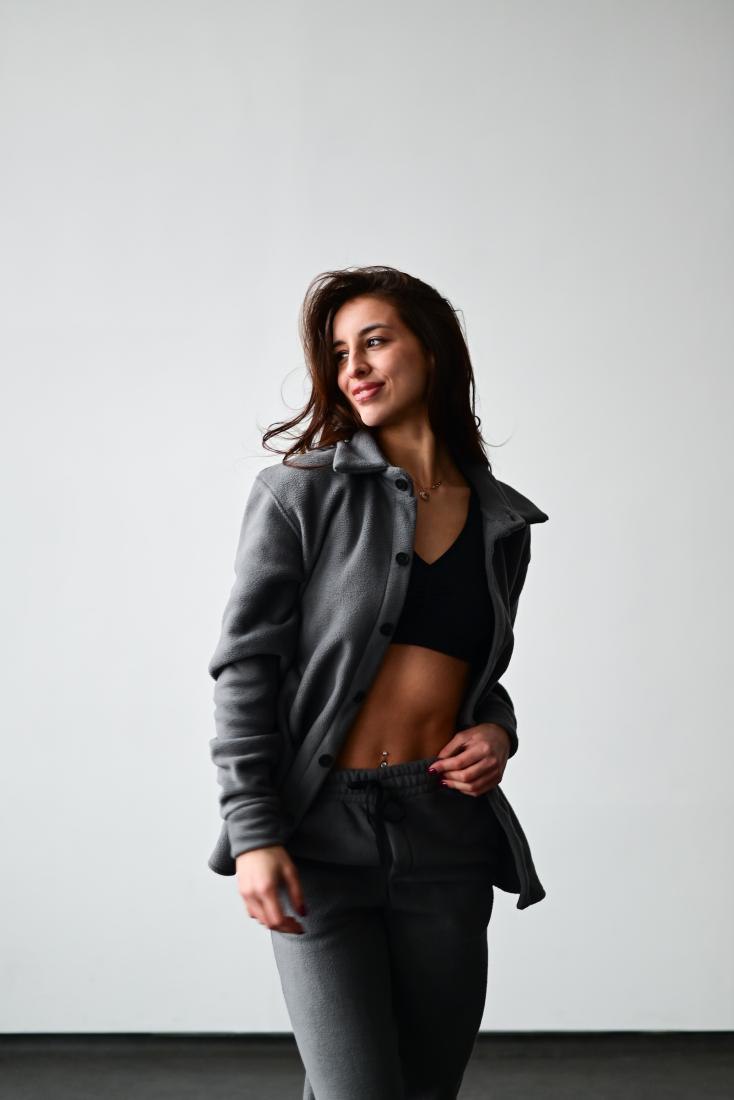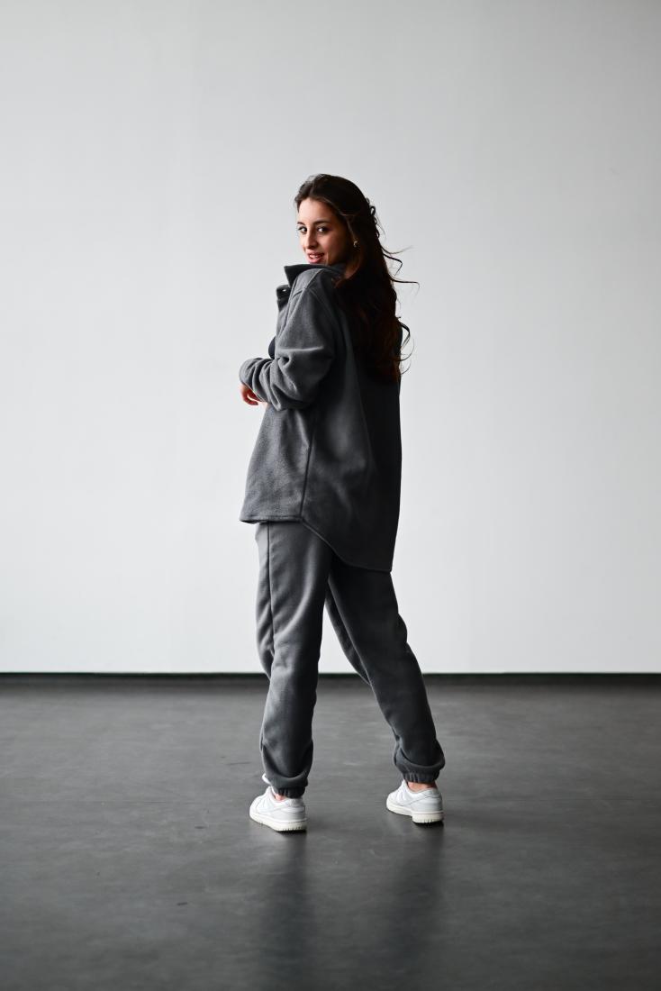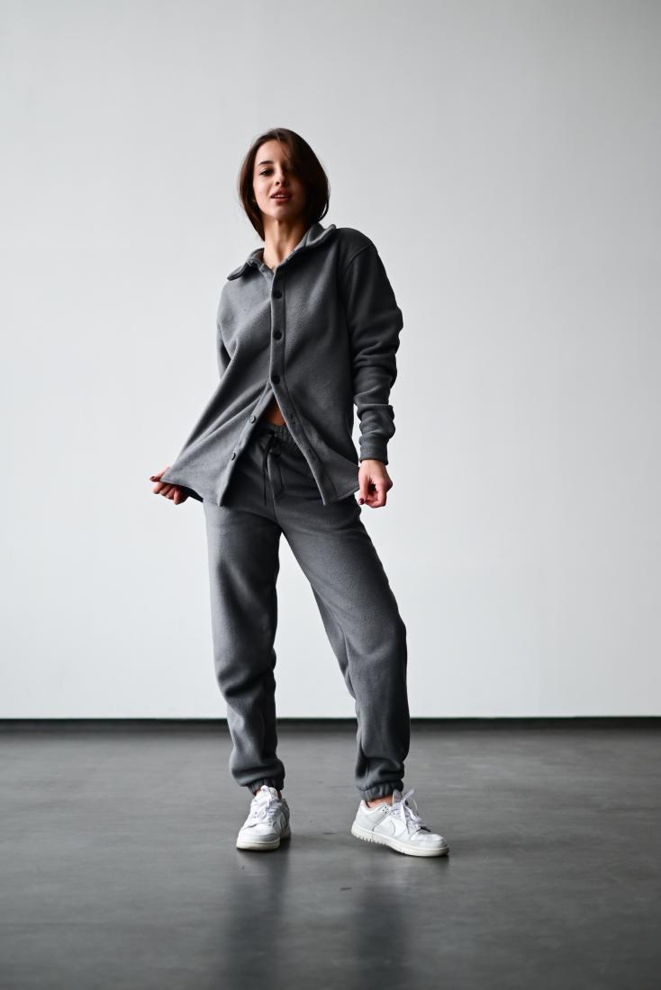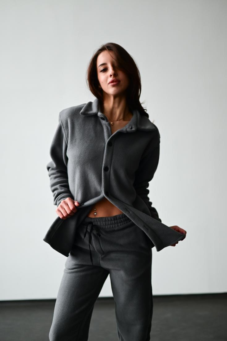 Женский Теплый Флисовый Темно-Серый Костюм – Рубашка + Штаны Джоггеры