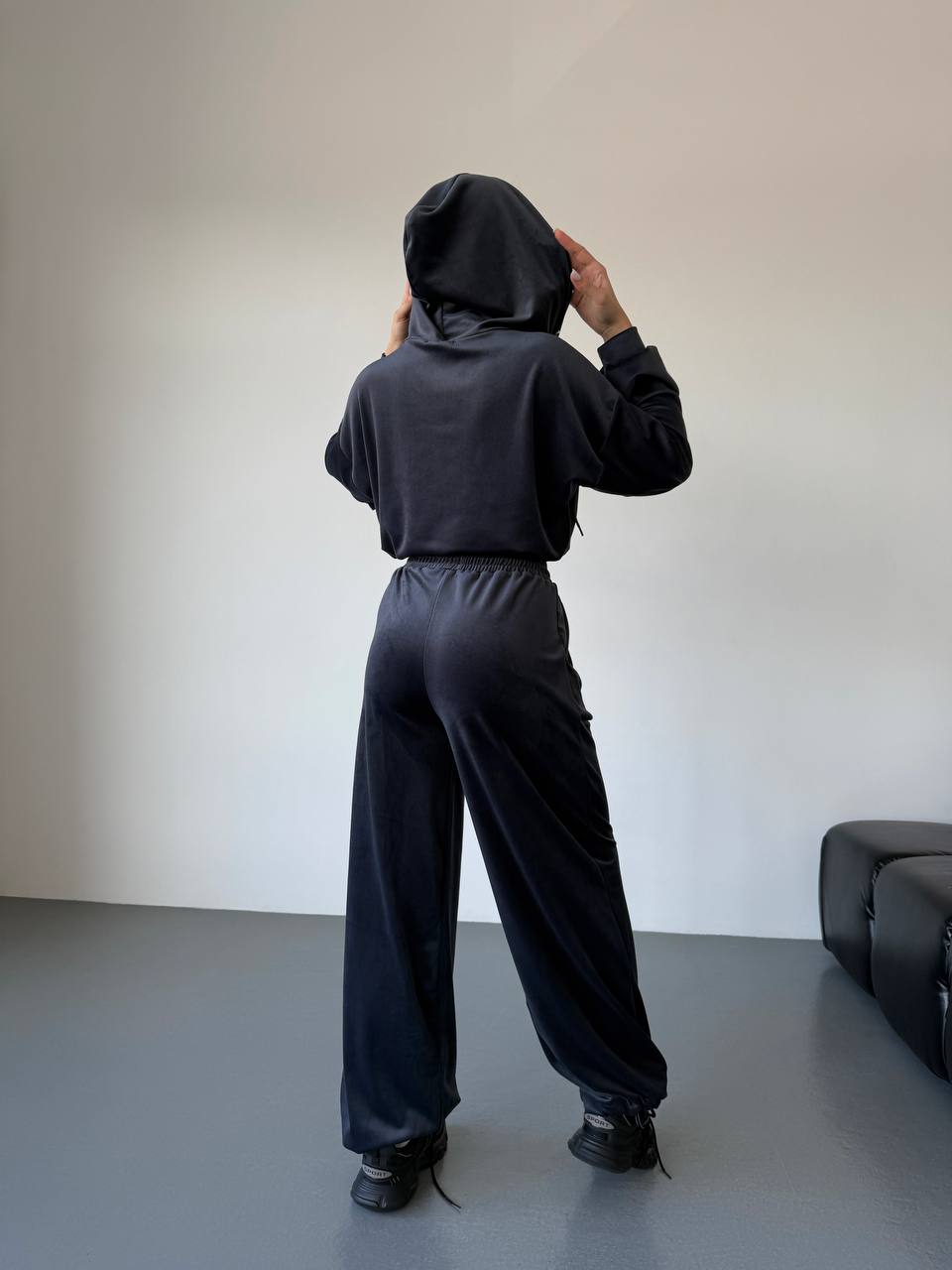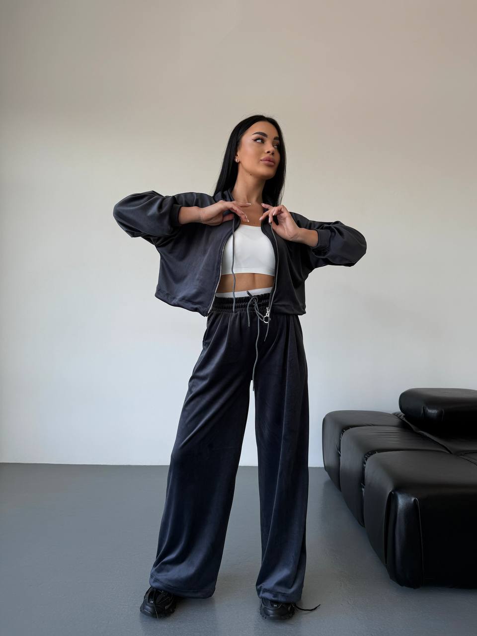 Женский Велюровый Графитовый Костюм Свободного Кроя – Укороченная Кофта на Молнии + Широкие Штаны