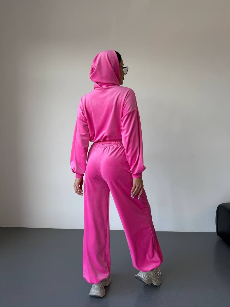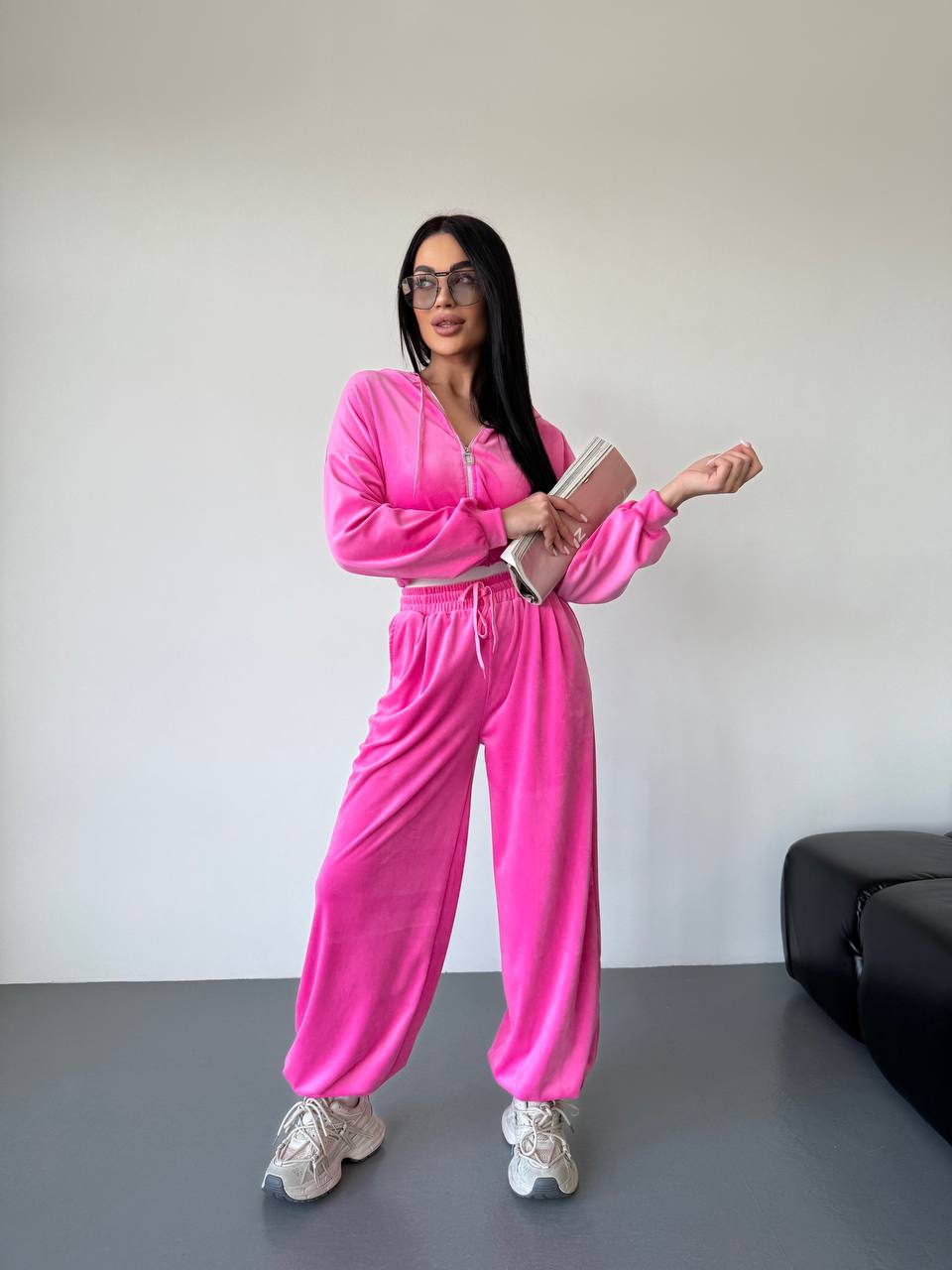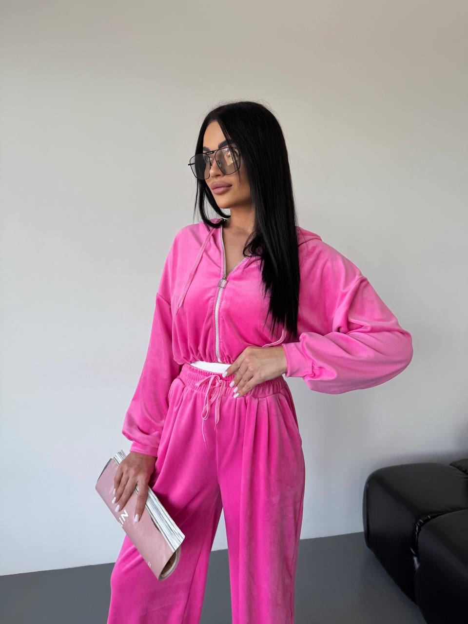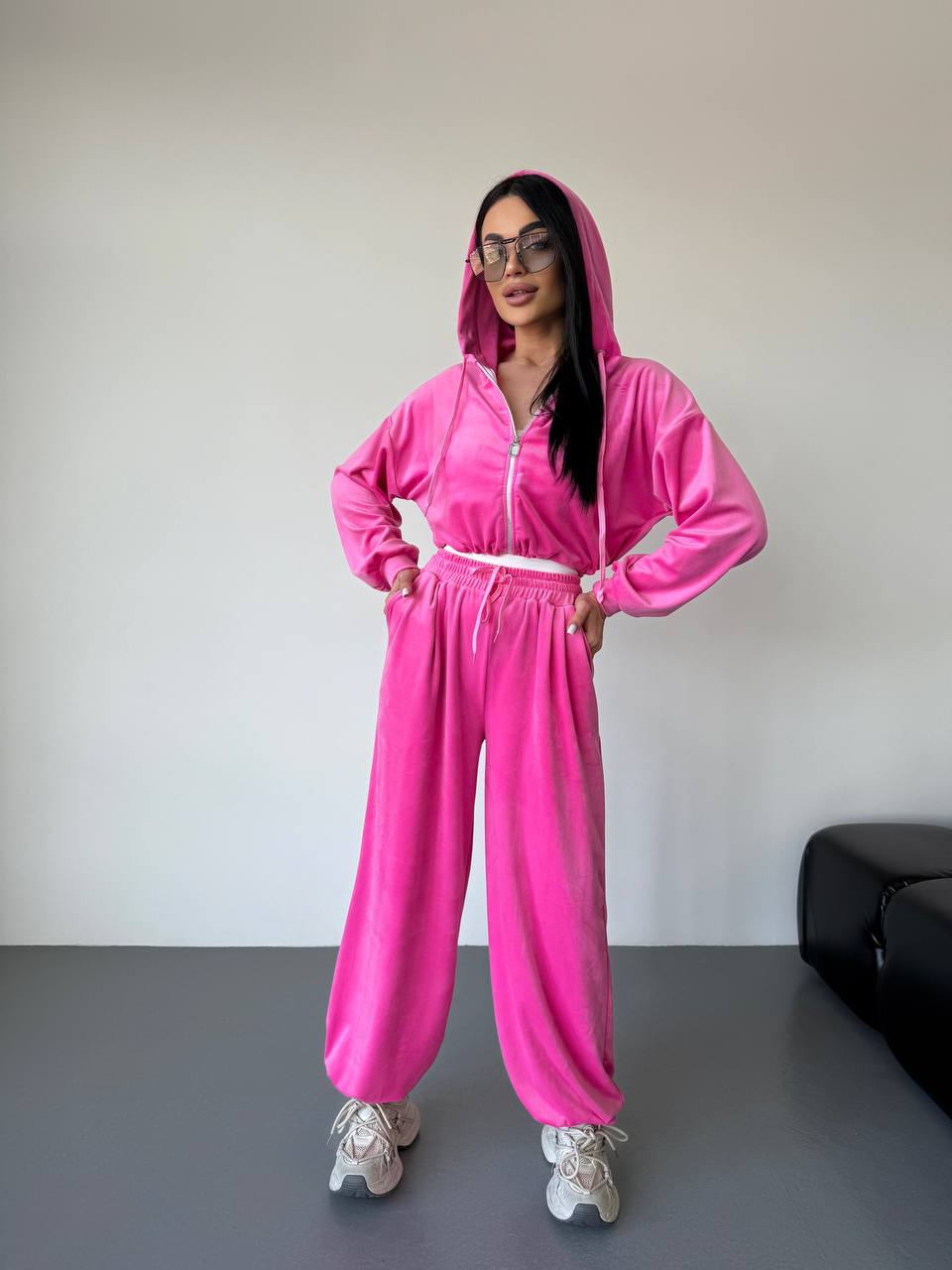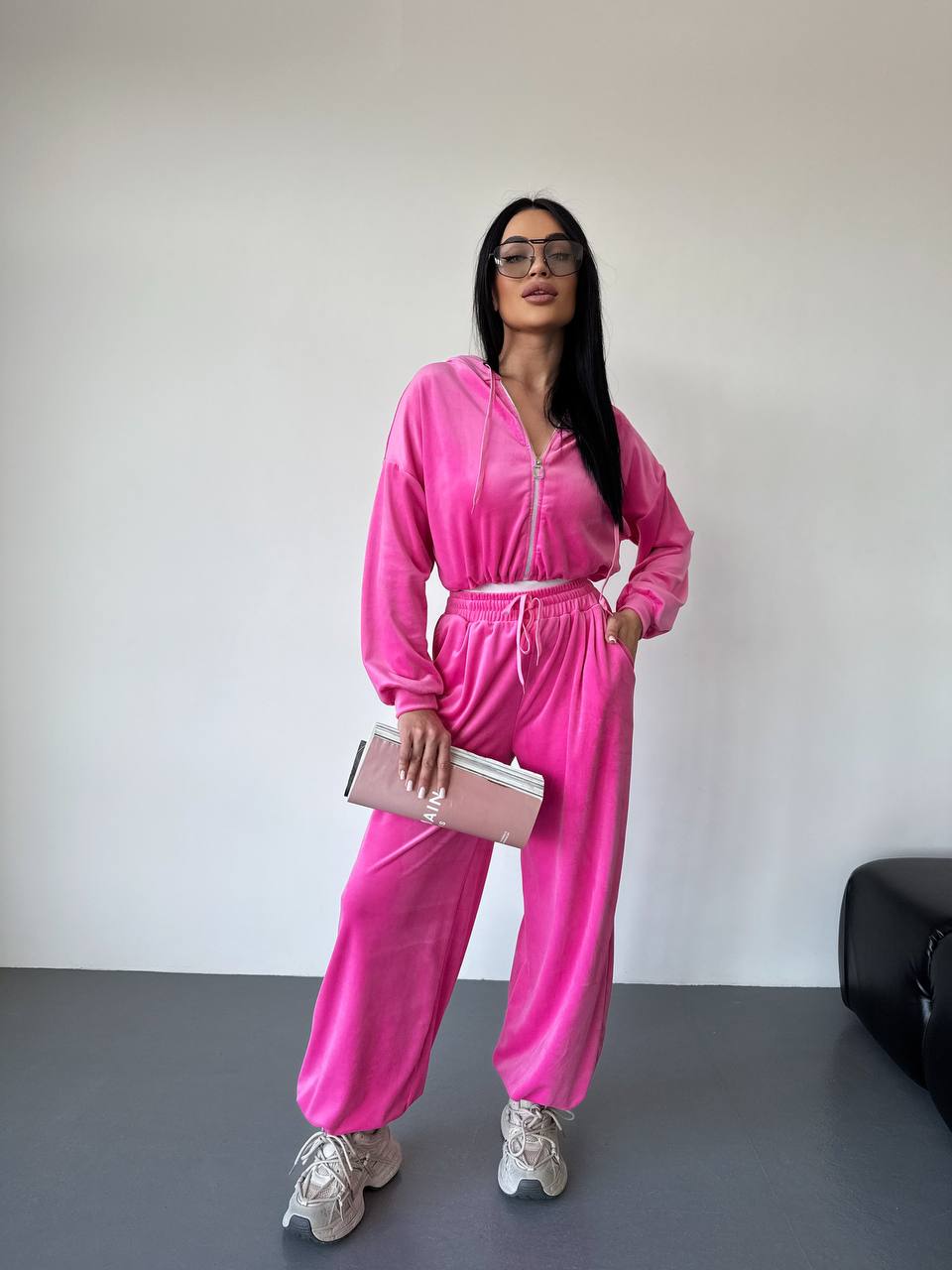 Женский Велюровый Розовый Костюм Свободного Кроя – Укороченная Кофта на Молнии + Широкие Штаны