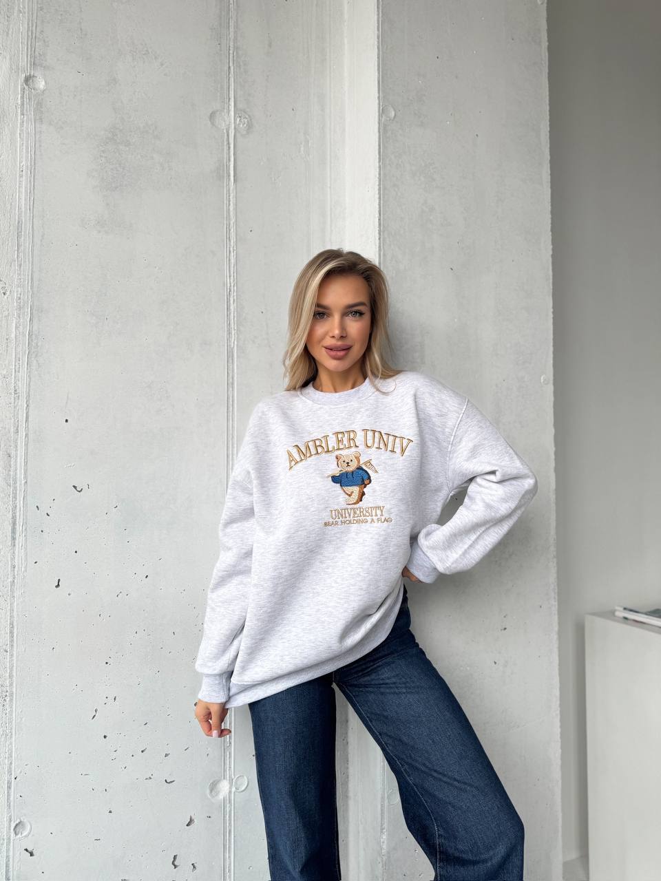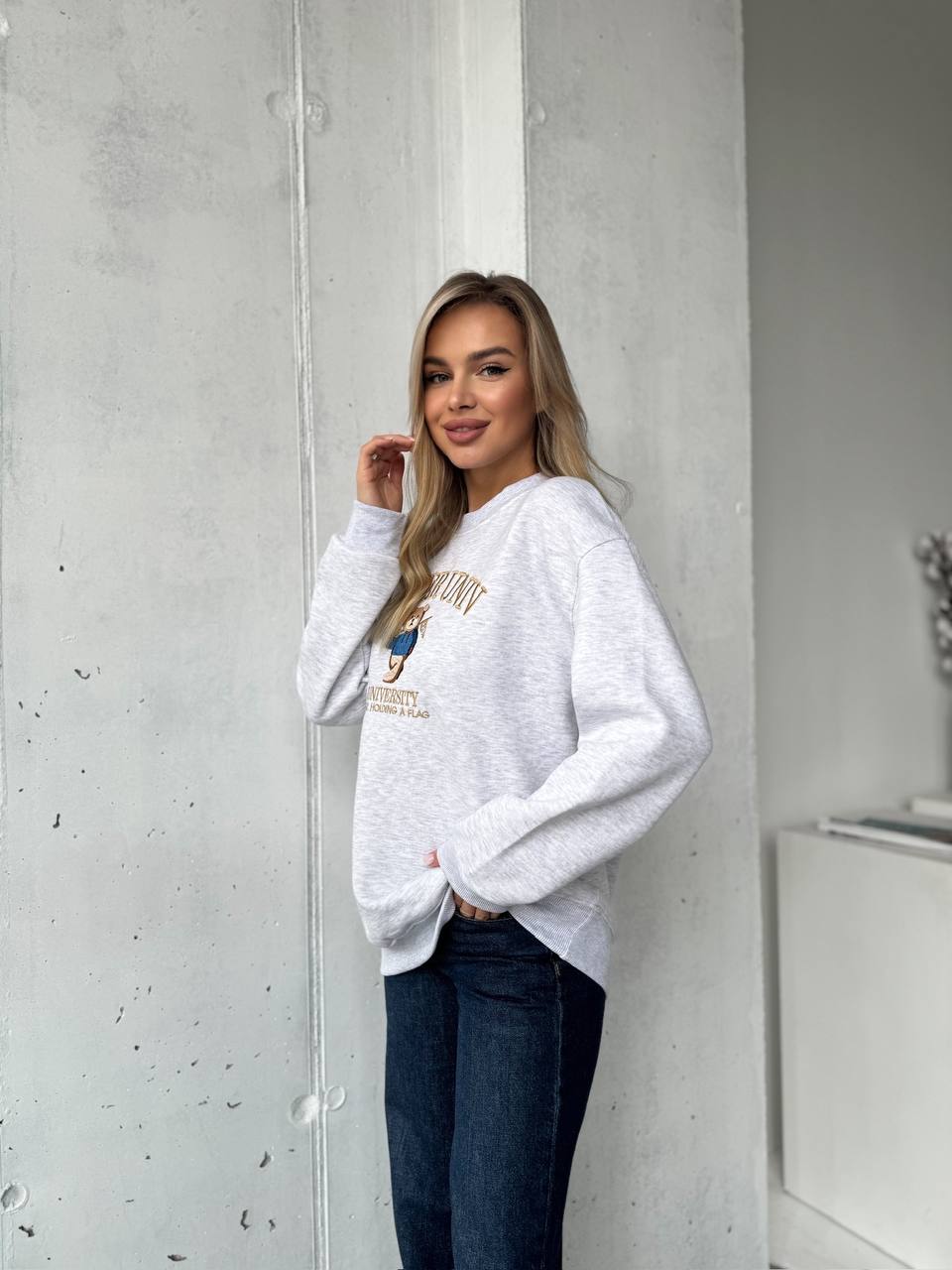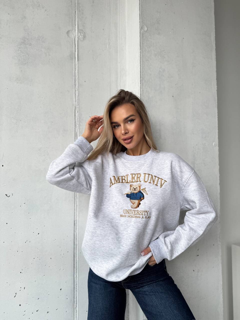 Женский Утепленный Серый Свитшот Оверсайз с Вышивкой