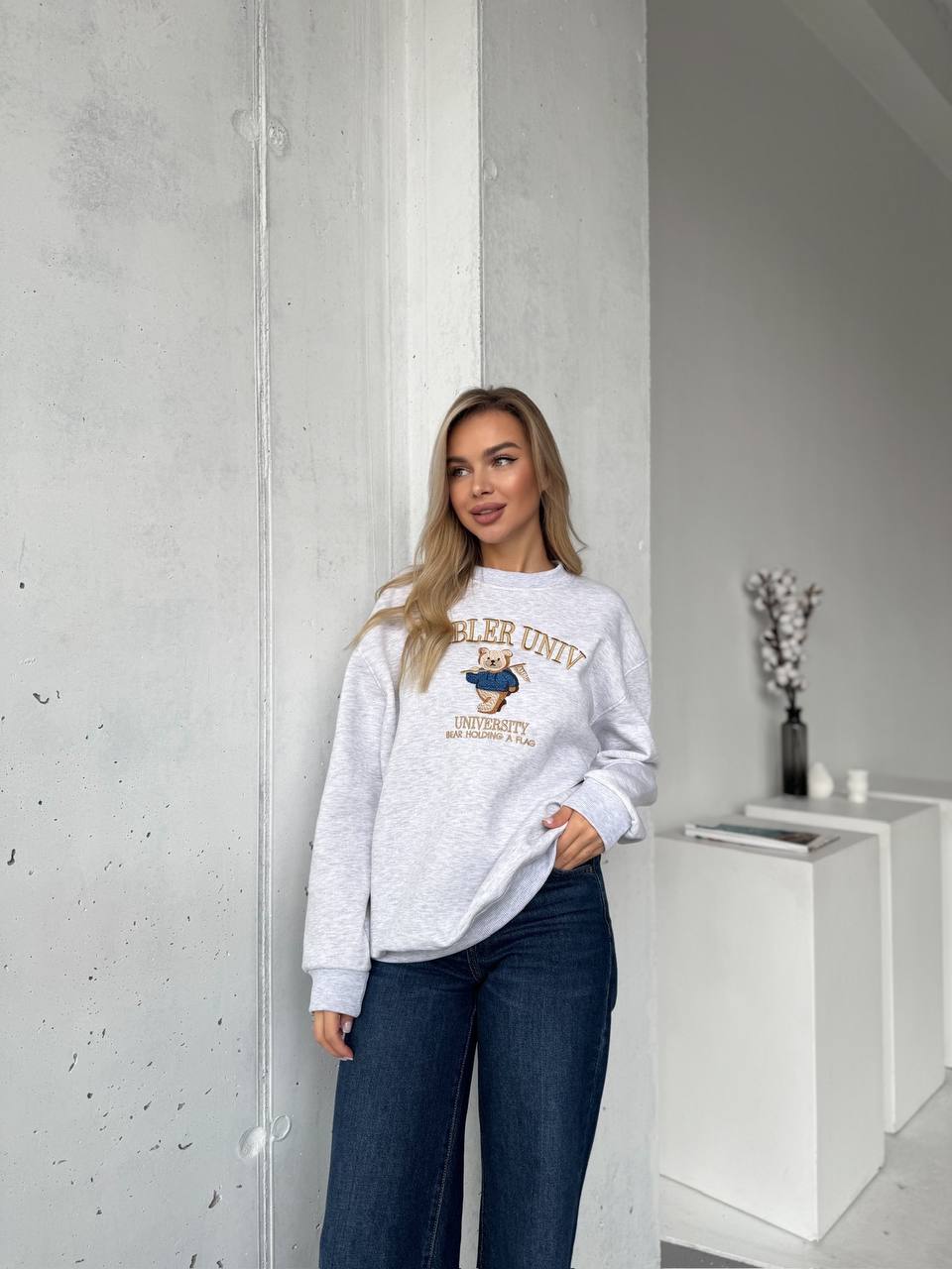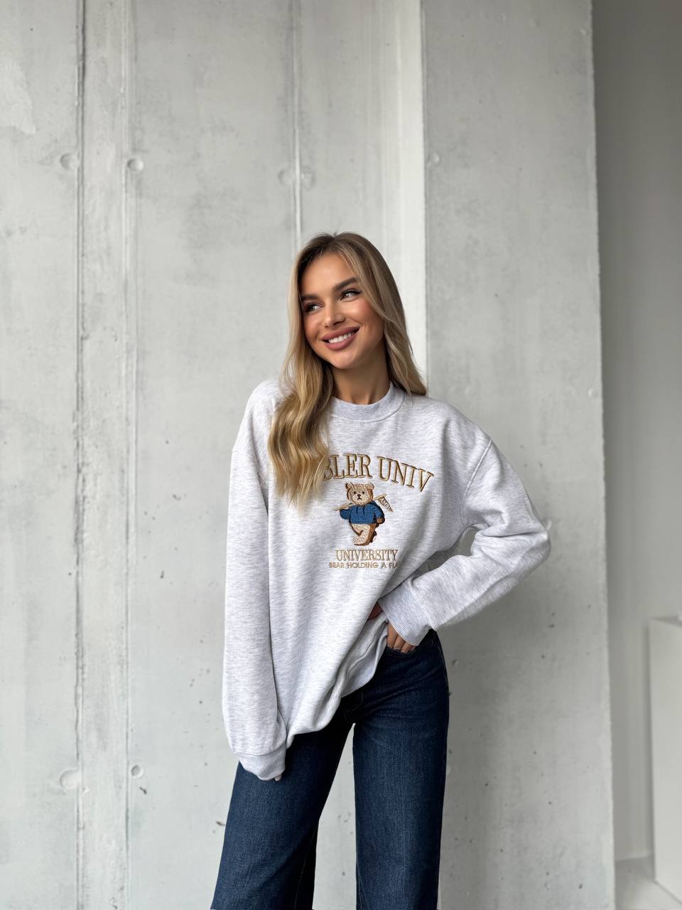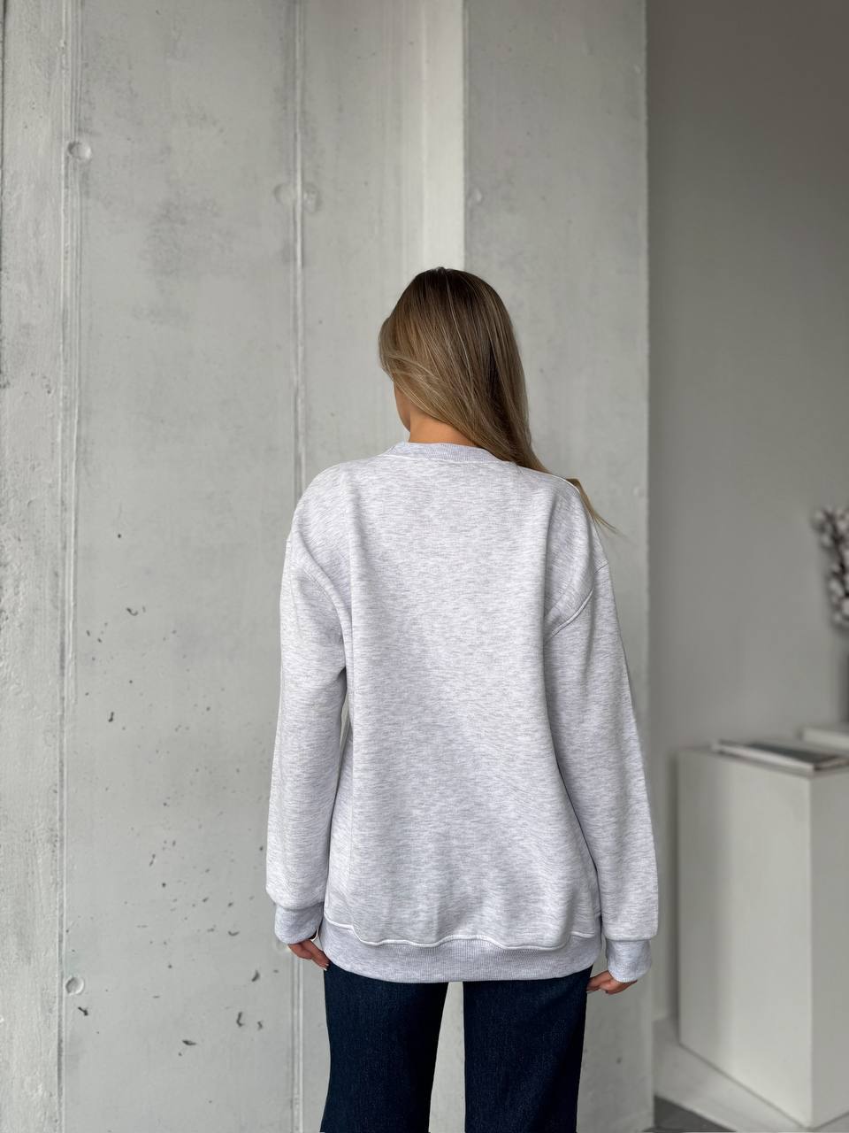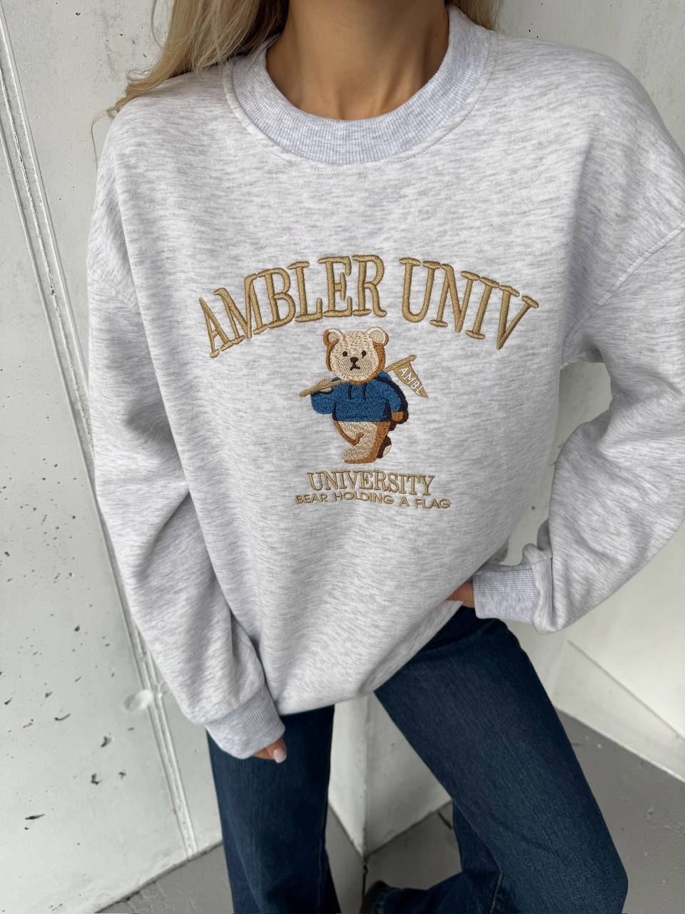 Женский Утепленный Серый Свитшот Оверсайз с Вышивкой